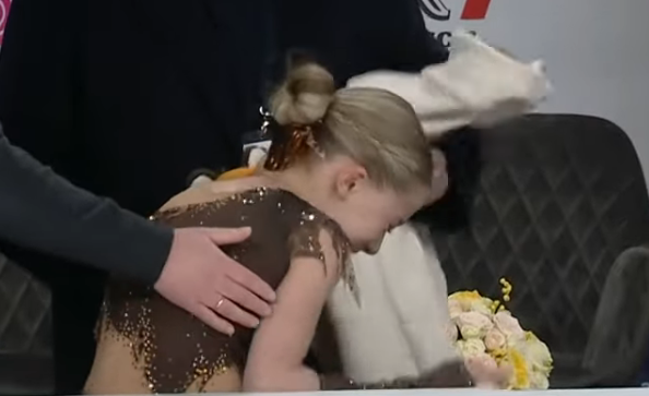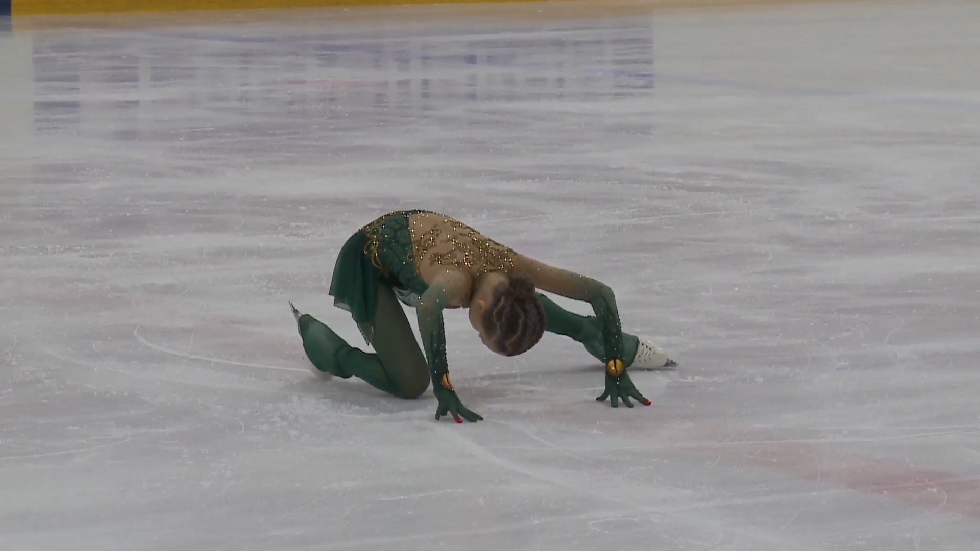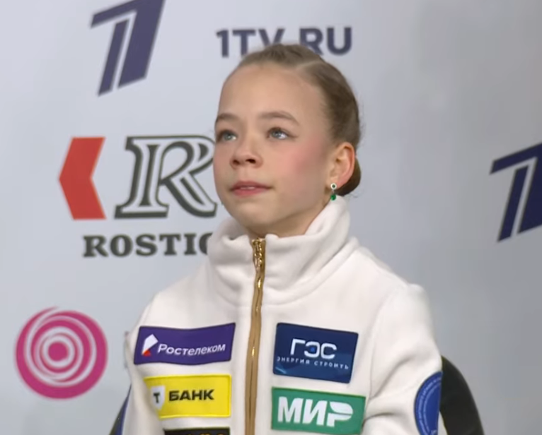 Анастасия Вячеславовна ГОШМЕР Хабаровский край, ЧУ СШ ФКК "Пируэт" белая с надписью "Хабаровск" золотом на спине 2a в хв 3sq fall (3s fall) 2a2t в хв 3s fall +combo stsq1 "unstoppable" спотыкается после твизлов ccosp4 (дикторша говорит просто "комбинированное вращение")