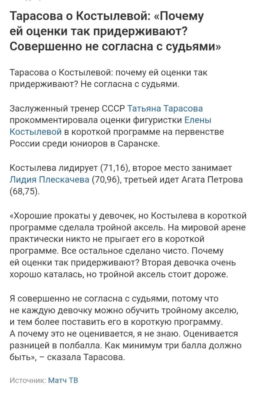 >Я ни кому не рассказывала. >Но на прошлой России, происходило то-же самое. >Но от спортсменки нашей группы. Она ни на что не претендовала, как Лена. А просто мешала Лене заходить на прыжки. Даже Плющенко закричал ей что она совсем ох.... ла😱 Перехала Лене Квад сальхов и триксель в прокате. Девочка эта из бедной семьи и очень любит деньги и подарки🤣 А самое страшное, любыми путями хочет зацепиться в ФК и ШоУ. Хотя здоровье уже по-глупости оставила.