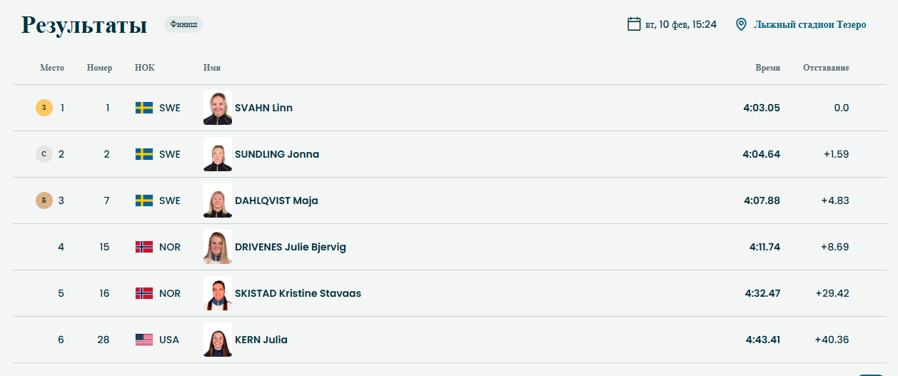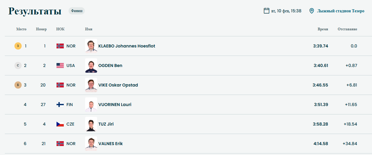 Савелий Коростылёв, скиатлон - 4-е место классический спринт - 35-е место (не прошёл квалификацию) четырёхкратный чемпион России (2024, 2025), обладатель Кубка России — 2024/2025, многократный победитель и призёр этапов Кубка России
