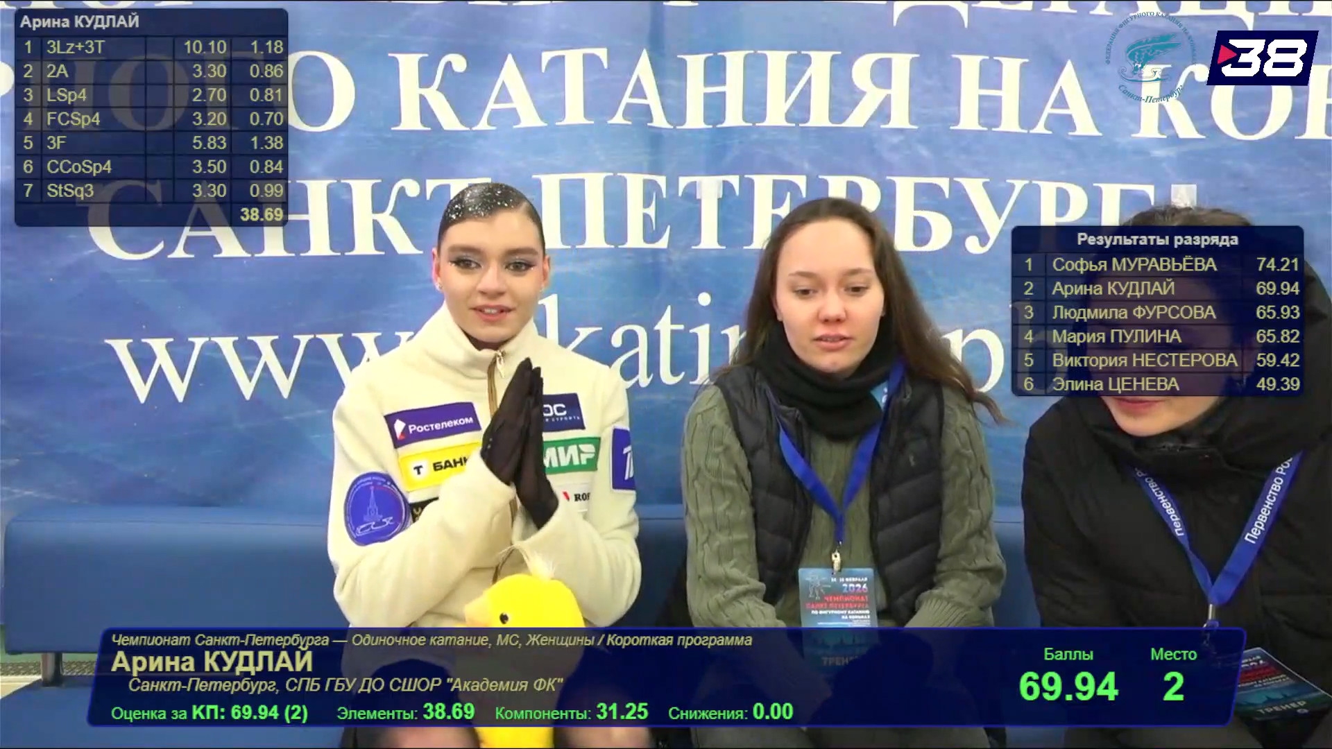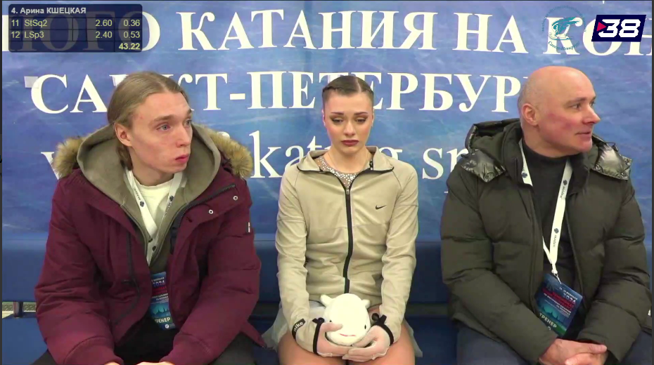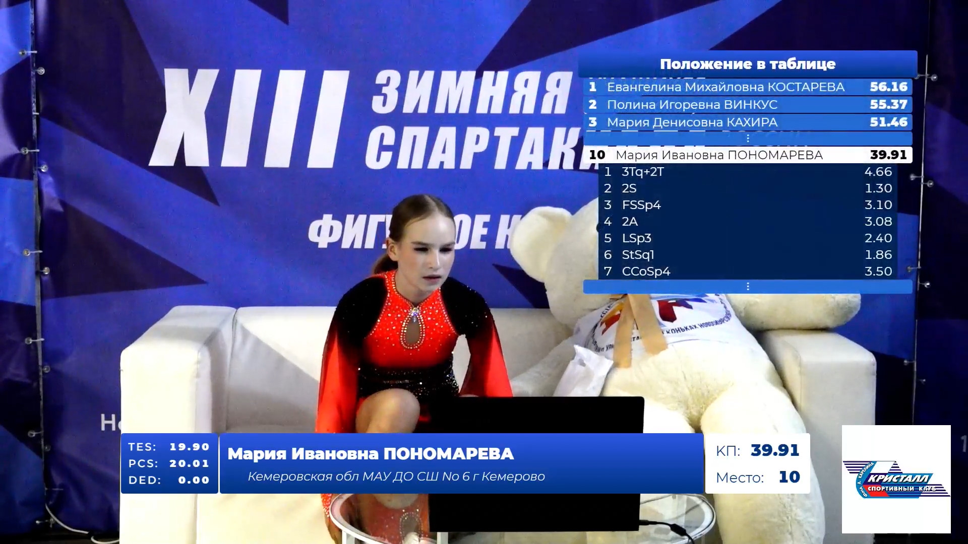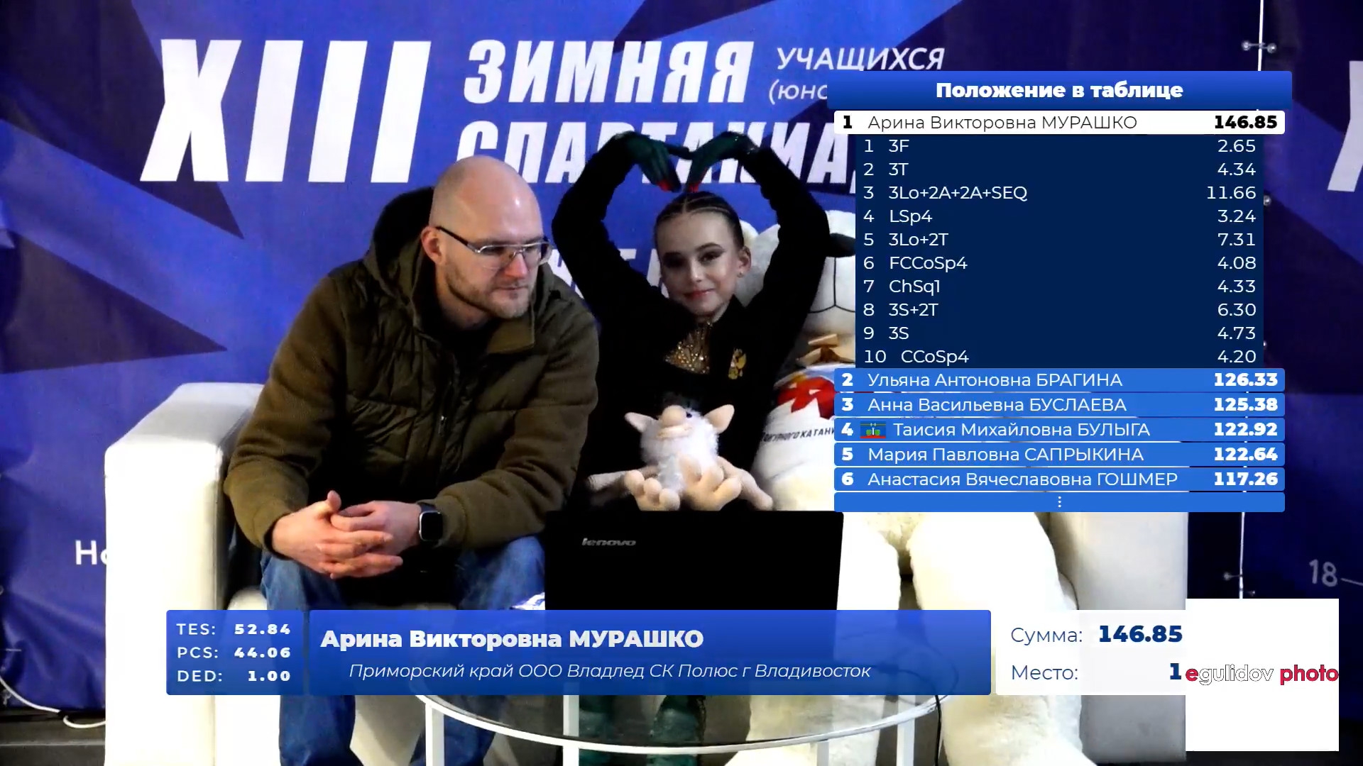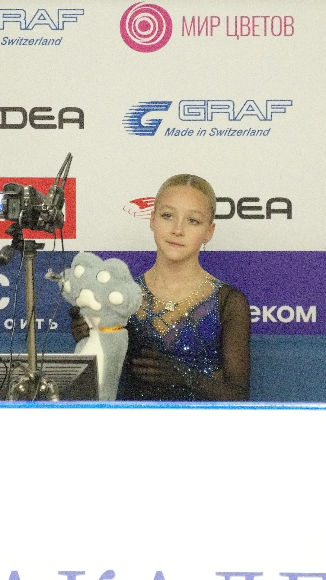 Арина Викторовна МУРАШКО, Хромов Е.О. Приморский край ООО Владлед СК Полюс г Владивосток самая красивая тут >Выдумали, меня для тебя выдумали 2a бежит на зубчиках 3f в тройку (R) 3r2t stsq2 катает с открытым ртом, периодически высовывая язык, посылает воздушный поцелуй судьям легла на лёд, камера это показала с очень неудачного ракурса в кике обняла медведя, рассматривает подарки в пакетике и опять лежит с медведем, посылает сердечки и franko kissko зрителям