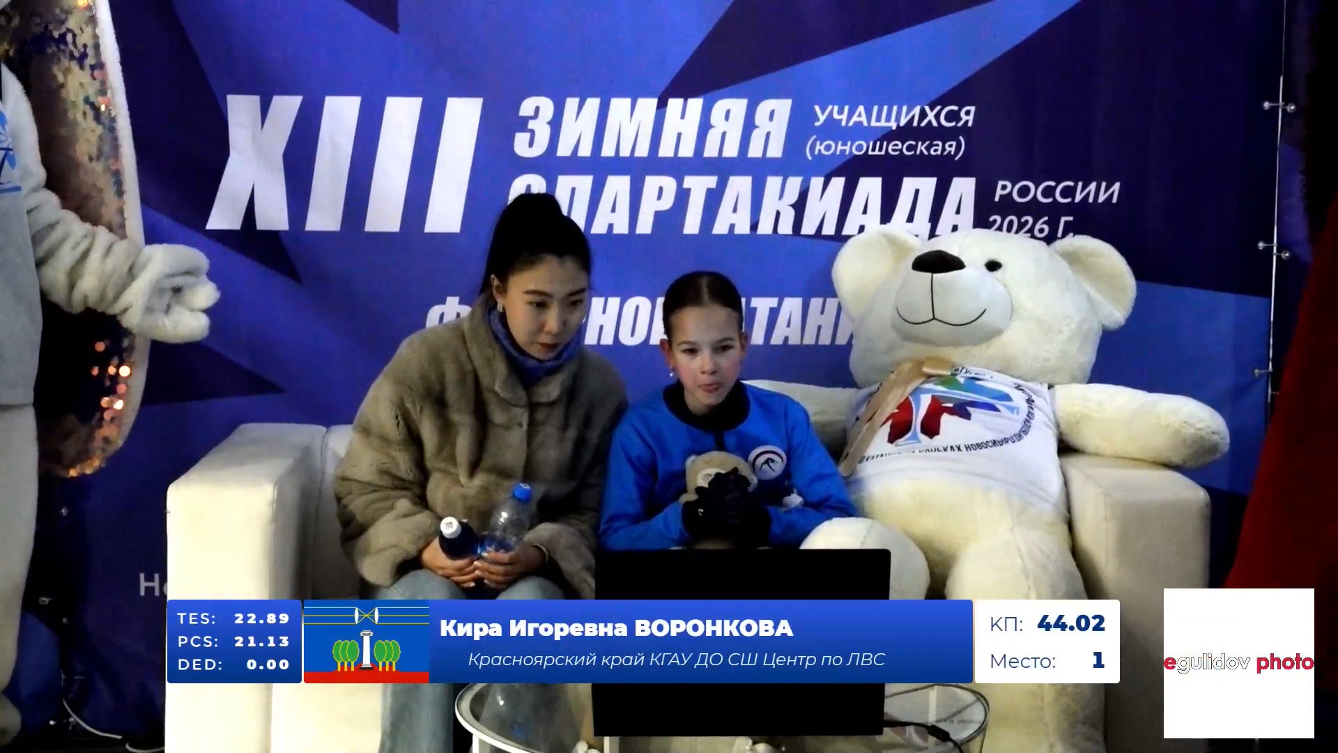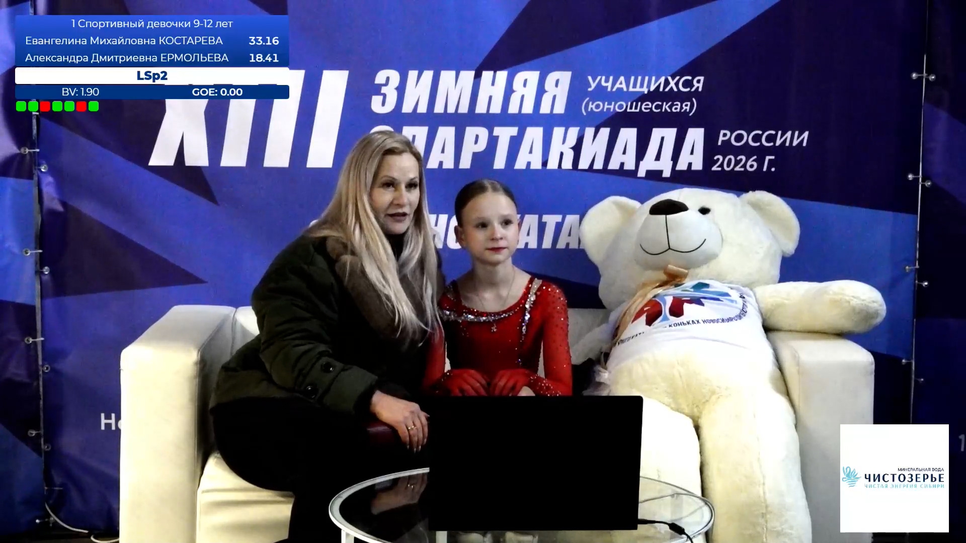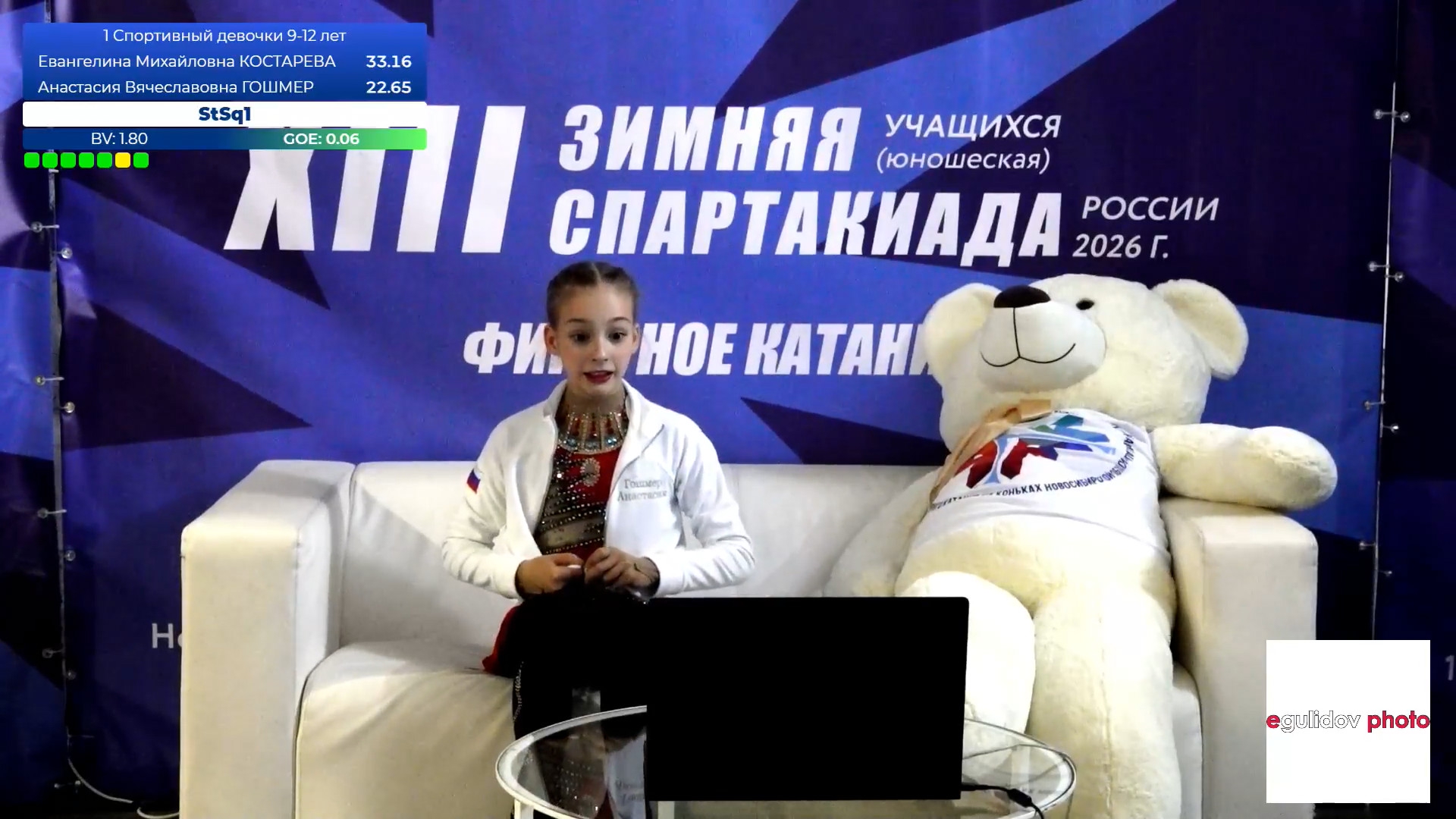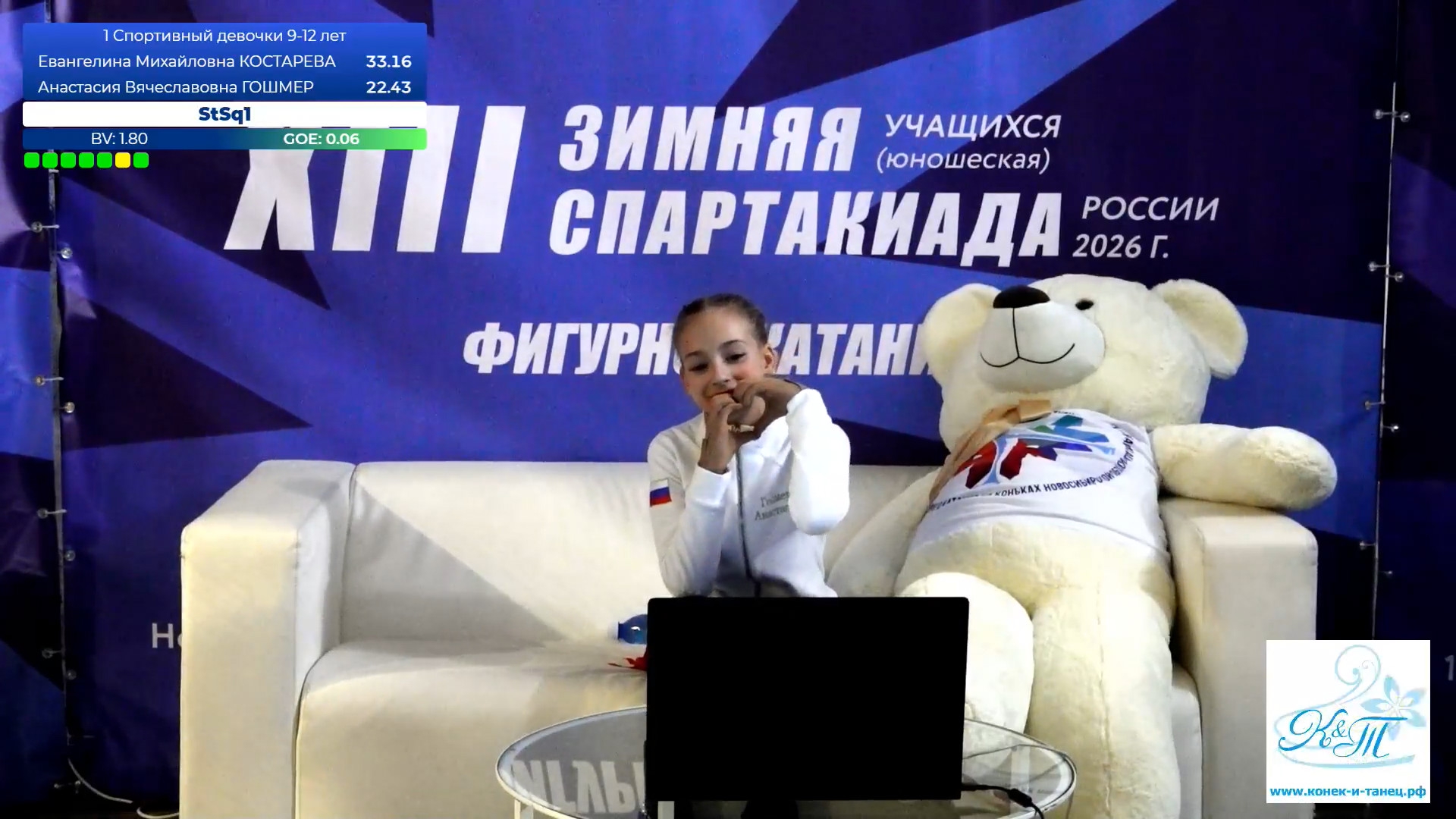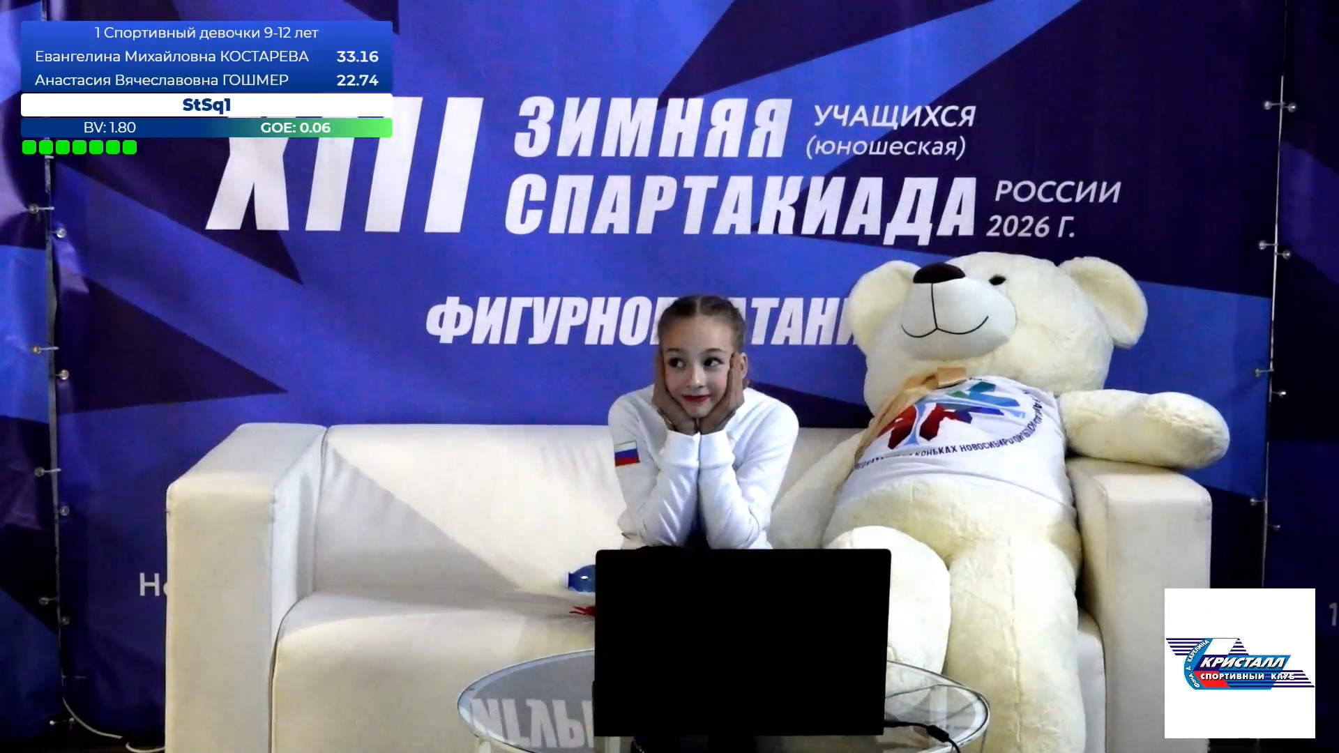 Арина Викторовна МУРАШКО, Хромов Е.О. Приморский край ООО Владлед СК Полюс г Владивосток самая красивая тут >Выдумали, меня для тебя выдумали 2a бежит на зубчиках 3f в тройку (R) 3r2t stsq2 катает с открытым ртом, периодически высовывая язык, посылает воздушный поцелуй судьям легла на лёд, камера это показала с очень неудачного ракурса в кике обняла медведя, рассматривает подарки в пакетике и опять лежит с медведем, посылает сердечки и franko kissko зрителям