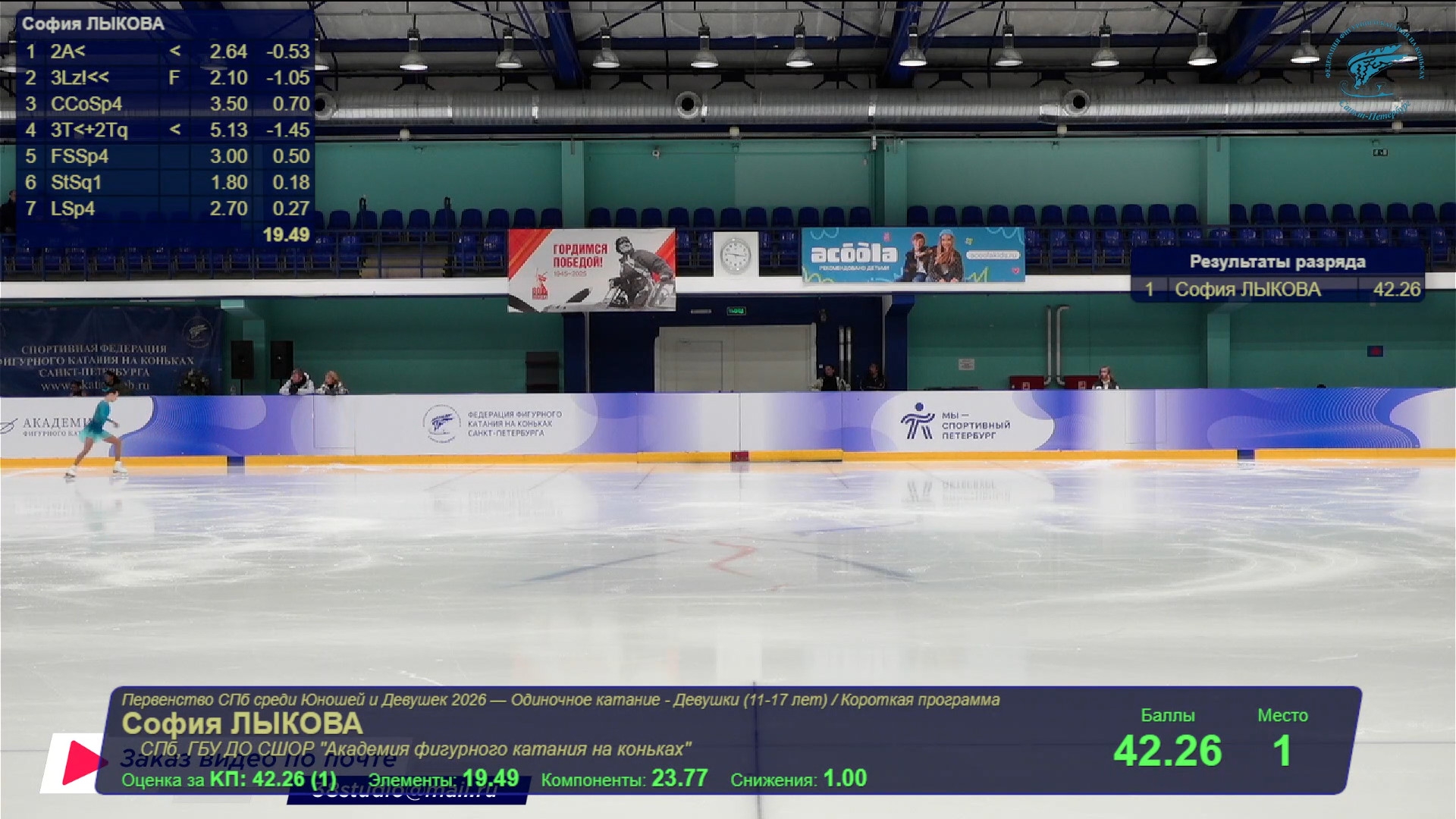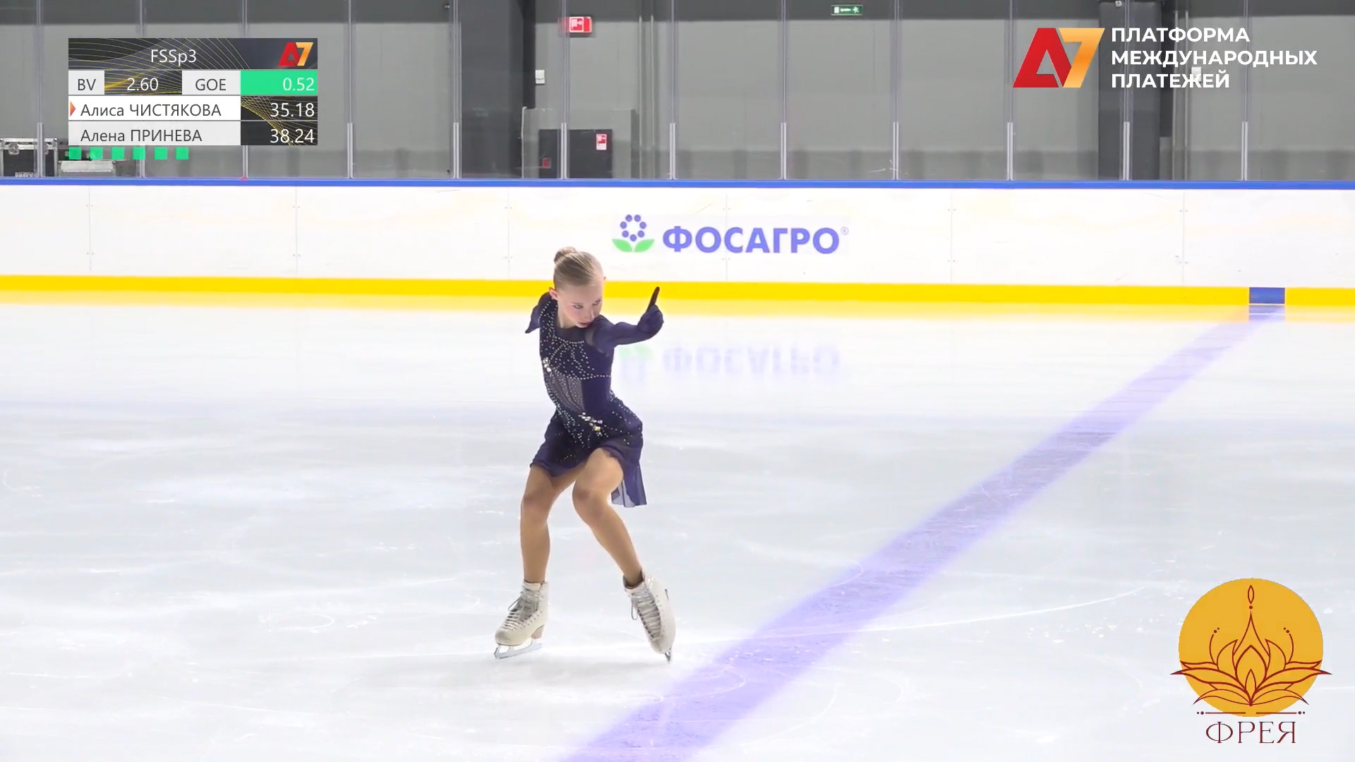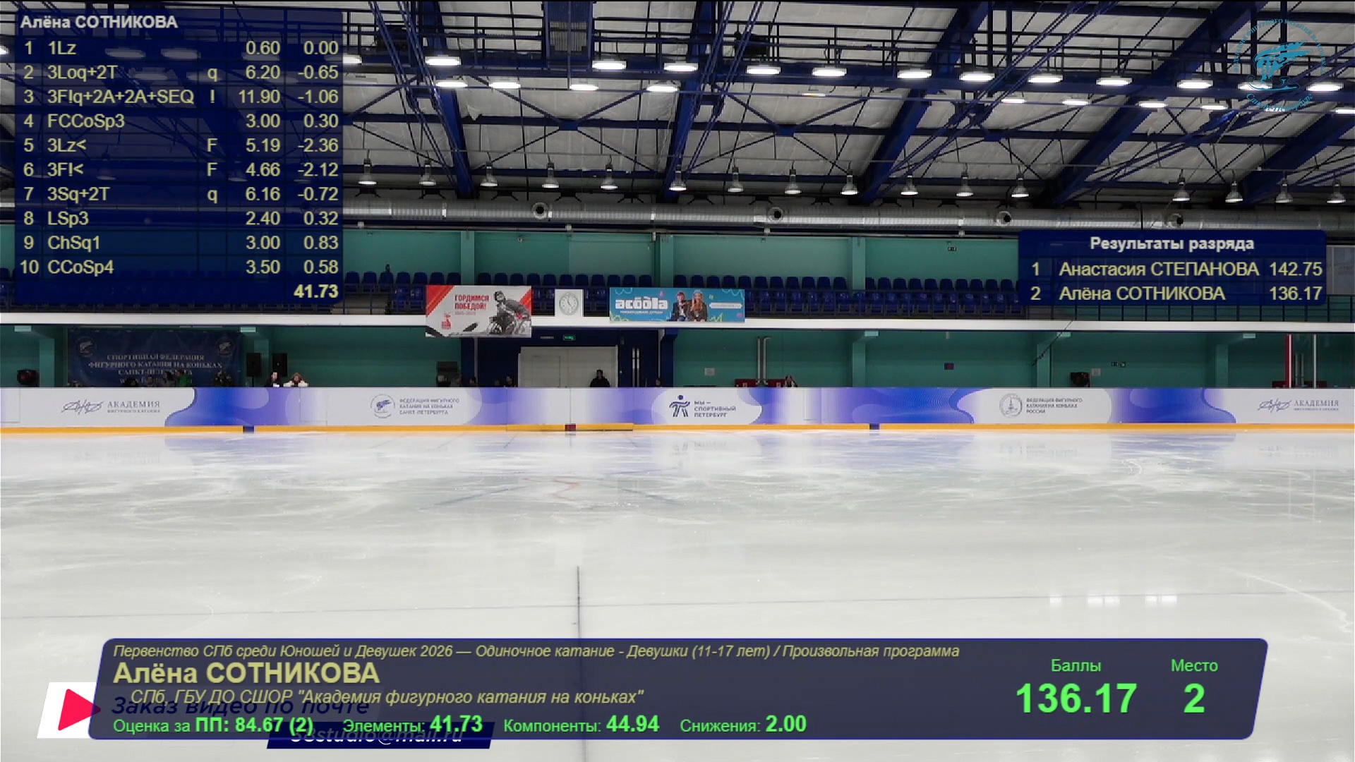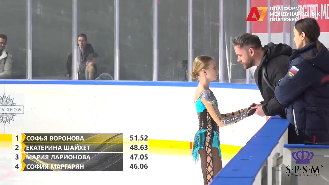 Алёна Викторовна СОТНИКОВА, 14 лет (2011-10-18) СПб, ГБУ ДО СШОР "Академия фигурного катания на коньках" 3z<< на ход вперёд so (R) 3r3t< (<<?) fall (R) 2a с маха и бауэра stsq3