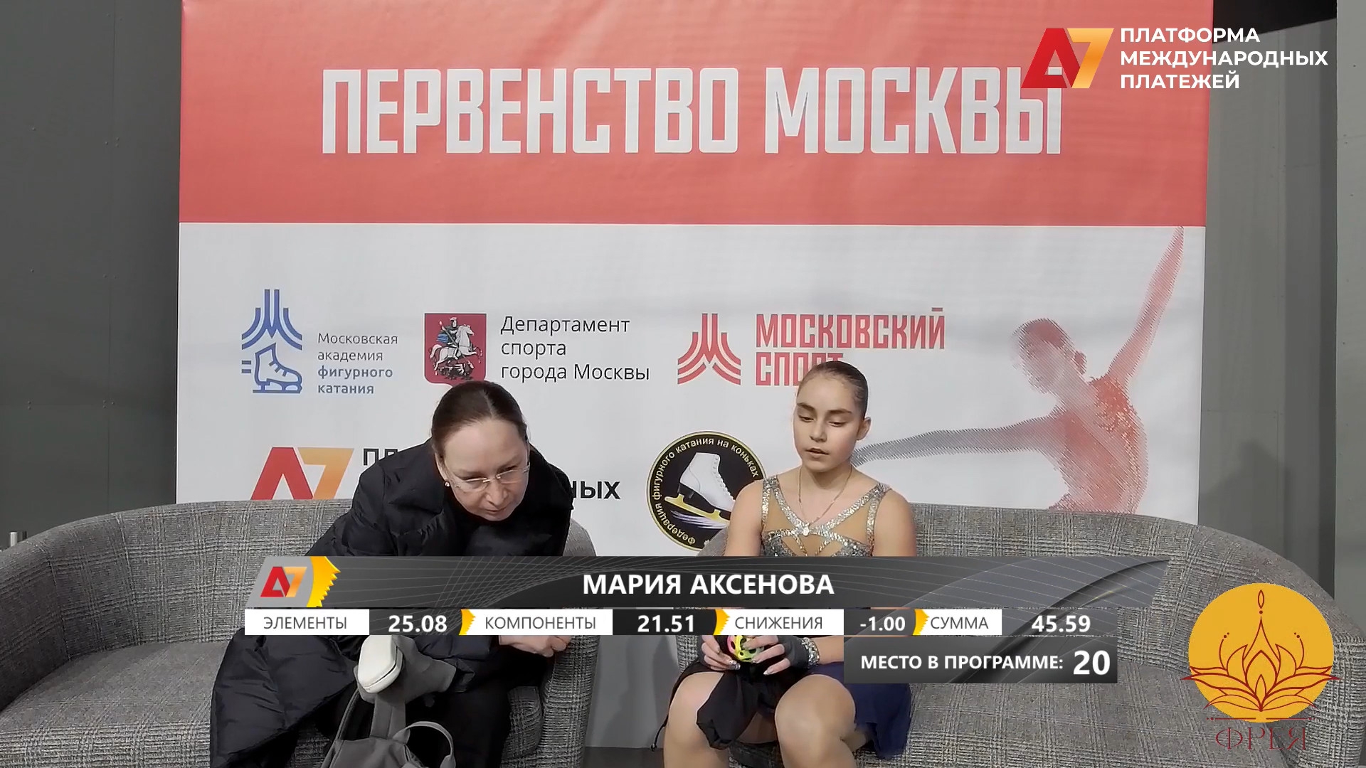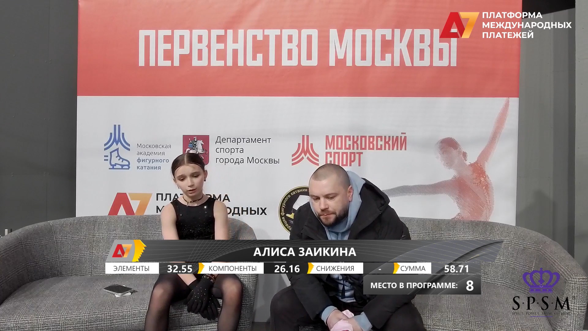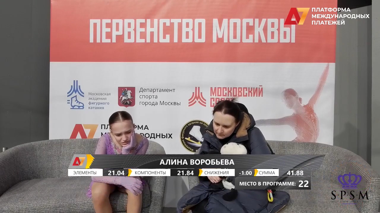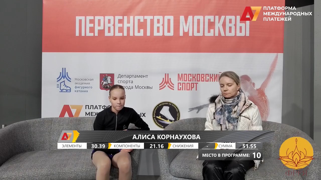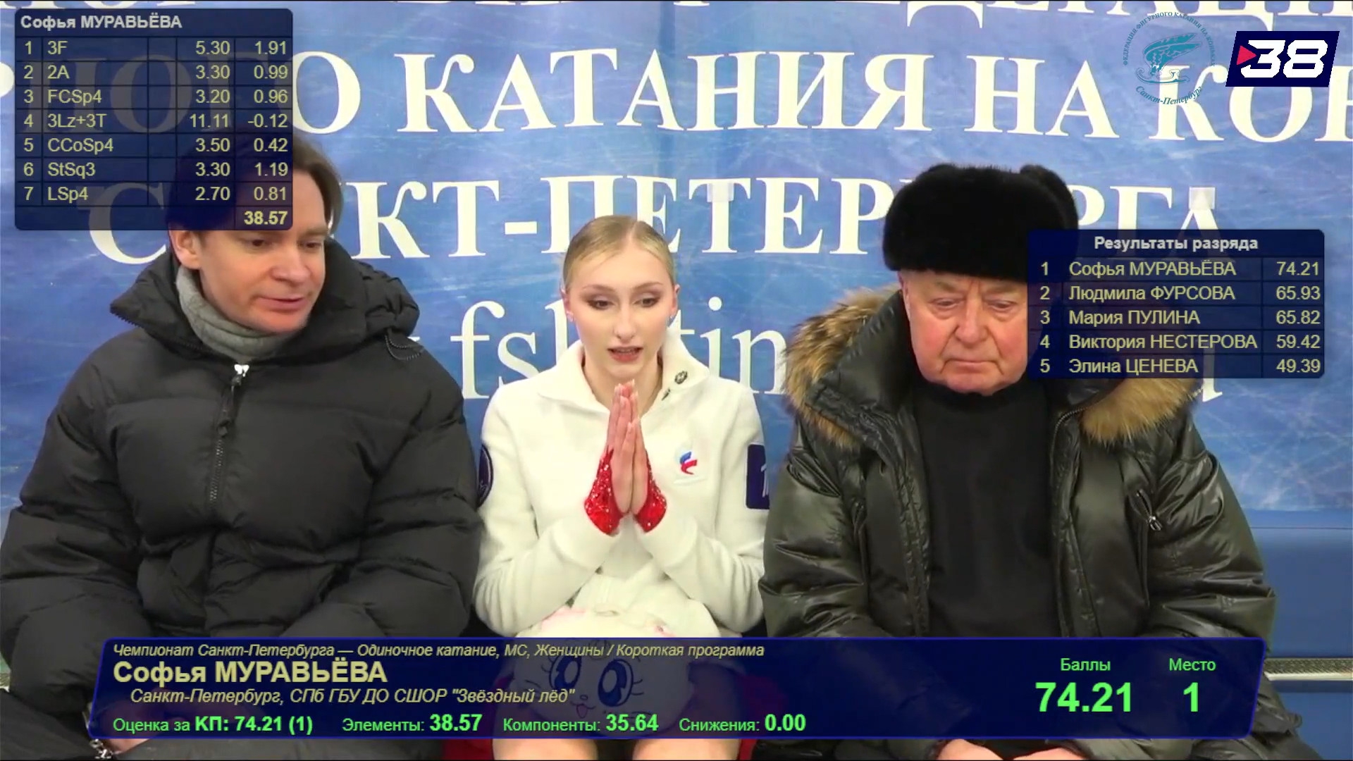 Алёна Викторовна СОТНИКОВА, 14 лет (2011-10-18) СПб, ГБУ ДО СШОР "Академия фигурного катания на коньках" 3z<< на ход вперёд so (R) 3r3t< (<<?) fall (R) 2a с маха и бауэра stsq3