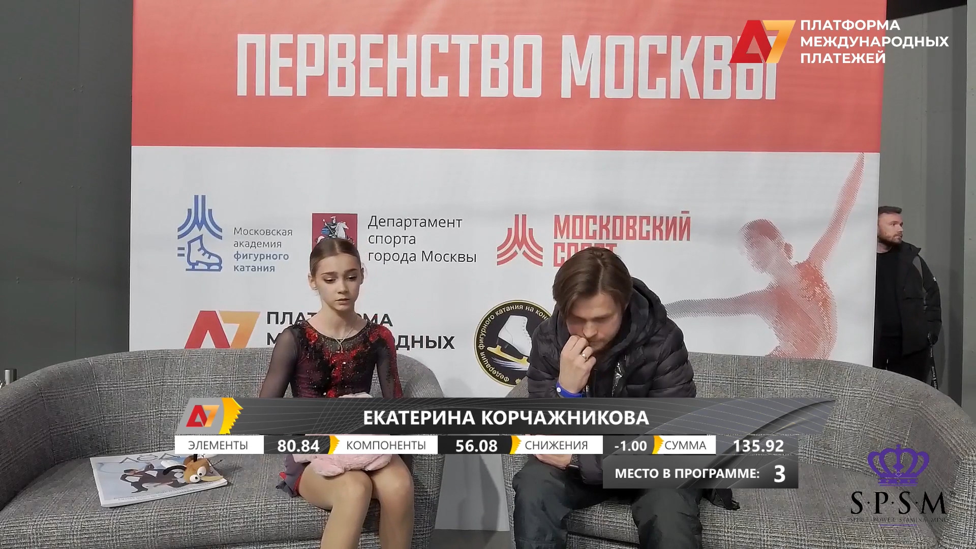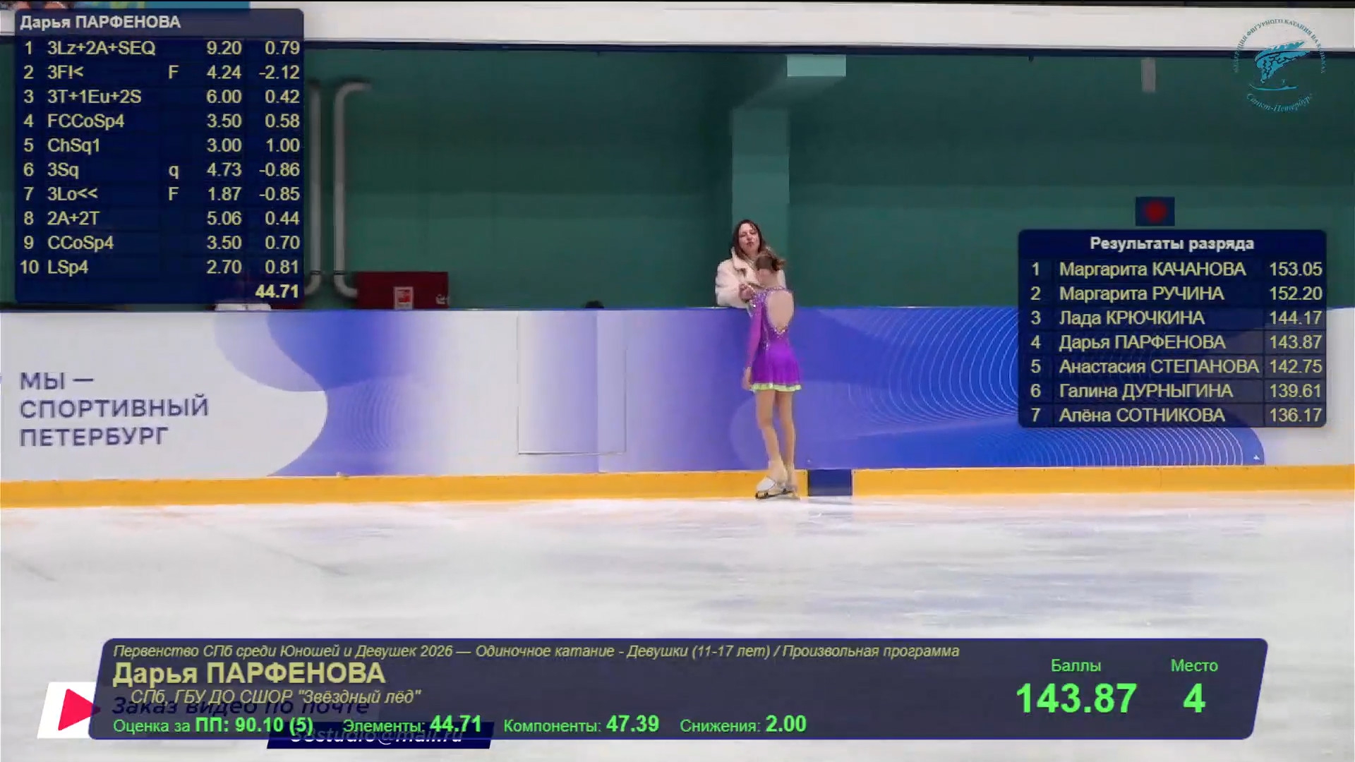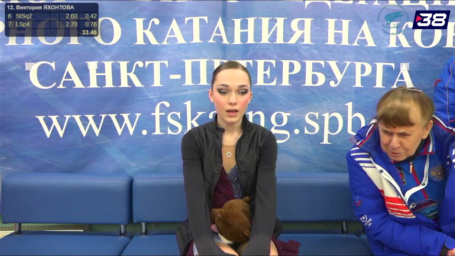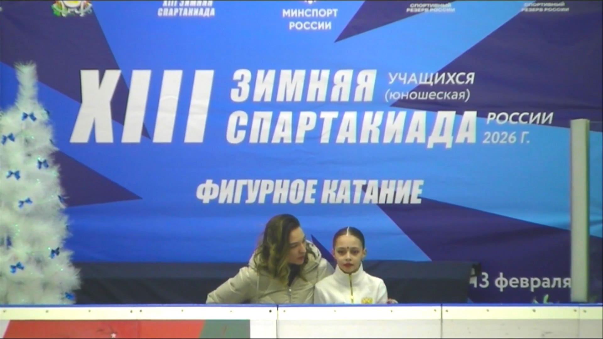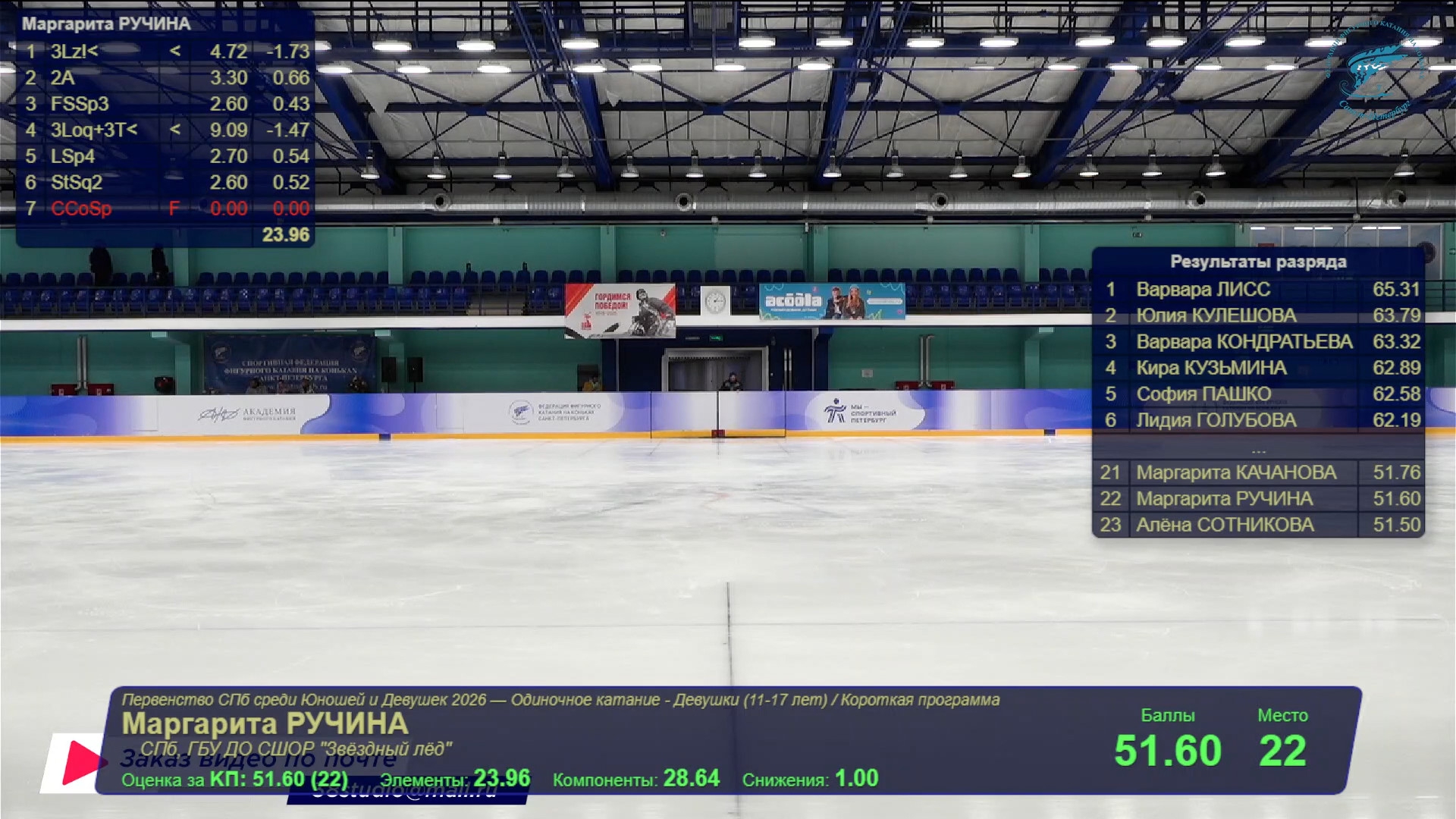 Маргарита Максимовна РУЧИНА, 14 лет (2011-10-12), с А.Ю. СПб, ГБУ ДО СШОР "Звёздный лёд" традиционно выдыхает (видать уже хлебнула из термоса А.Ю., у самой А.Ю. такой вид что она точно хлебнула) 3z< закрутило, коснулась рукой (R) 2a 3rq3t< 2 ноги (R) stsq2 села в волчок и упала при попытке из него подняться ccosp fall