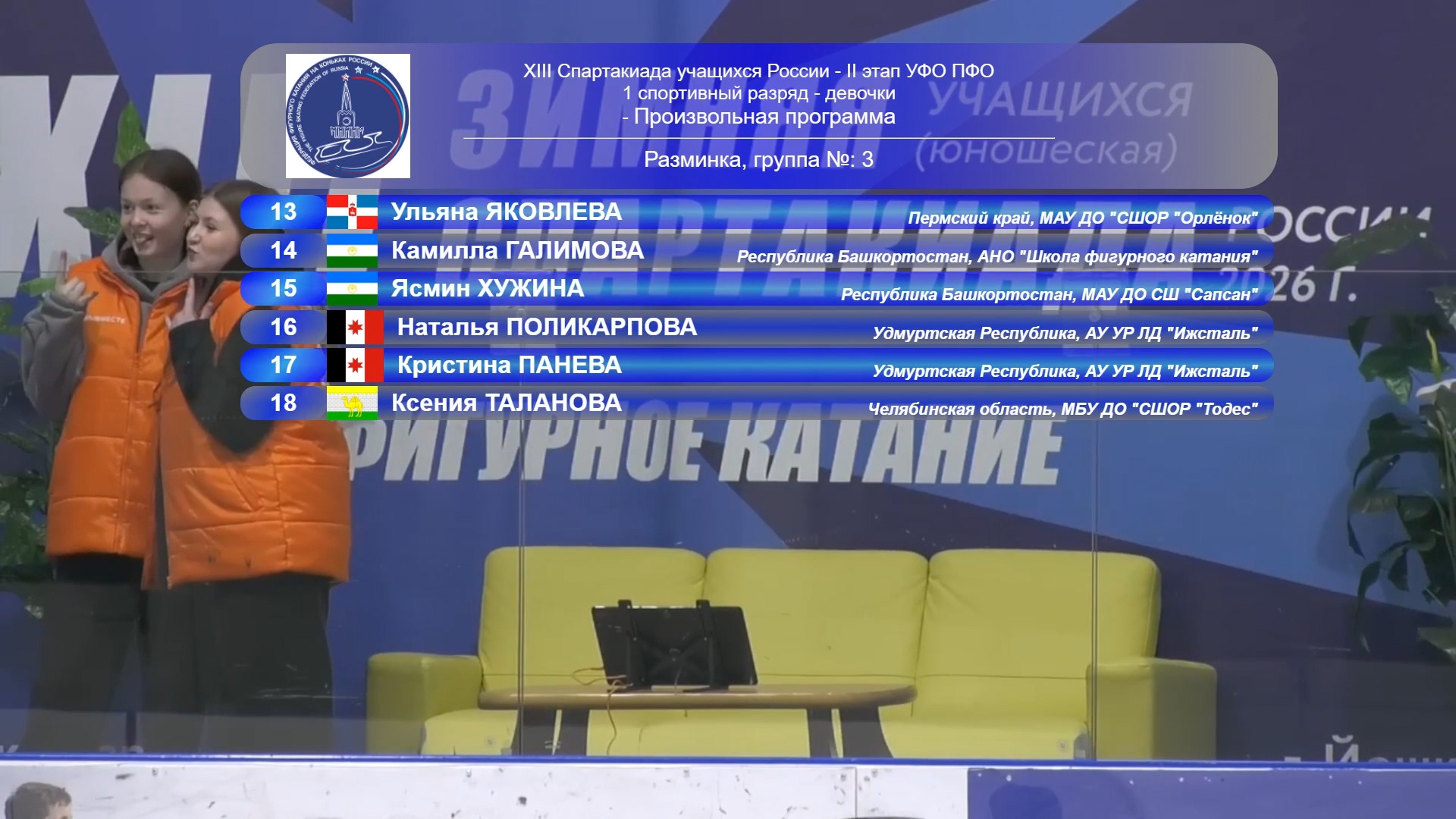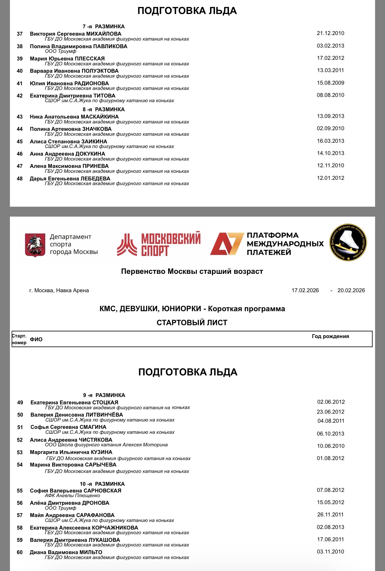 12 февраля https://vk.com/video-96031026_456239446 11.30-15.00 – девушки, ПП (подготовка льда после 3-ей разминки) 15.30 – Награждение победителей и призеров соревнований