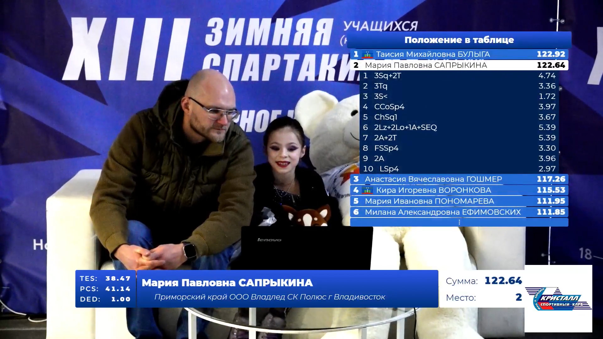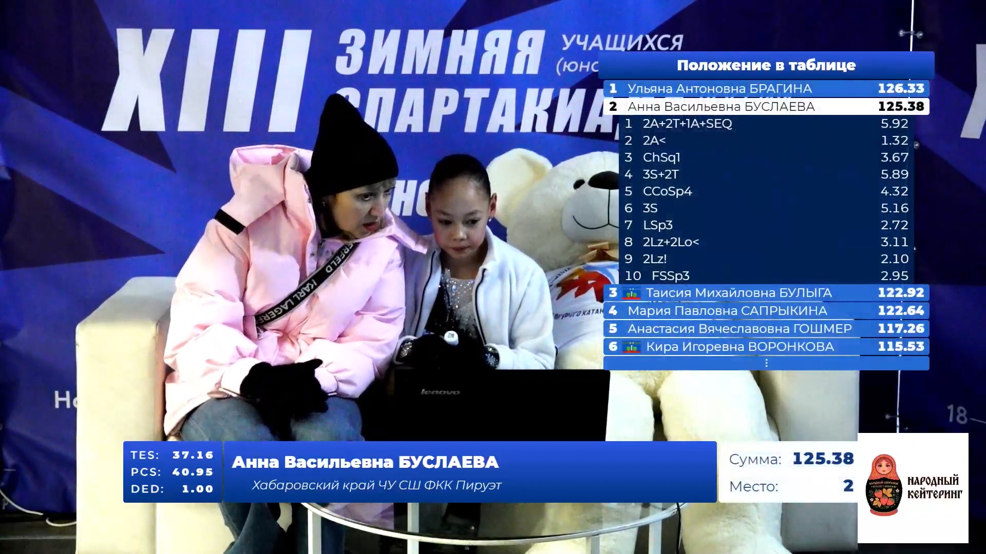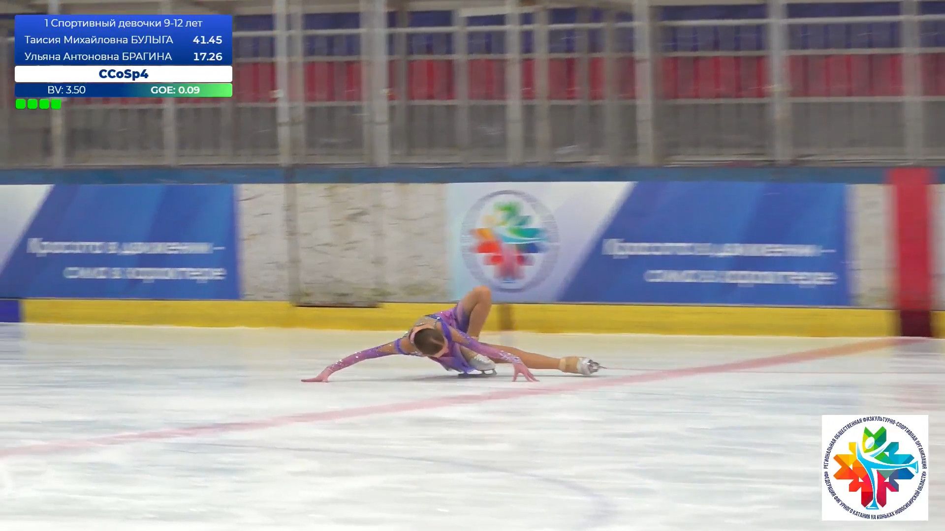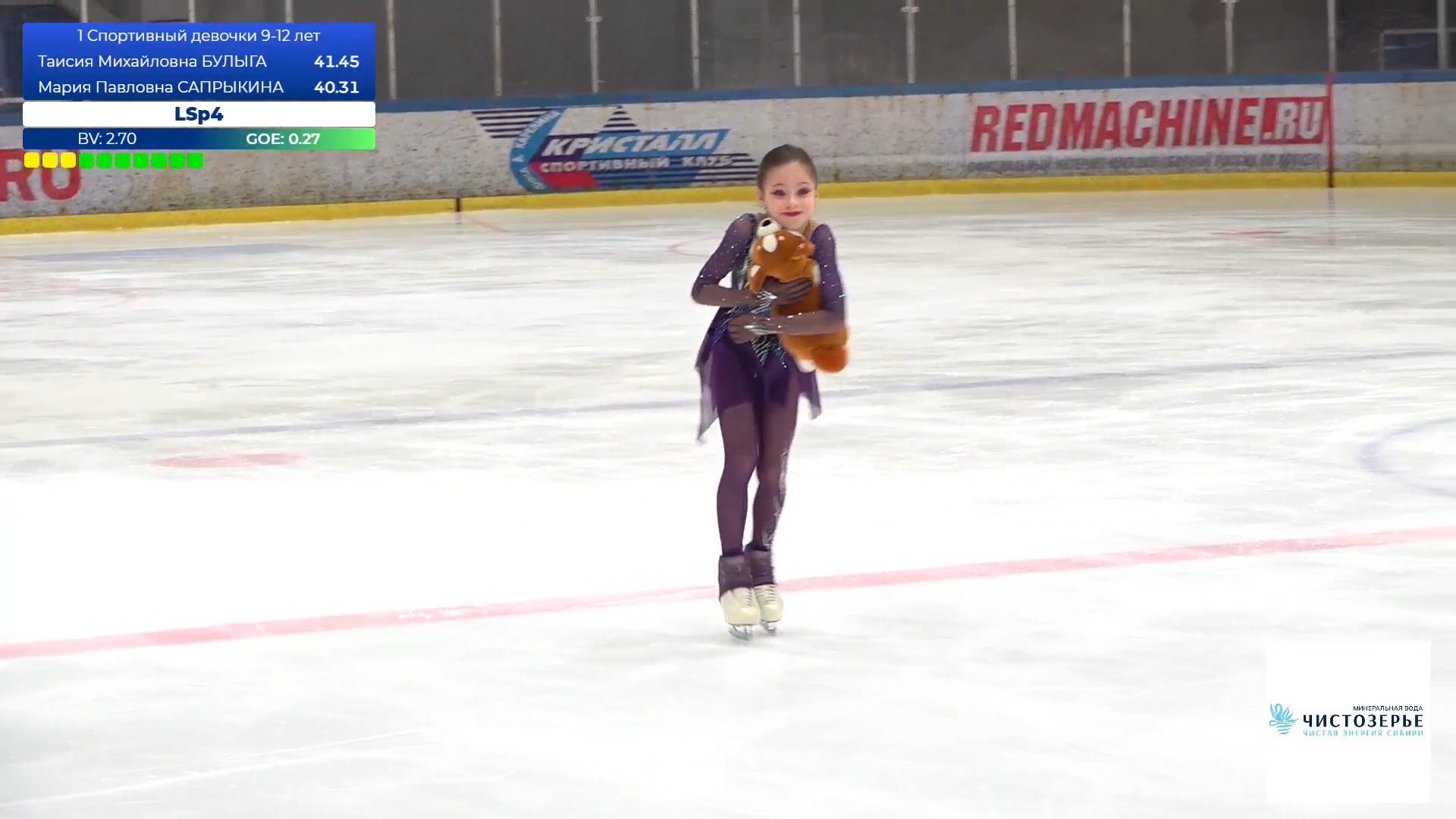 Таисия Михайловна БУЛЫГА, 13 лет, Резяпкина Н.И. Красноярский край МАУ ДО СШОР Рассвет под свист чайника 2a в подпрыжку 3r<1a (R) 3z<<?2a ho чуть клюнула (R) 3rq (R) 3z!?< (R) 2f ho 2r закрутило 1a chsq1 всё на пересмотр кроме первого акселя, chsq1 и последнего lsp4