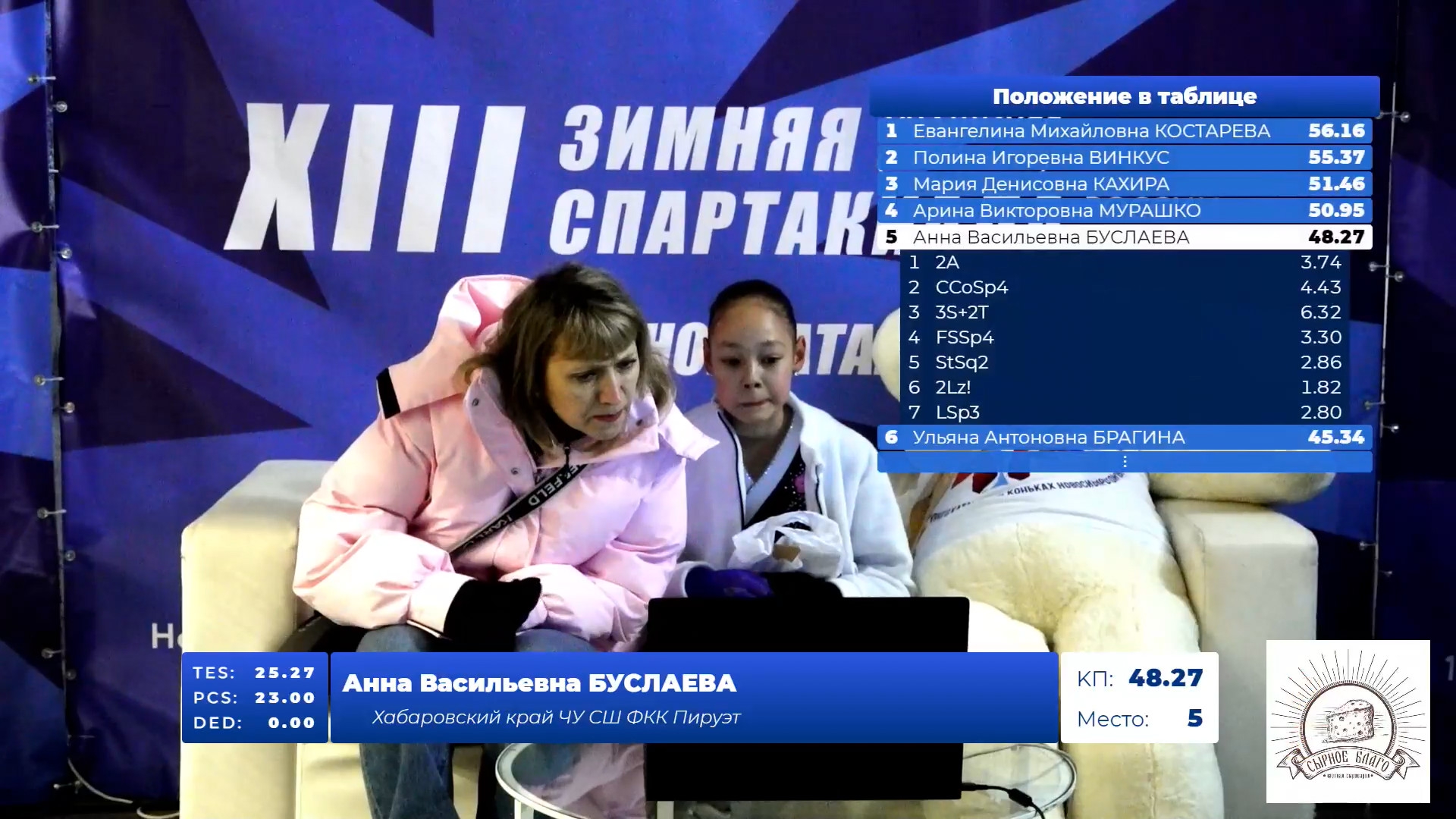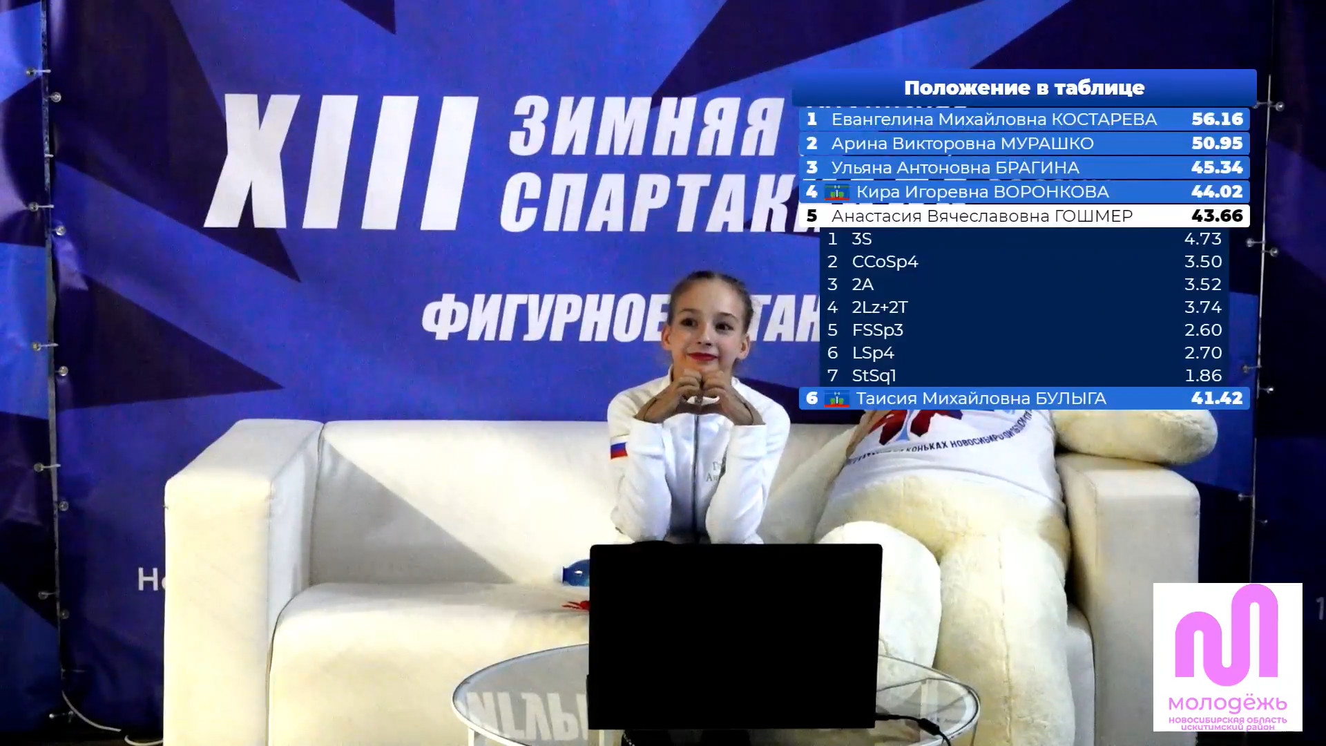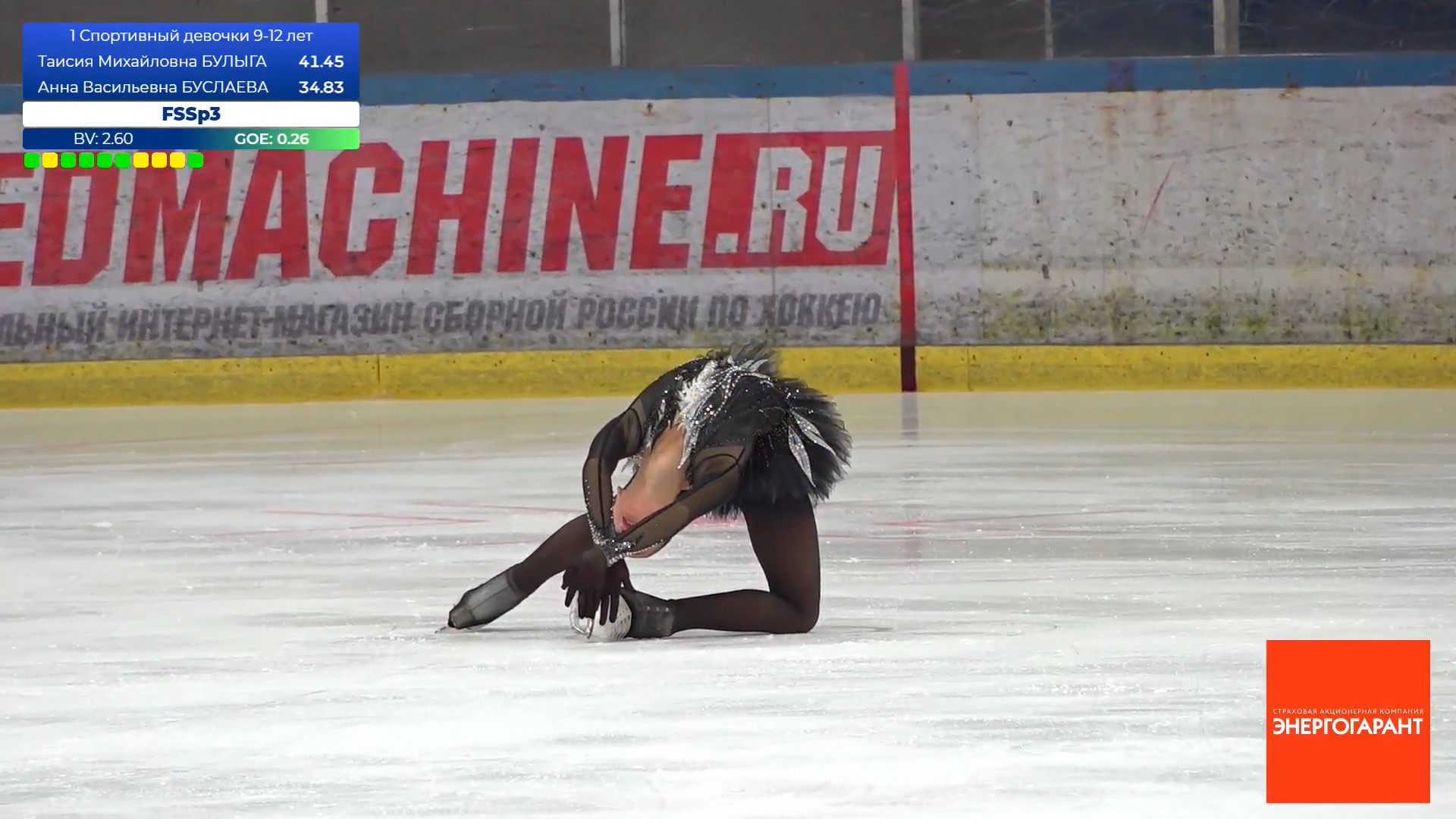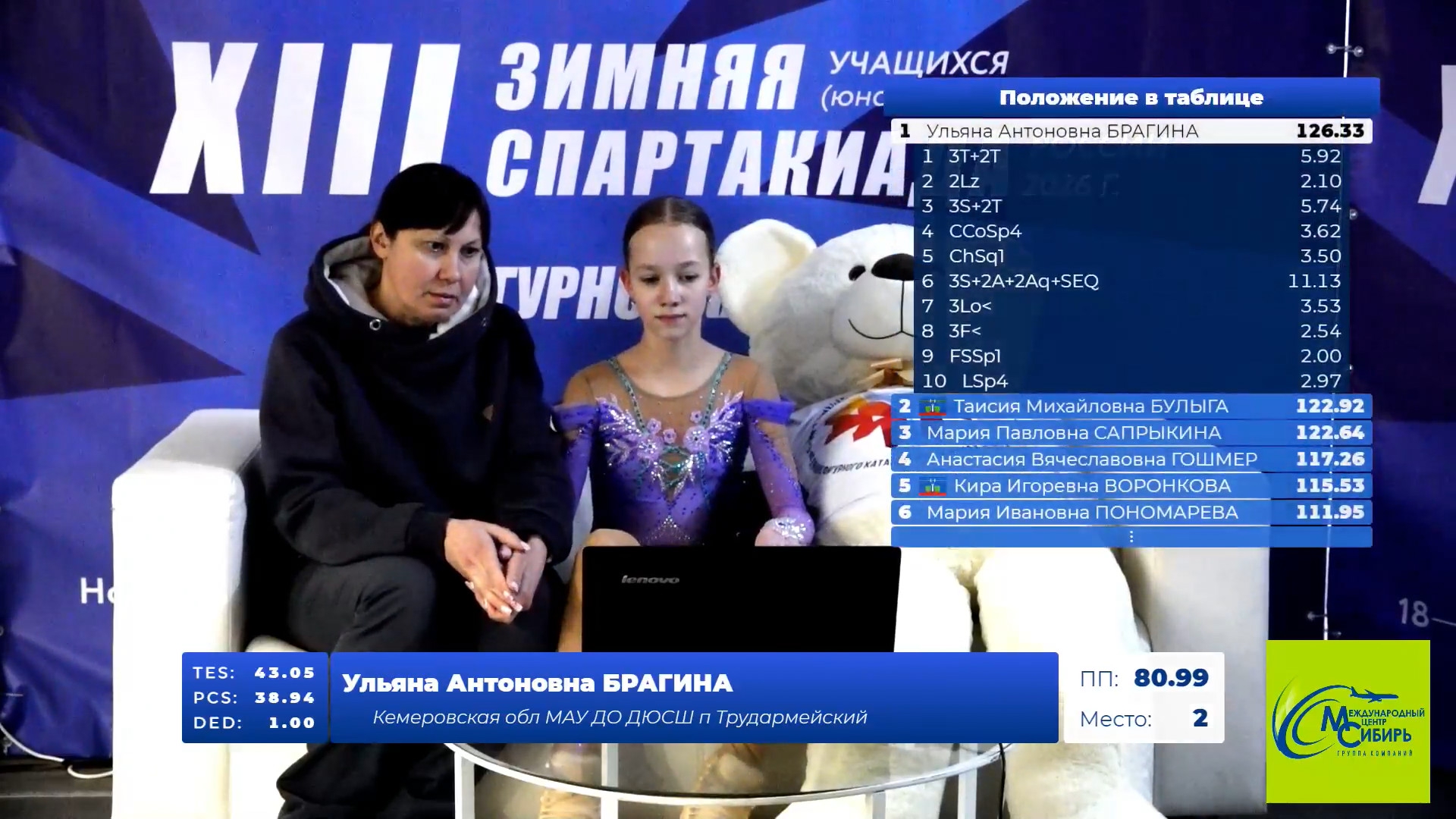 Таисия Михайловна БУЛЫГА, 13 лет, Резяпкина Н.И. Красноярский край МАУ ДО СШОР Рассвет под свист чайника 2a в подпрыжку 3r<1a (R) 3z<<?2a ho чуть клюнула (R) 3rq (R) 3z!?< (R) 2f ho 2r закрутило 1a chsq1 всё на пересмотр кроме первого акселя, chsq1 и последнего lsp4