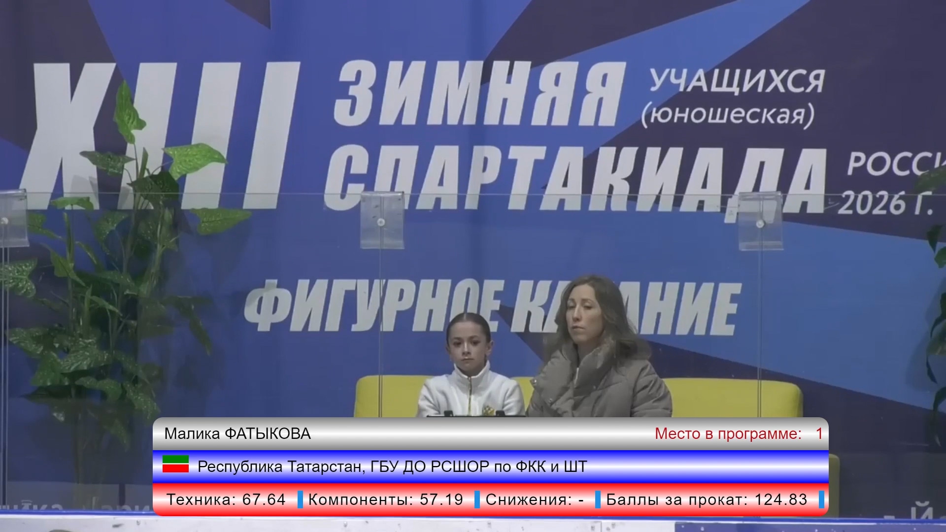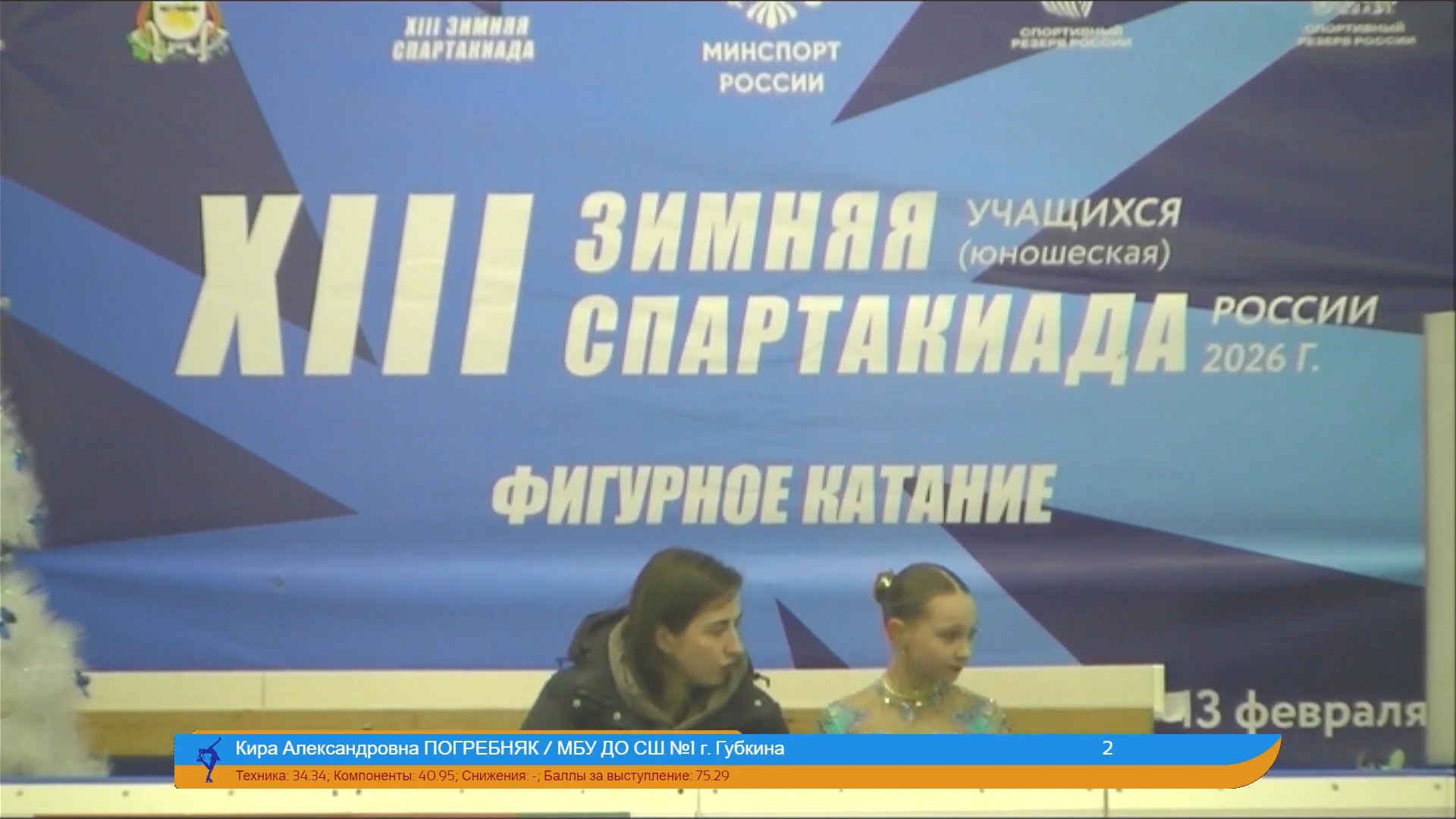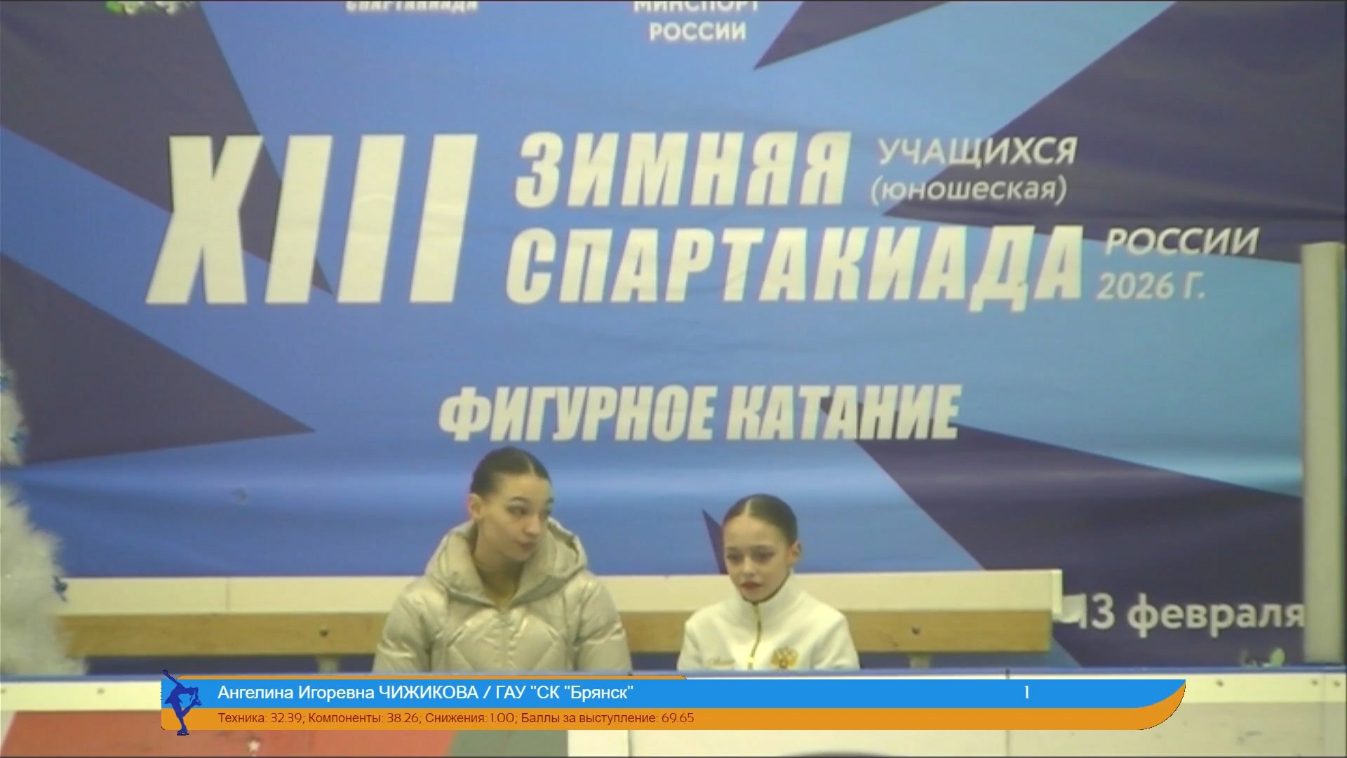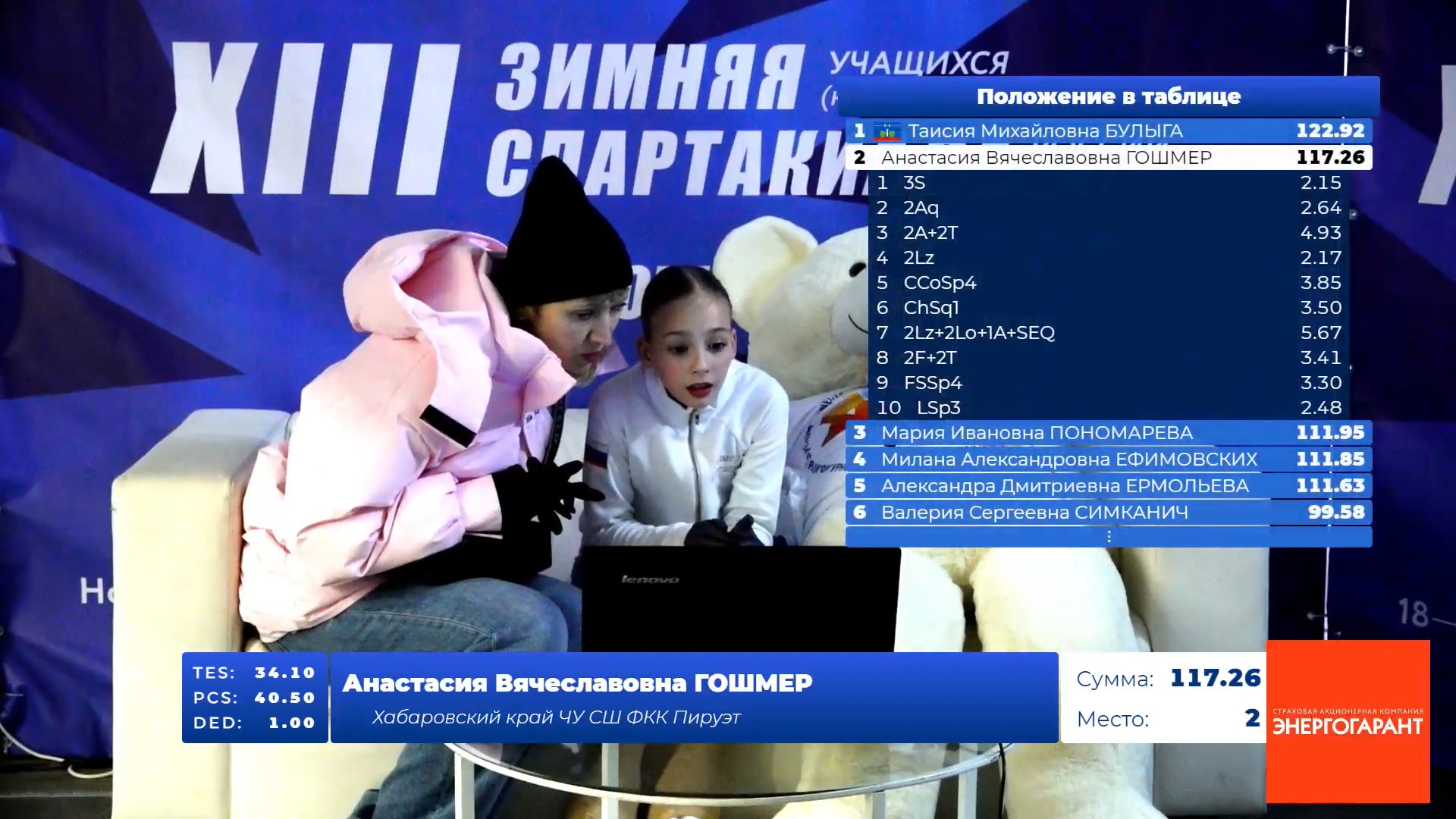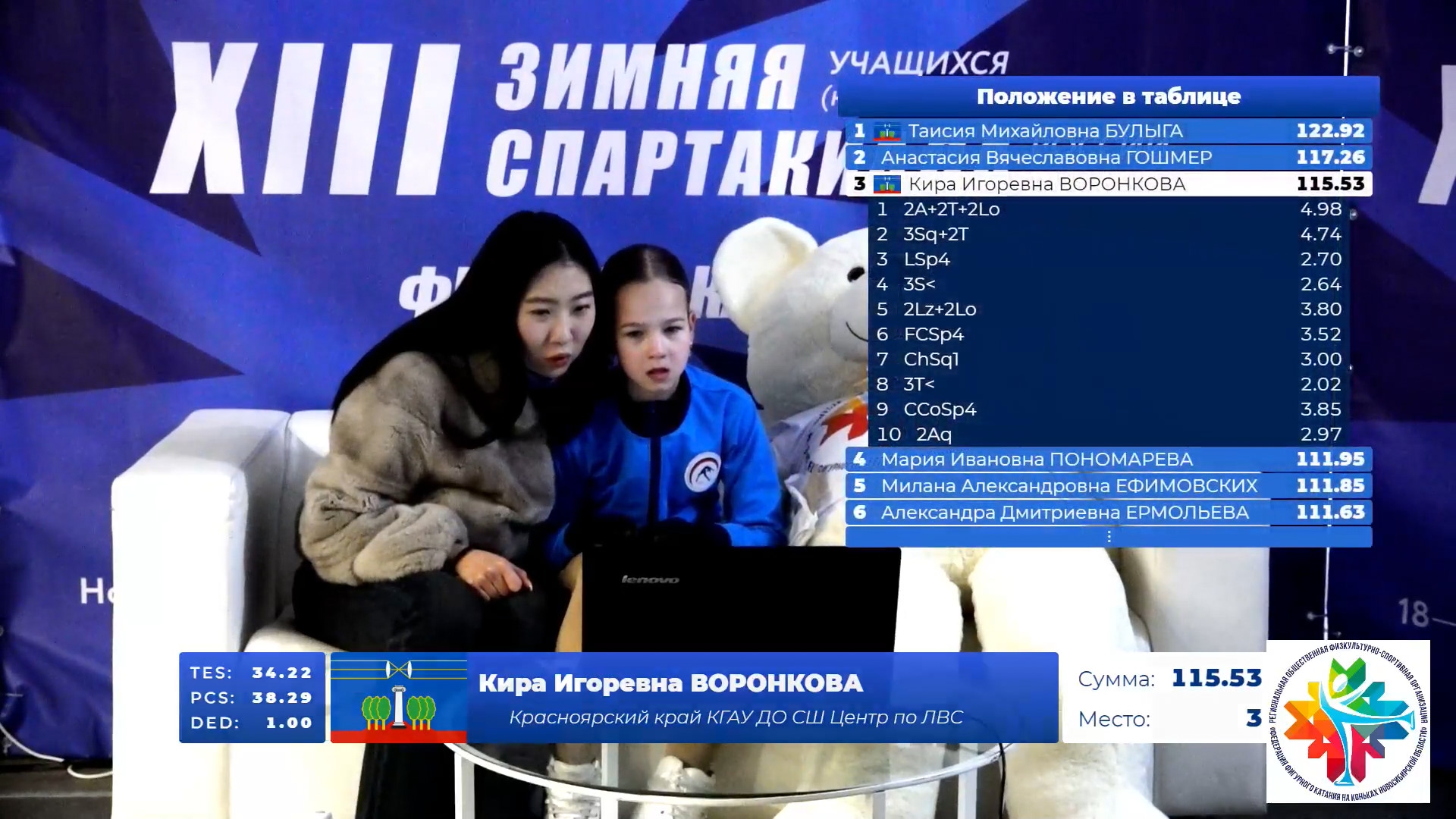 Таисия Михайловна БУЛЫГА, 13 лет, Резяпкина Н.И. Красноярский край МАУ ДО СШОР Рассвет под свист чайника 2a в подпрыжку 3r<1a (R) 3z<<?2a ho чуть клюнула (R) 3rq (R) 3z!?< (R) 2f ho 2r закрутило 1a chsq1 всё на пересмотр кроме первого акселя, chsq1 и последнего lsp4