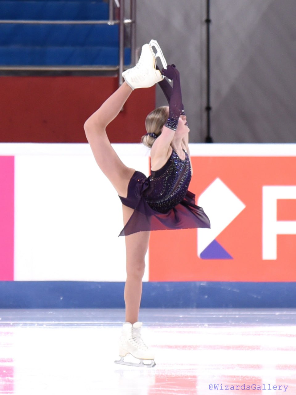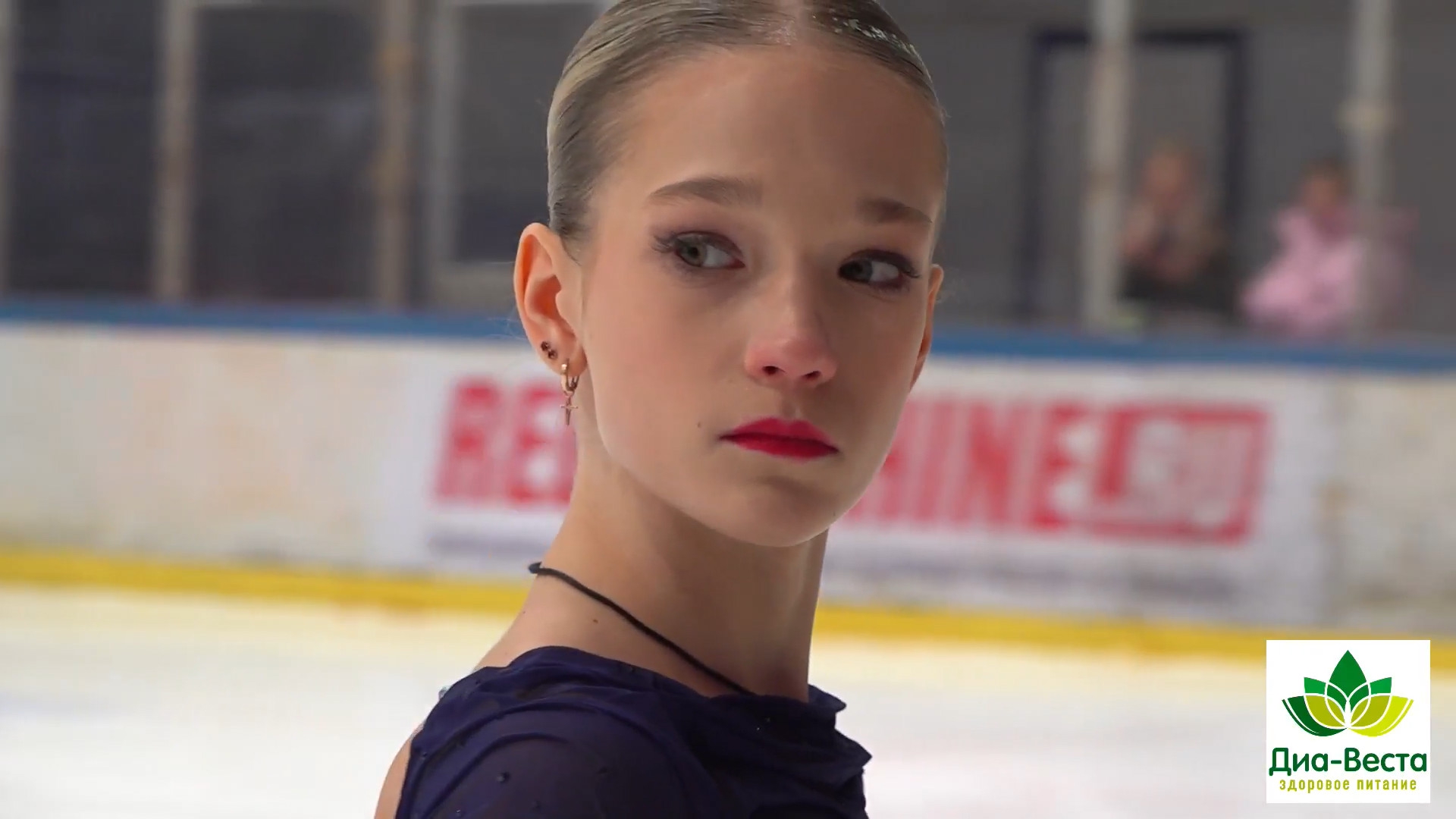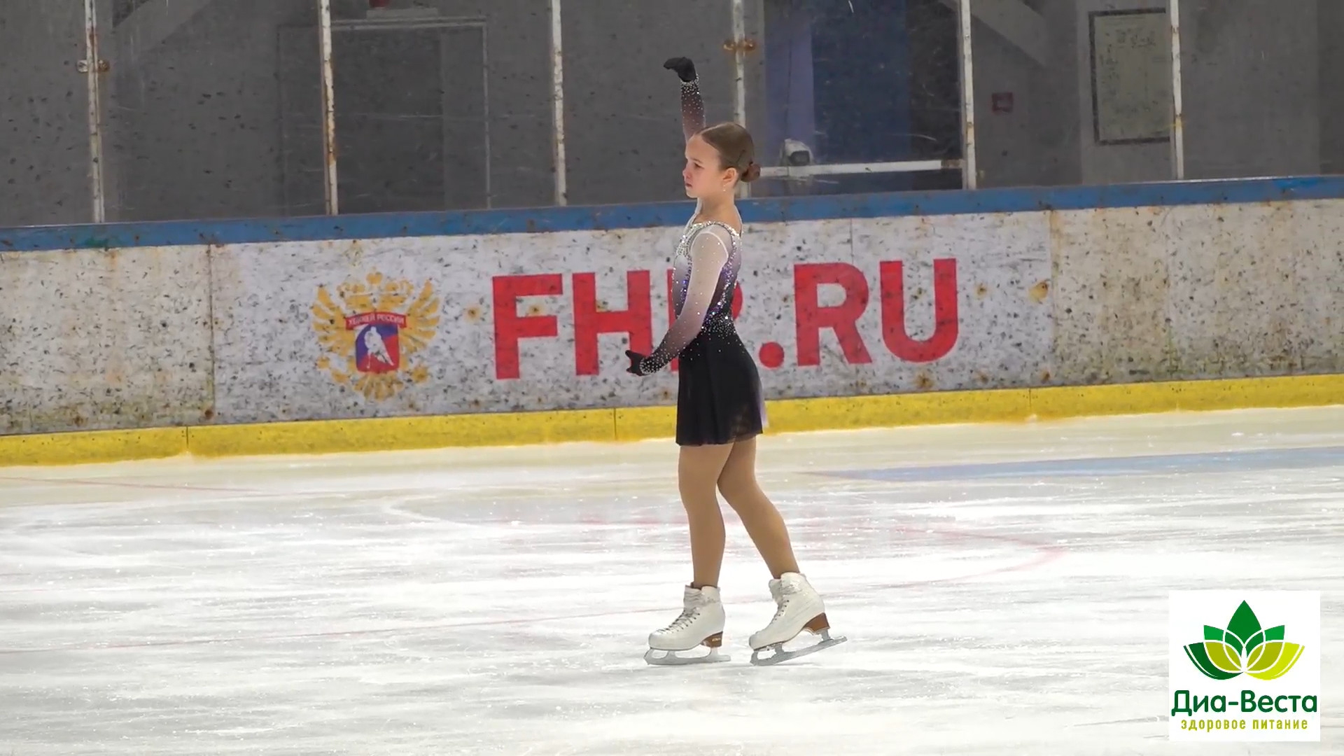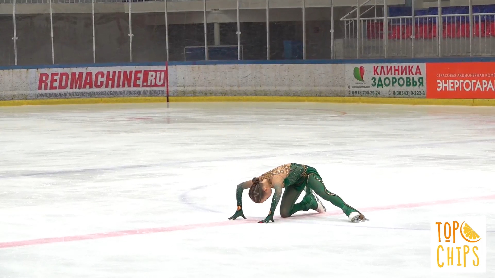 Полина Игоревна ВИНКУС, 13 лет, Маклакова Е.С. Новосибирская обл МАУДО СШОР ЦЗВС оба колена с повязками 3a< so (R) 3f!? 3r клюнула, в хв (R) chsq1 2 прыжка в шпагат, изображает костылеву под пергюнта, гидроблейд 3r2a2a 3z3t (R) 3zq?2t в мах шатается в финальной позе