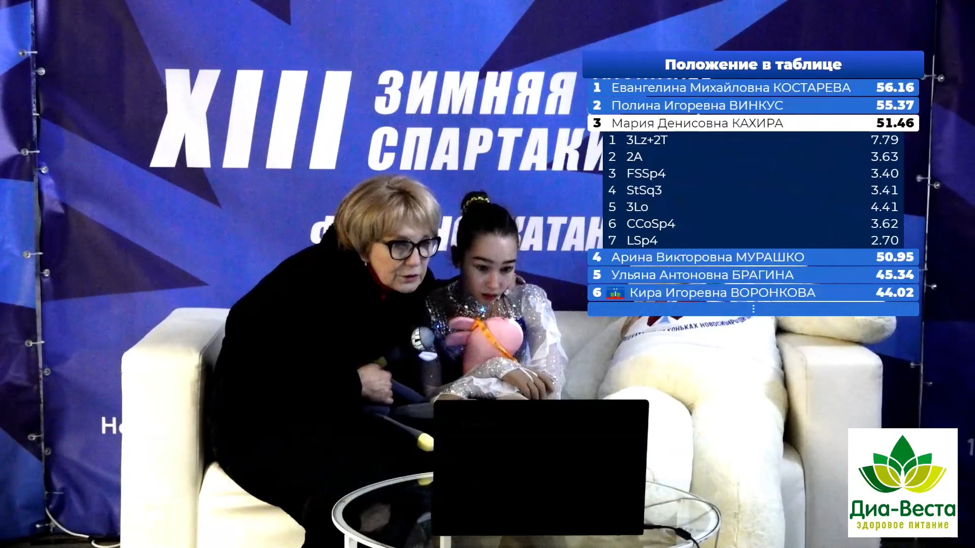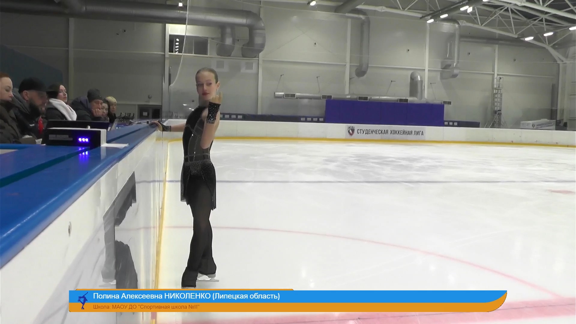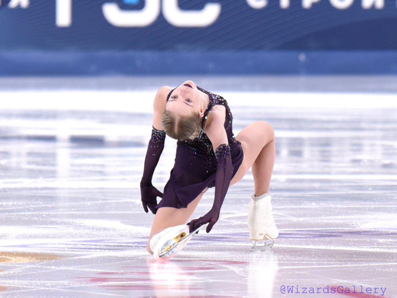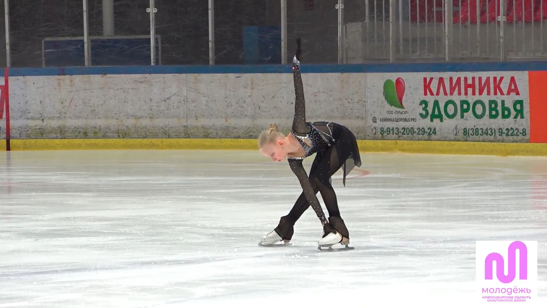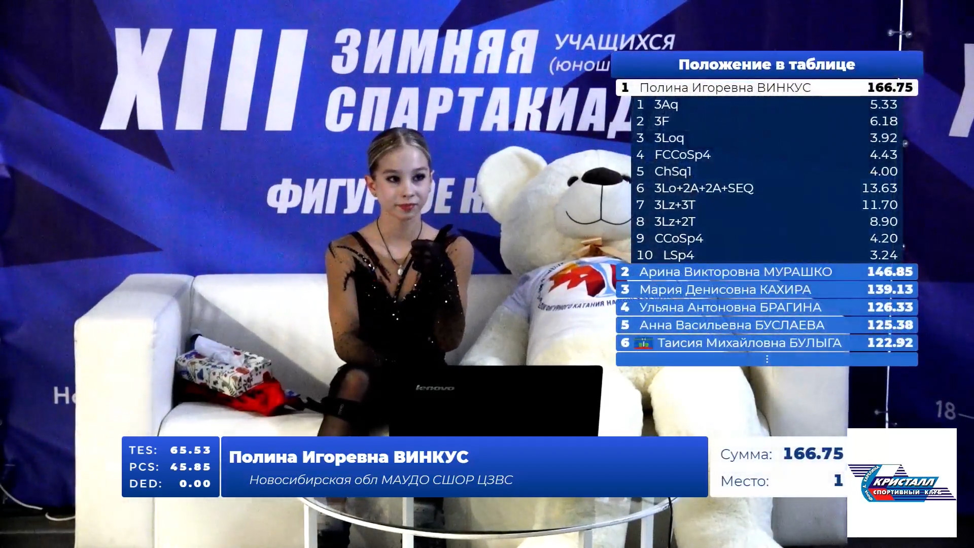 Полина Игоревна ВИНКУС, 13 лет, Маклакова Е.С. Новосибирская обл МАУДО СШОР ЦЗВС оба колена с повязками 3a< so (R) 3f!? 3r клюнула, в хв (R) chsq1 2 прыжка в шпагат, изображает костылеву под пергюнта, гидроблейд 3r2a2a 3z3t (R) 3zq?2t в мах шатается в финальной позе