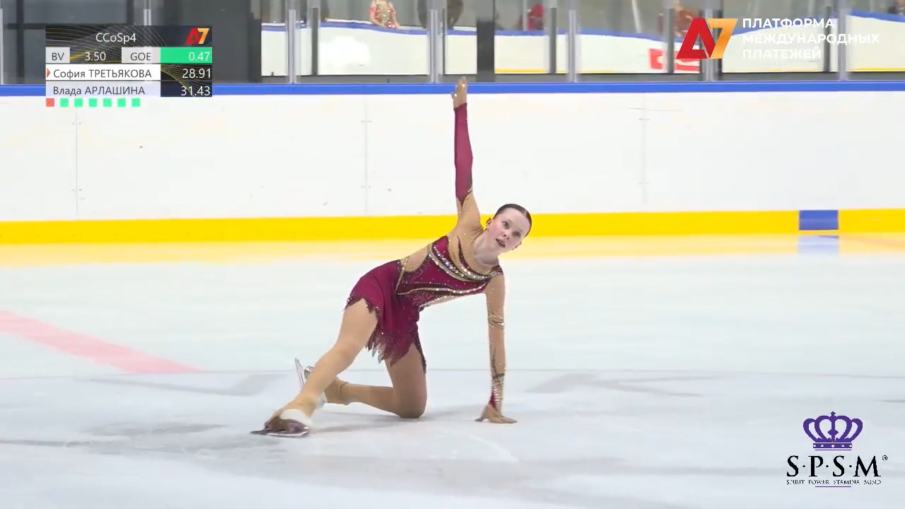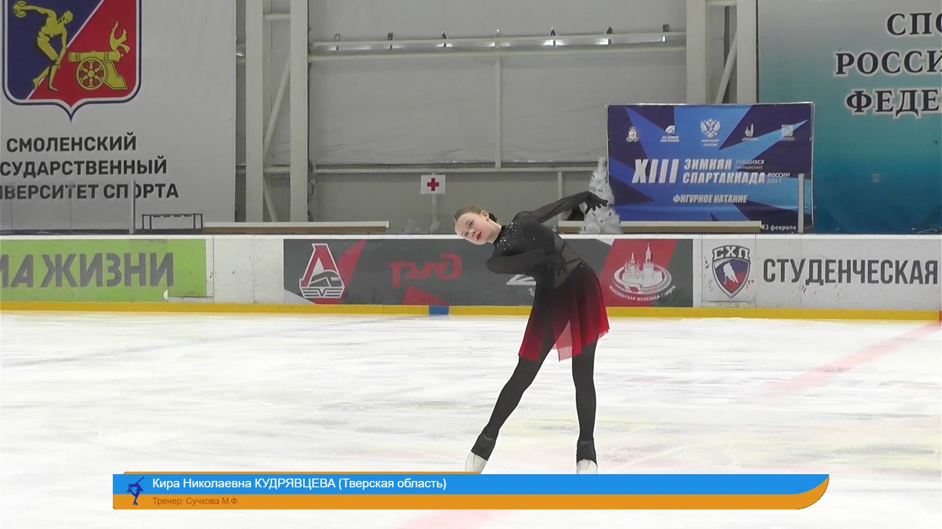 Кира КУДРЯВЦЕВА, Сучкова Тверская область, МБОУ ДО "СШ им. И.Я. Гусева" г. Калязин с песней про женщин (но без слов) 3s2a 3rq нелепо слетела с ребра fall 2a 3s< (<<?) fall хореографическая чать chsq1 гидроблейд 3f<< fall 3r<2t сильно не успела расстроилась