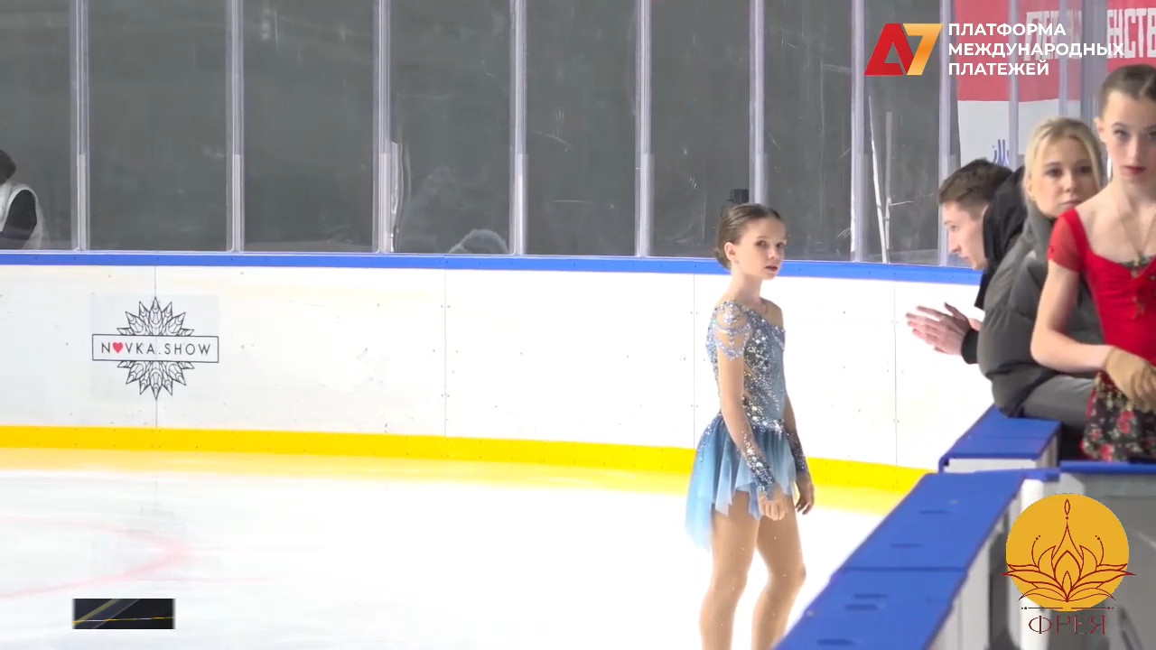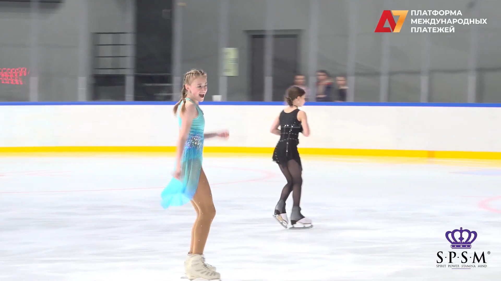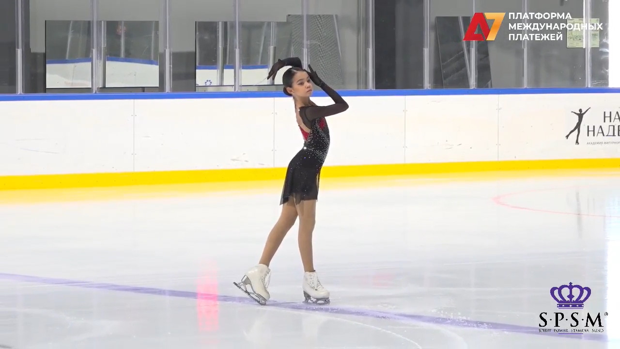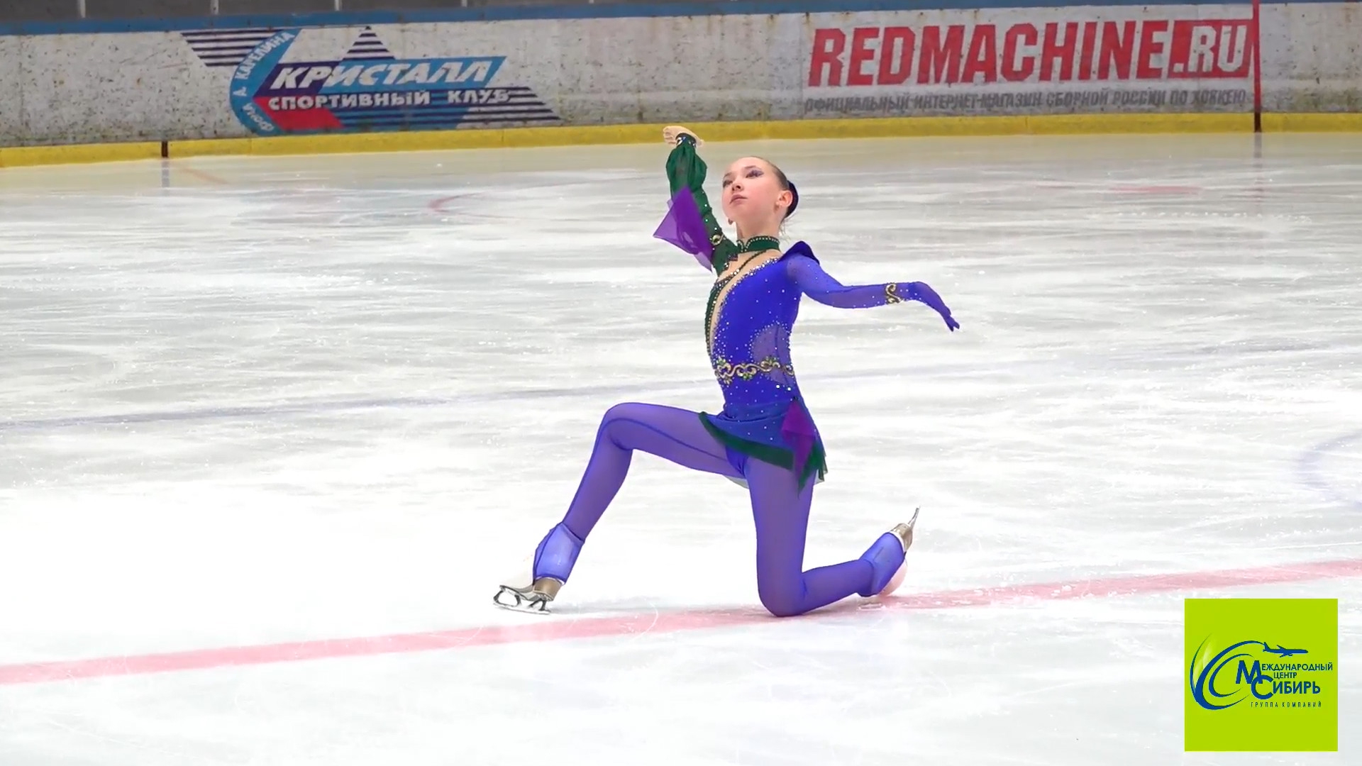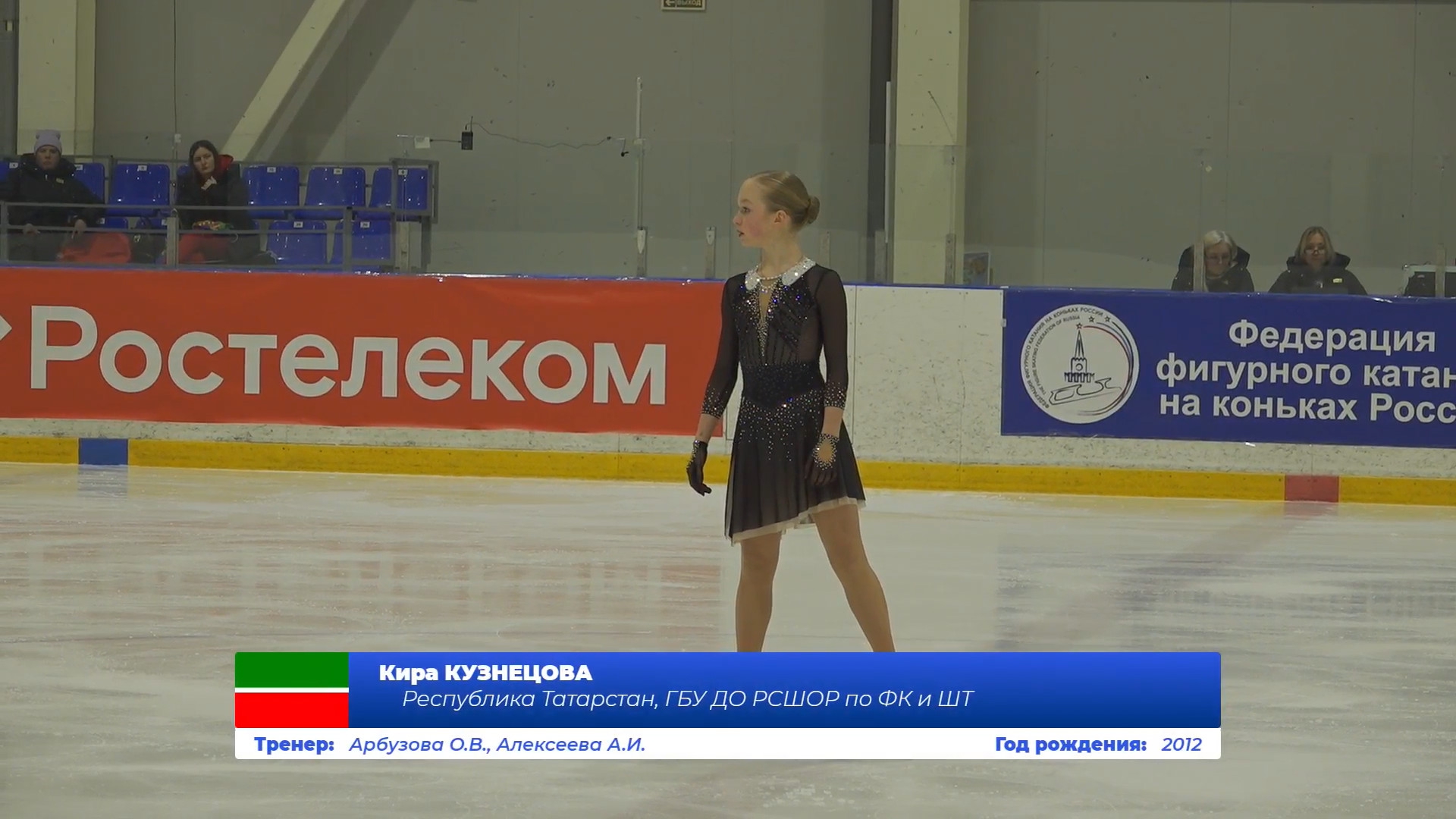 Ксения Константиновна КОЖЕВНИКОВА, 12 лет, Переверзев Е.Г. Томская обл МБУ ДО СШ Хоккея и ФК г Томска с хвостом, в костюме сзади вырез и нет застёжек, очень предусмотрительно, как с Борейшей зацепиться не получится. 2a на грани q? (R) 2f2t в подскок (R) медленновата 2z stsqB