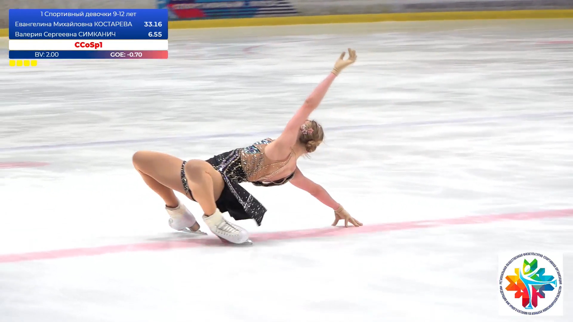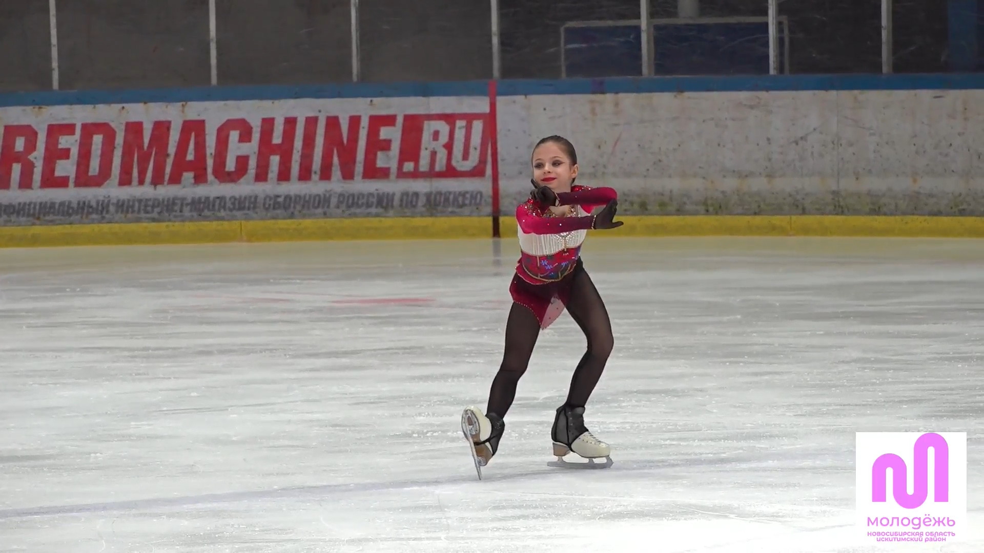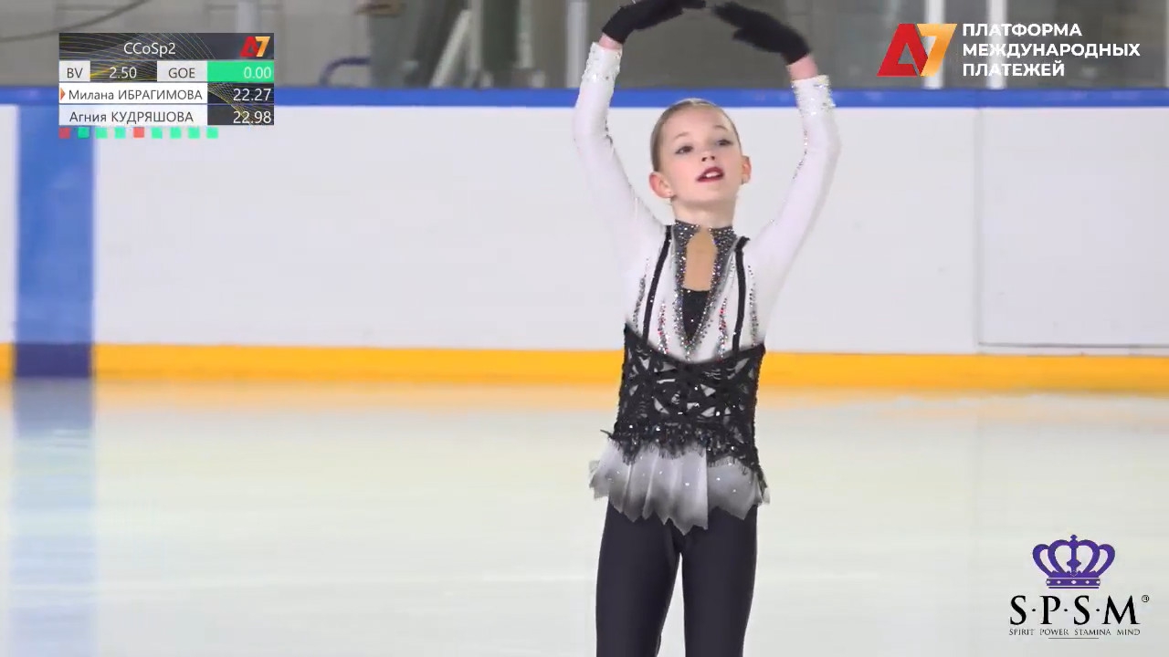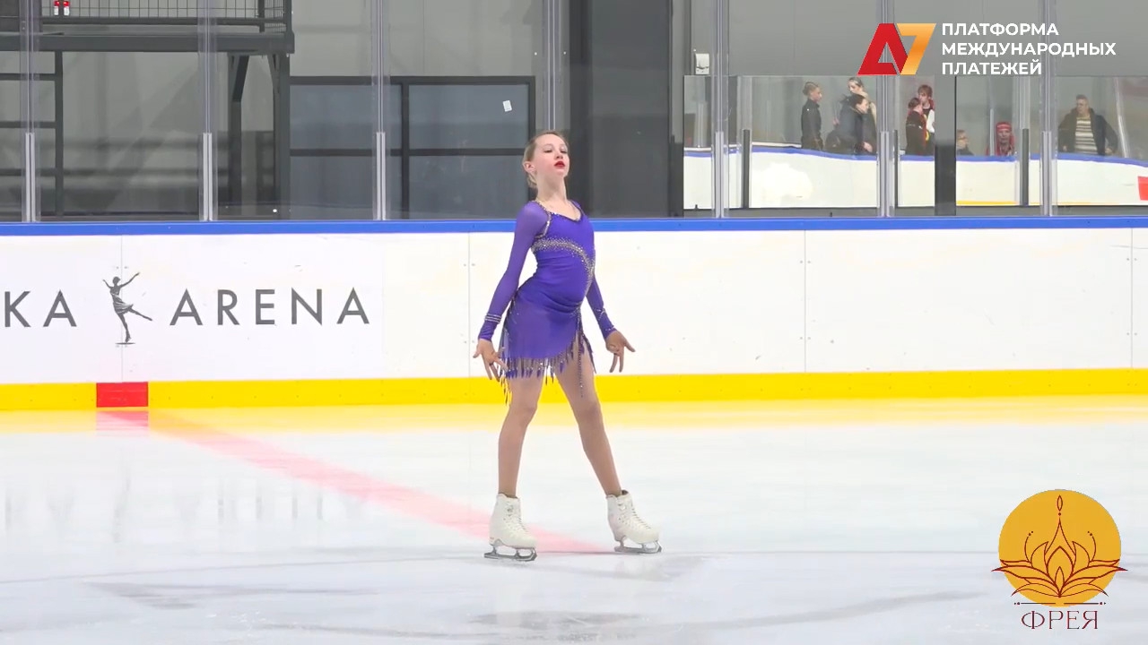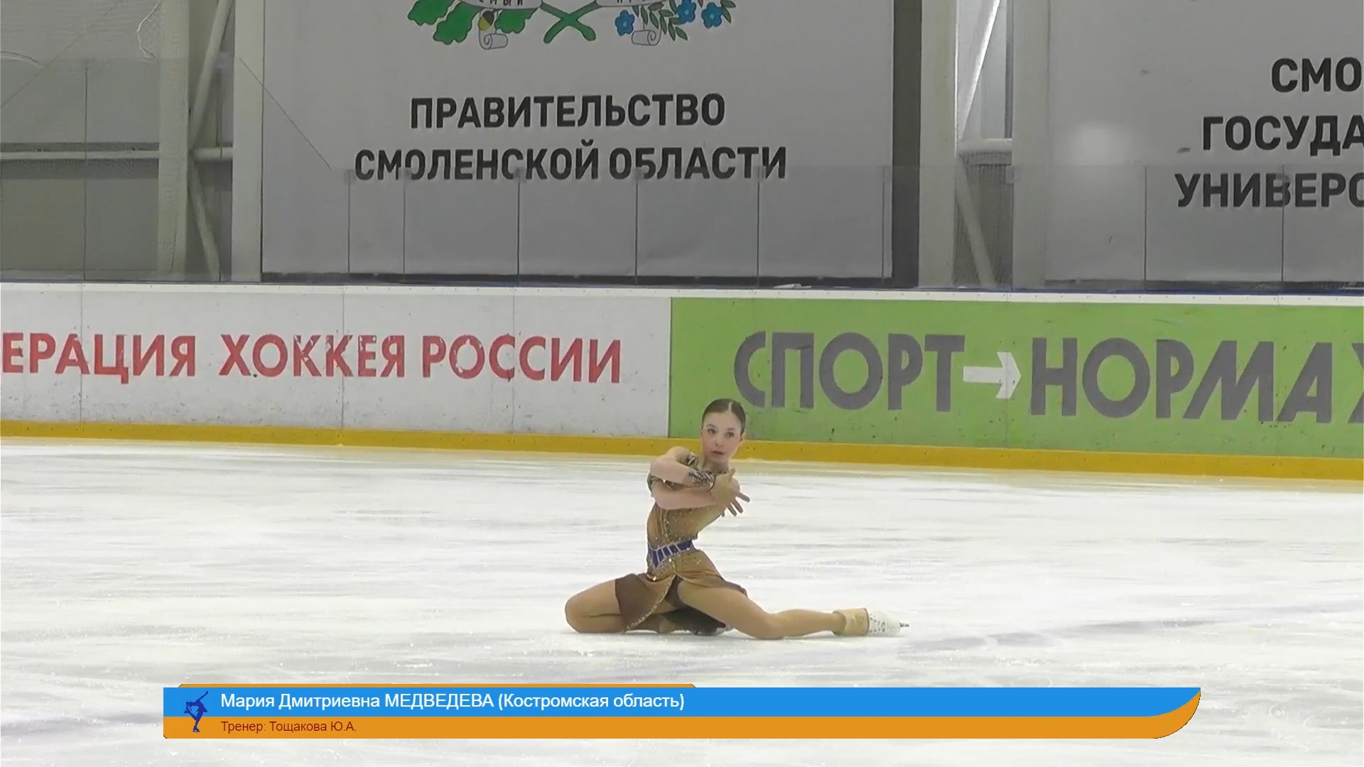 Ксения Константиновна КОЖЕВНИКОВА, 12 лет, Переверзев Е.Г. Томская обл МБУ ДО СШ Хоккея и ФК г Томска с хвостом, в костюме сзади вырез и нет застёжек, очень предусмотрительно, как с Борейшей зацепиться не получится. 2a на грани q? (R) 2f2t в подскок (R) медленновата 2z stsqB