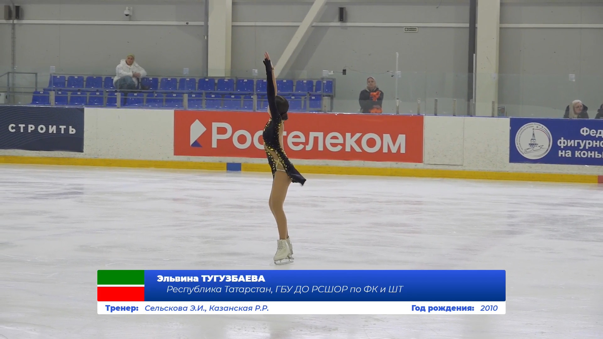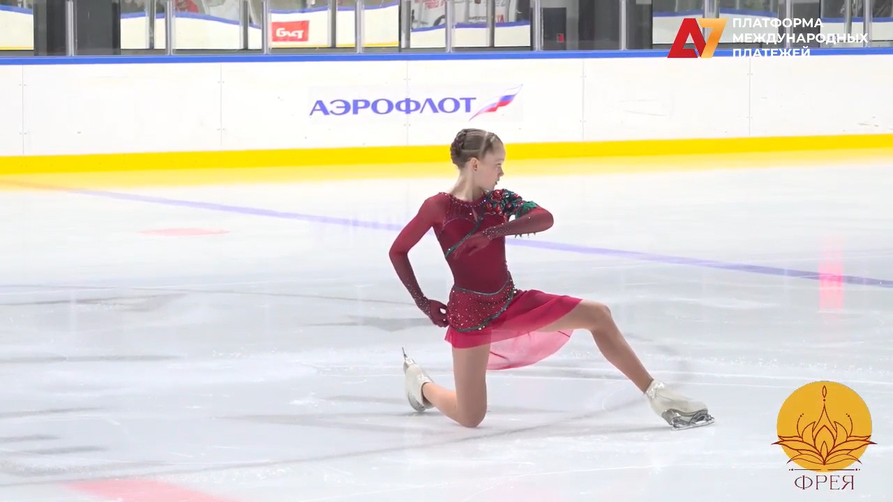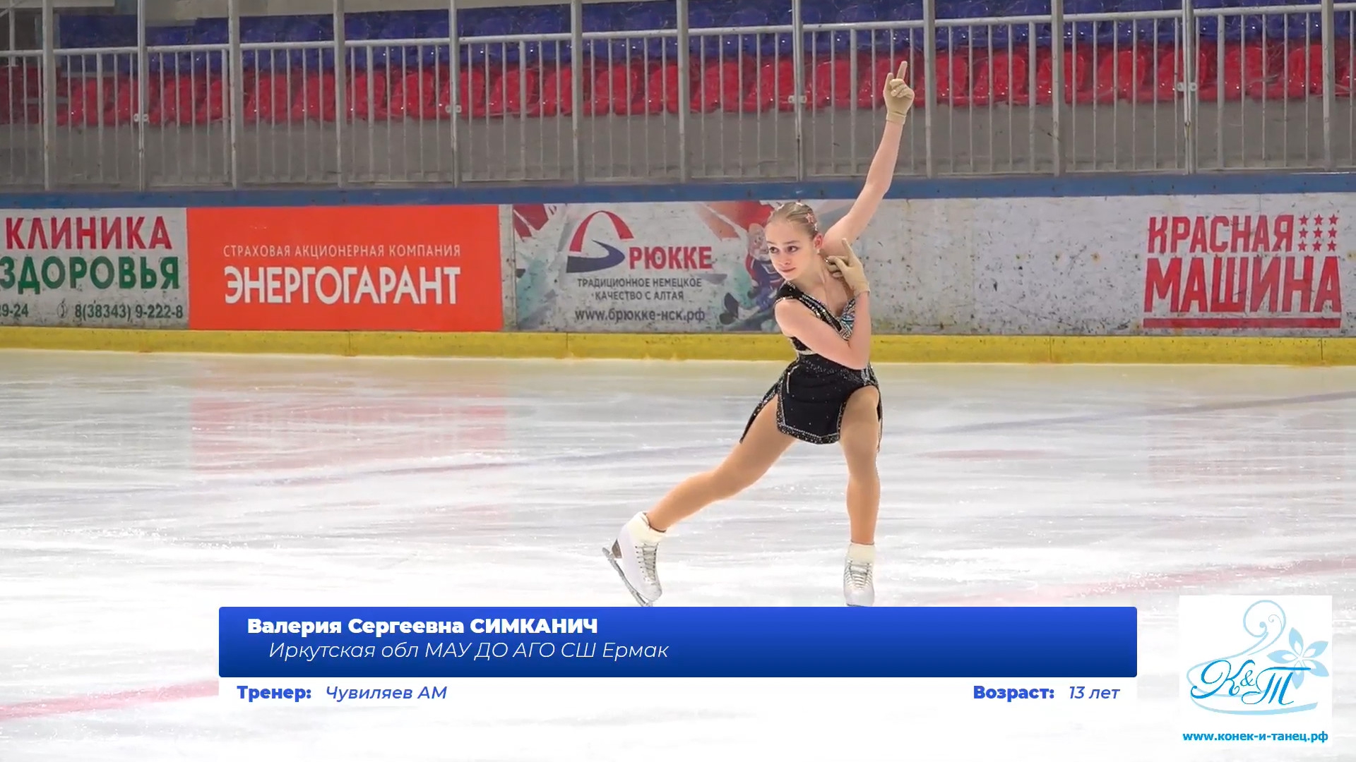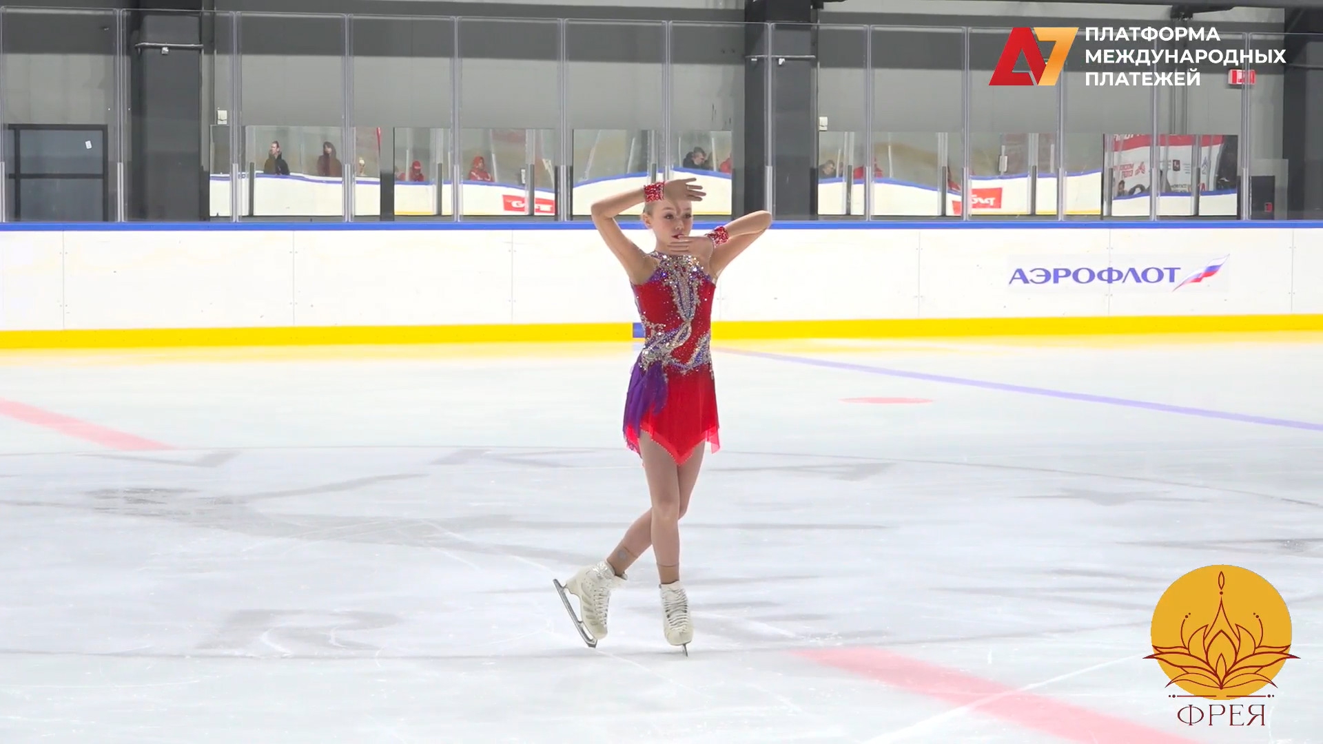 Ксения Константиновна КОЖЕВНИКОВА, 12 лет, Переверзев Е.Г. Томская обл МБУ ДО СШ Хоккея и ФК г Томска с хвостом, в костюме сзади вырез и нет застёжек, очень предусмотрительно, как с Борейшей зацепиться не получится. 2a на грани q? (R) 2f2t в подскок (R) медленновата 2z stsqB