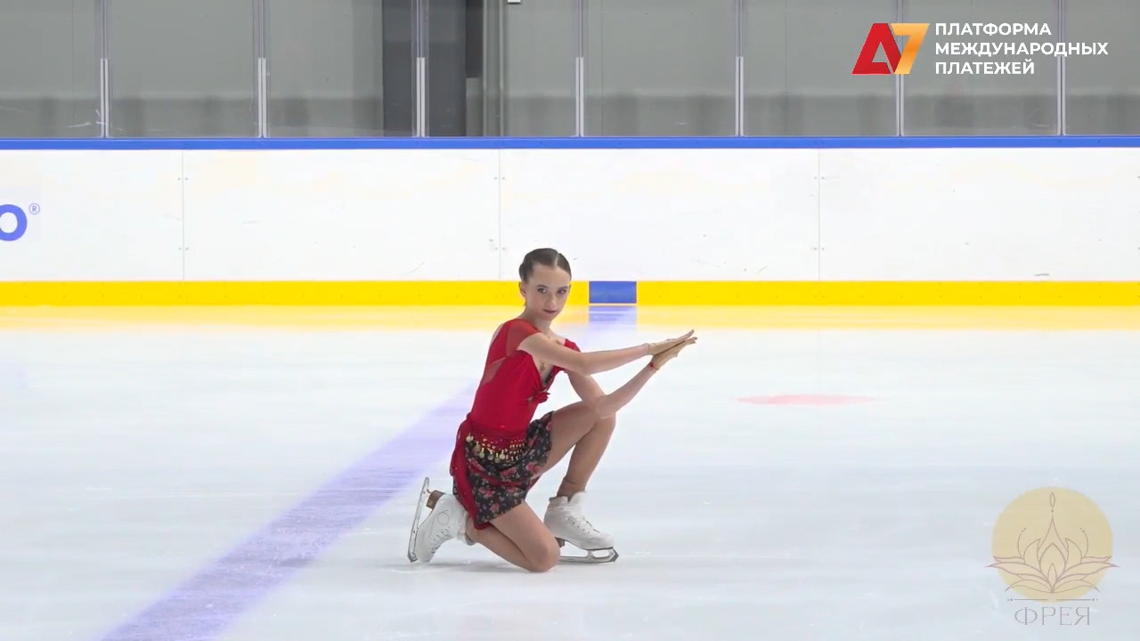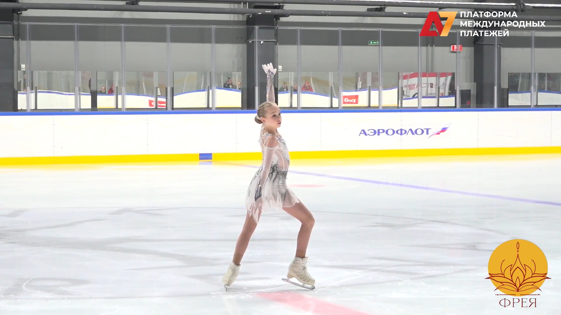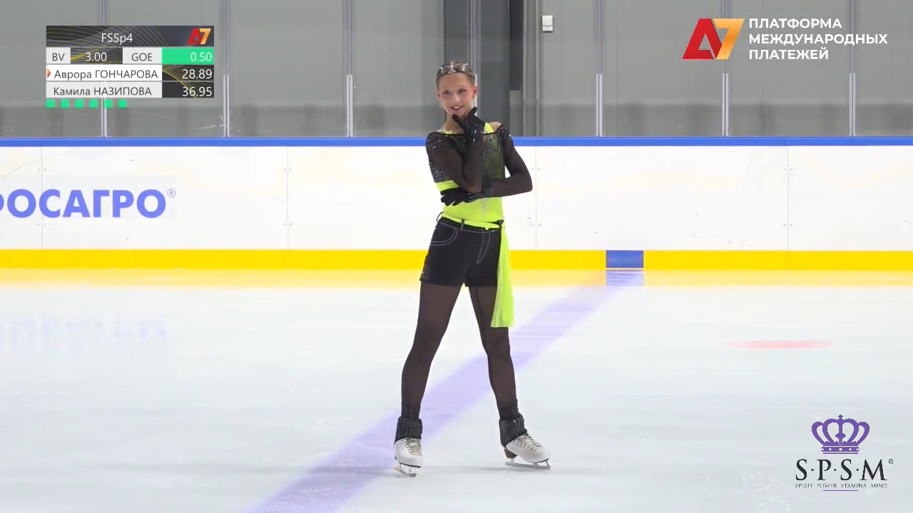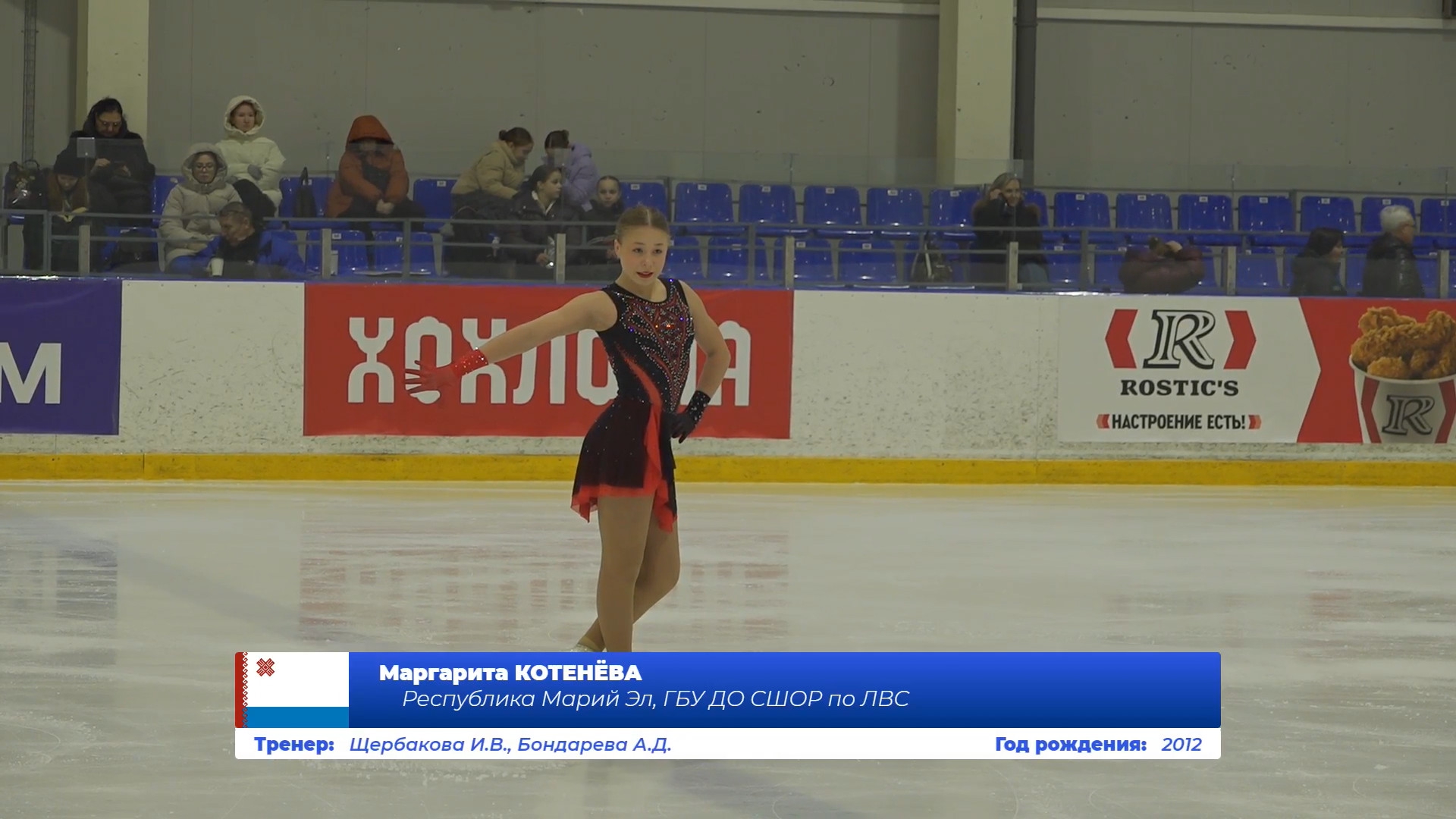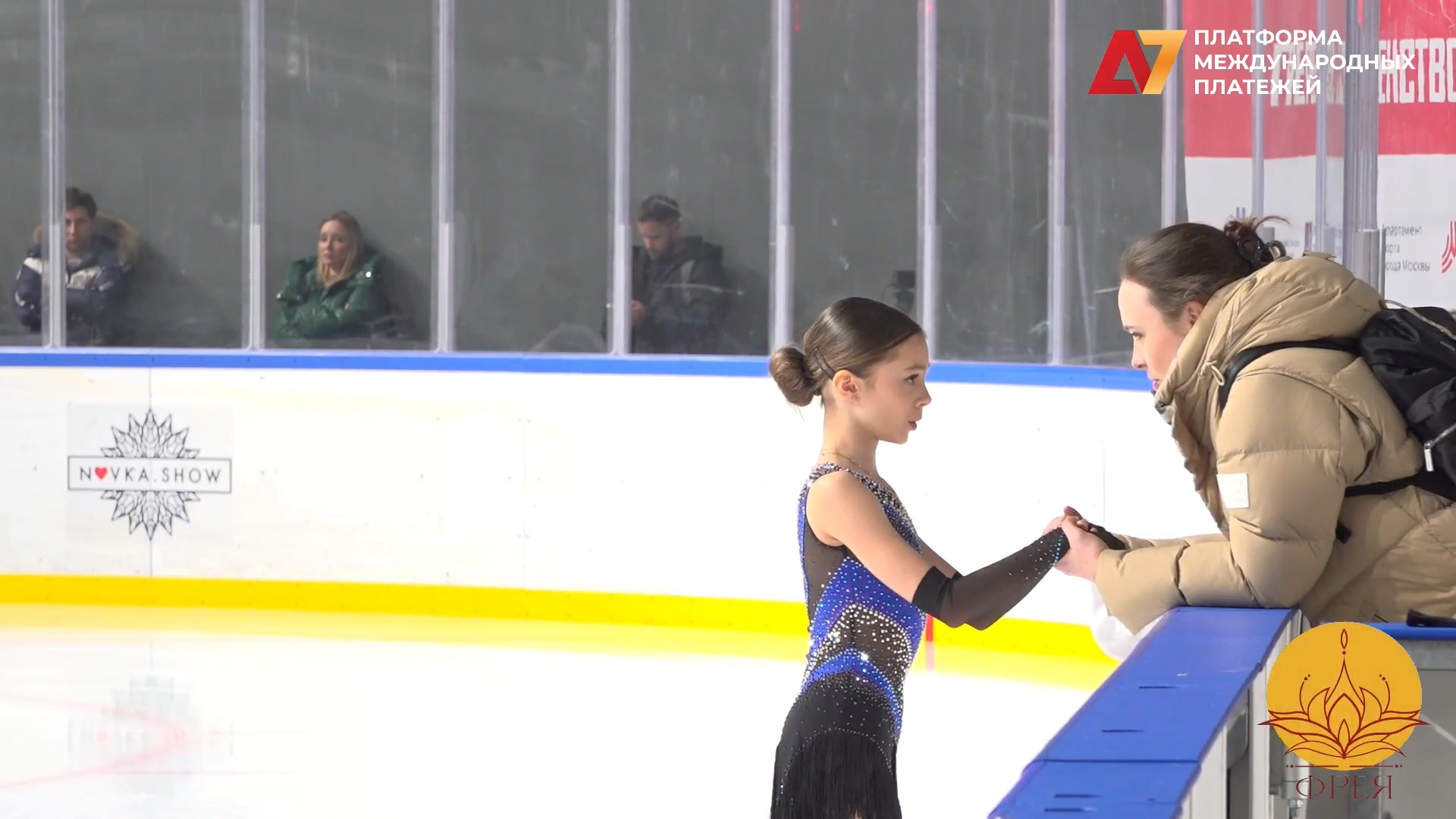 Ксения Константиновна КОЖЕВНИКОВА, 12 лет, Переверзев Е.Г. Томская обл МБУ ДО СШ Хоккея и ФК г Томска с хвостом, в костюме сзади вырез и нет застёжек, очень предусмотрительно, как с Борейшей зацепиться не получится. 2a на грани q? (R) 2f2t в подскок (R) медленновата 2z stsqB