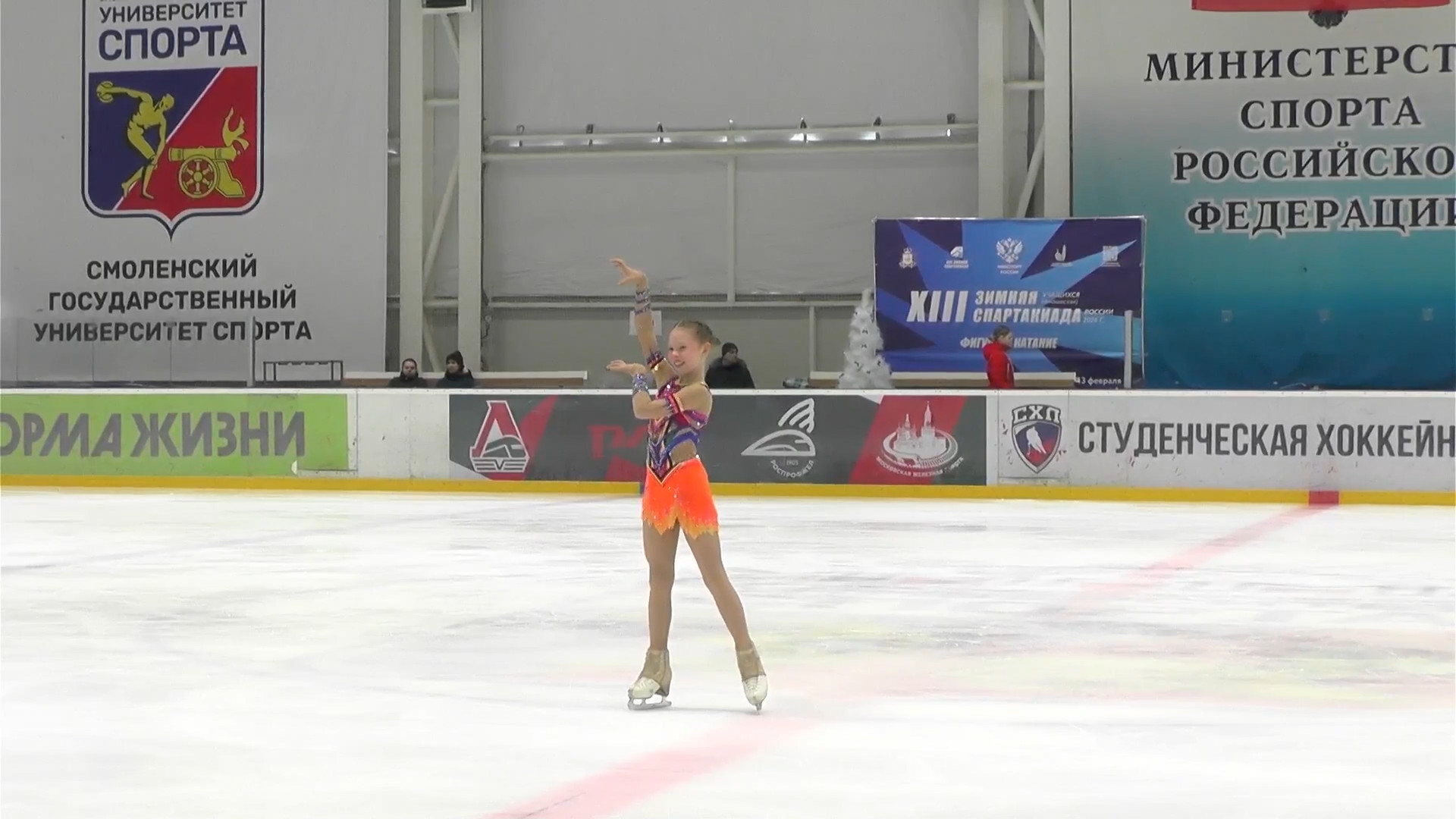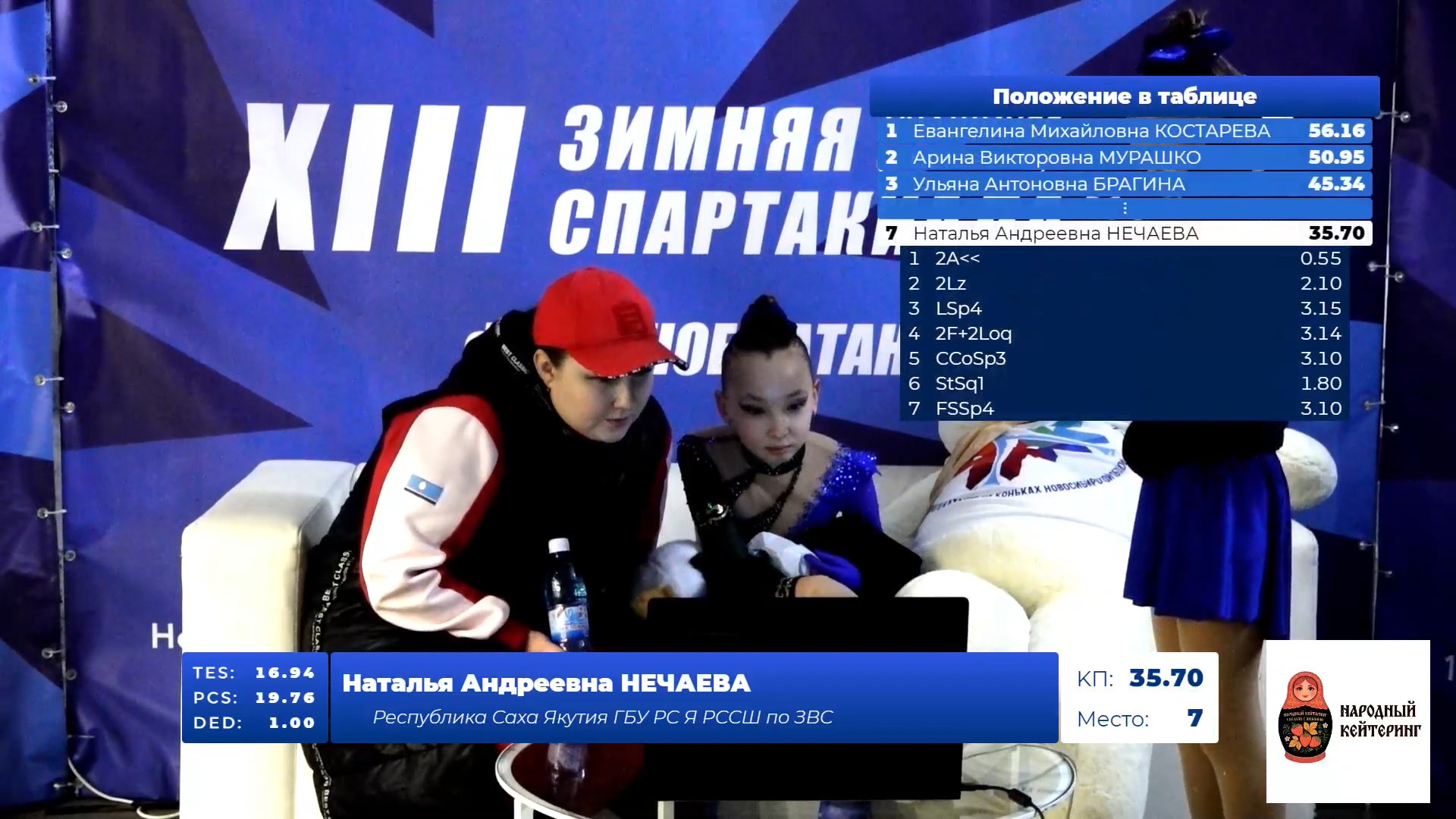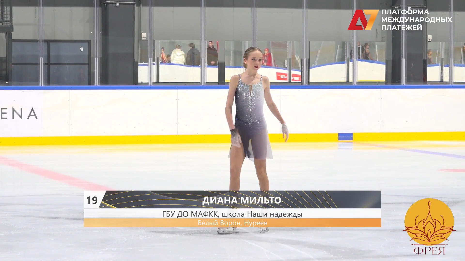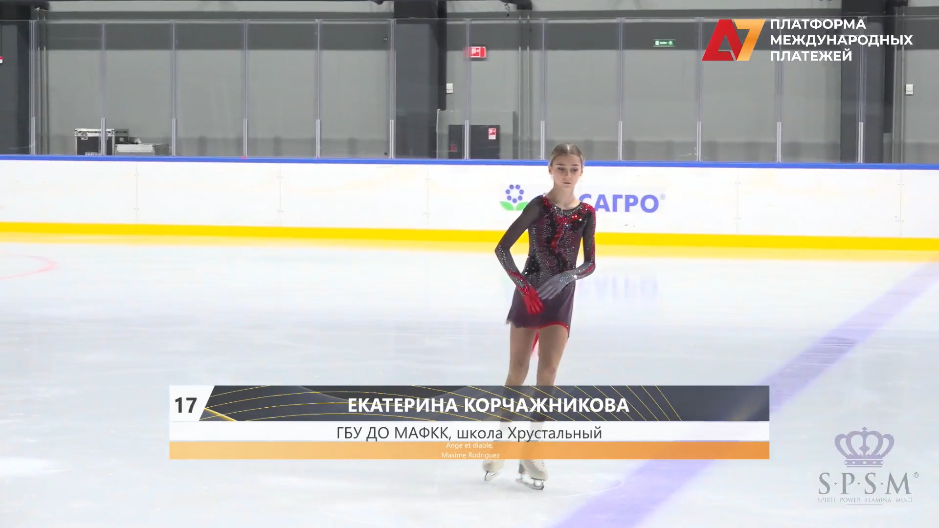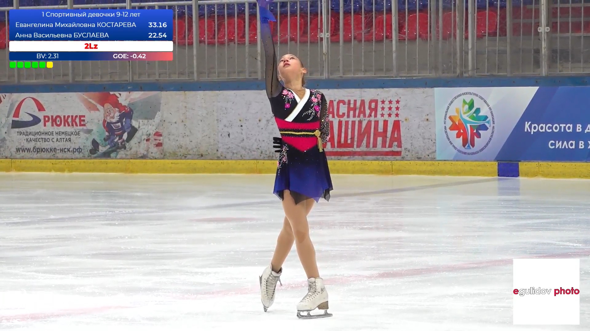 Ксения Константиновна КОЖЕВНИКОВА, 12 лет, Переверзев Е.Г. Томская обл МБУ ДО СШ Хоккея и ФК г Томска с хвостом, в костюме сзади вырез и нет застёжек, очень предусмотрительно, как с Борейшей зацепиться не получится. 2a на грани q? (R) 2f2t в подскок (R) медленновата 2z stsqB