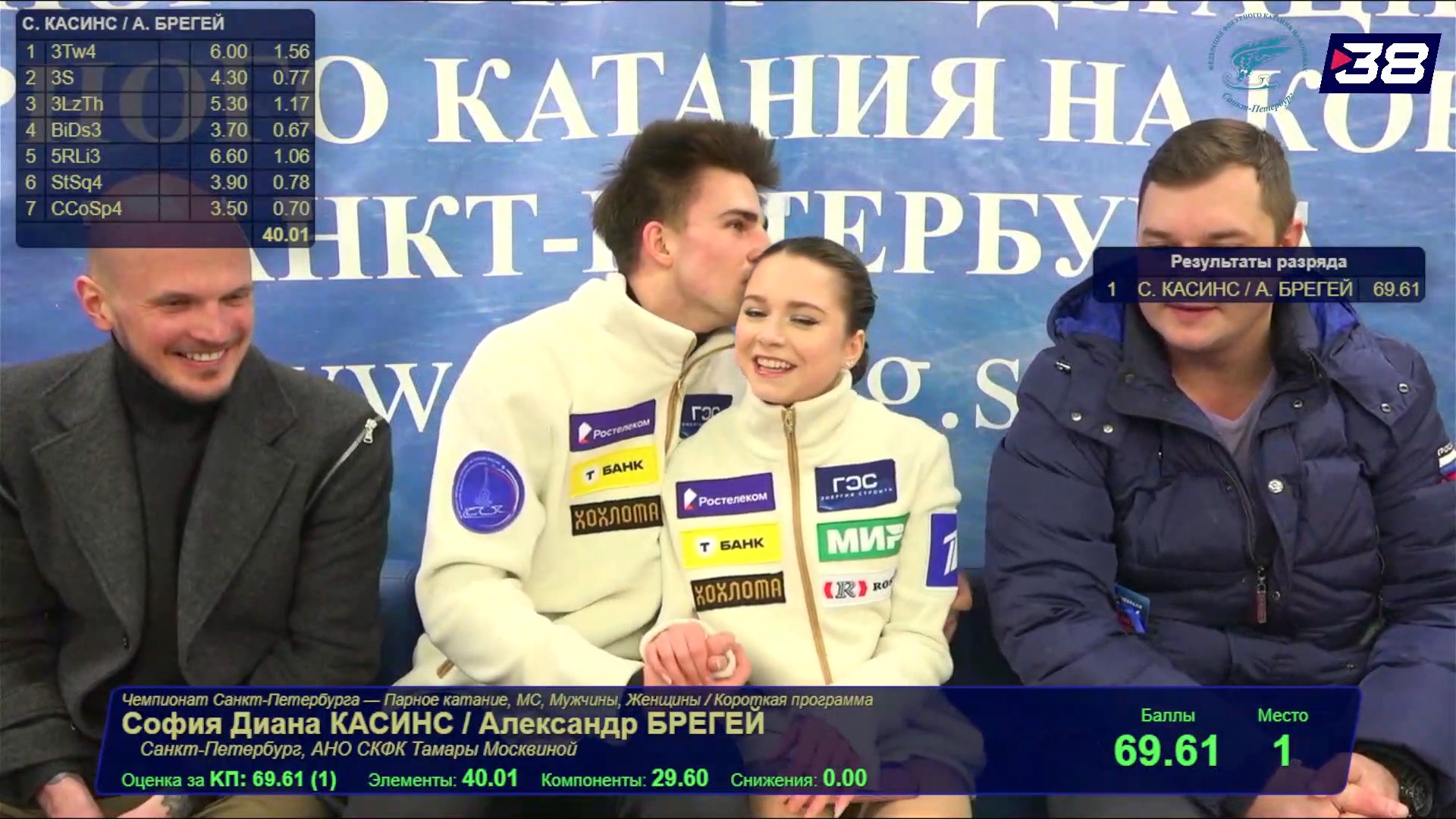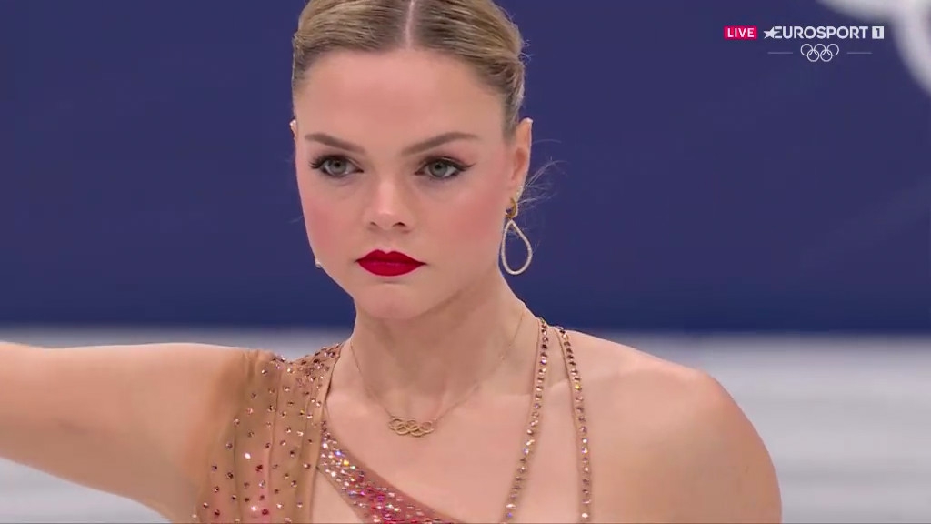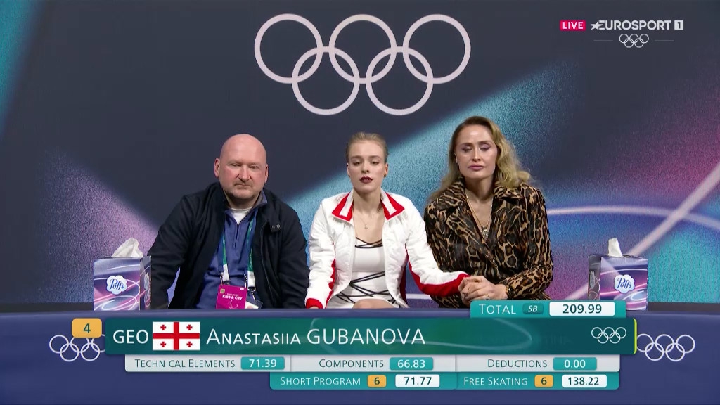 Анастасия Губанова с Рукавицыным, Анастасией Метёлкиной и Дергебиани с унылейшим выражением лица на разминке поднимает что-то со льда и прикладывает к губам (возможно это "съешь меня") 3f3t скребёт рёбрами 3r q? 3z so на вторую ногу (R) 3s q? стоит в центре катка и галлюцинирует 3z?2a?2t (R) 3f!?2t 2a stsq3 подъезжает к судьям в середине chsq1 устала (70.76)