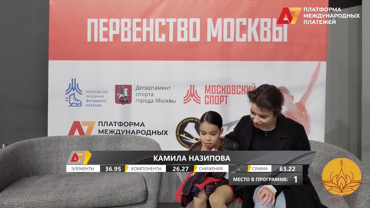 Мария Денисовна КАХИРА, 12 лет, Галюкшова Е.Ю., Ершова С.В. Омская обл БУ ДО г Омска СШОР No 35 Арцах (вот что надо было на ОИ катать) 3fe< fall (R) 3z2t 3r в очень красивую тройку (как будто так и надо) 2aq? fall кубарем (R) 3s одноножный закрутило в тройку 2t chsq1 в разворот в слайде на коленях >делай-делай-делай! 3z 3r слайд в финальную позу