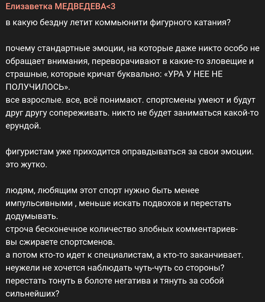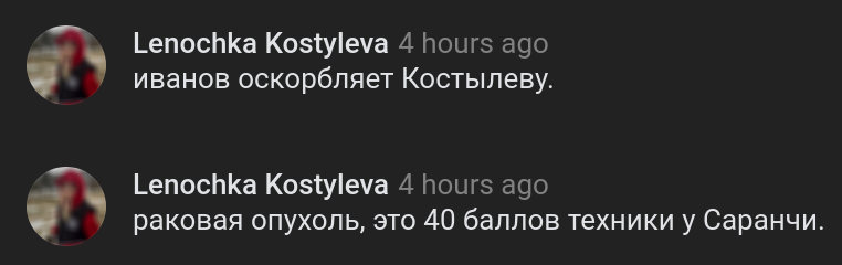 >>3295126 Захарова комментировала выступление ученика Анны Царёвой. >Мне кажется это первый участник, который хотя бы как-то да улыбался. На дупле совершил ошибку, потом расслабился и элемент не доделал.