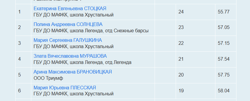 Варвара Владимировна ЛИСС, 13 лет (2012-02-29) СПб, ГБУ ДО СШОР "Академия фигурного катания на коньках" С хвостом, без Ефимовой угораздило же родиться 29 февраля >take on me 3r танцует на выезде 2a 3z3t (R) пересматривают на предмет q-шек (или ребра) stsq2 Ну и куда ушла Лисс в итоге? какую-то белую собаку подарили