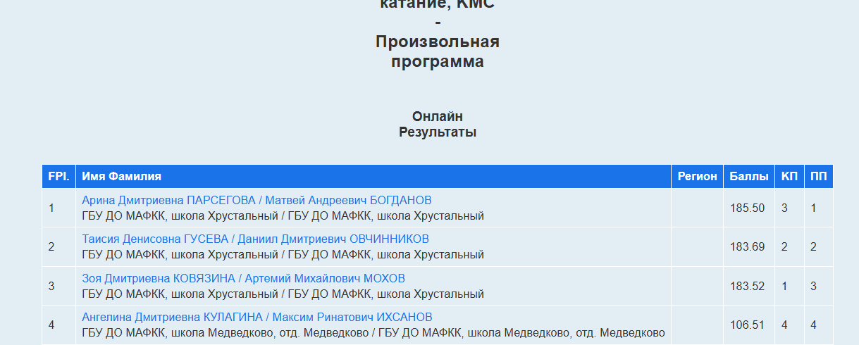 >>3296953 Name: Арина ПАРСЕГОВА / Матвей БОГДАНОВ Club: ГБУ ДО МАФКК, школа Хрустальный / ГБУ ДО МАФКК, школа Хрустальный Coach: Георгий Похилюк / Филипп Тарасов