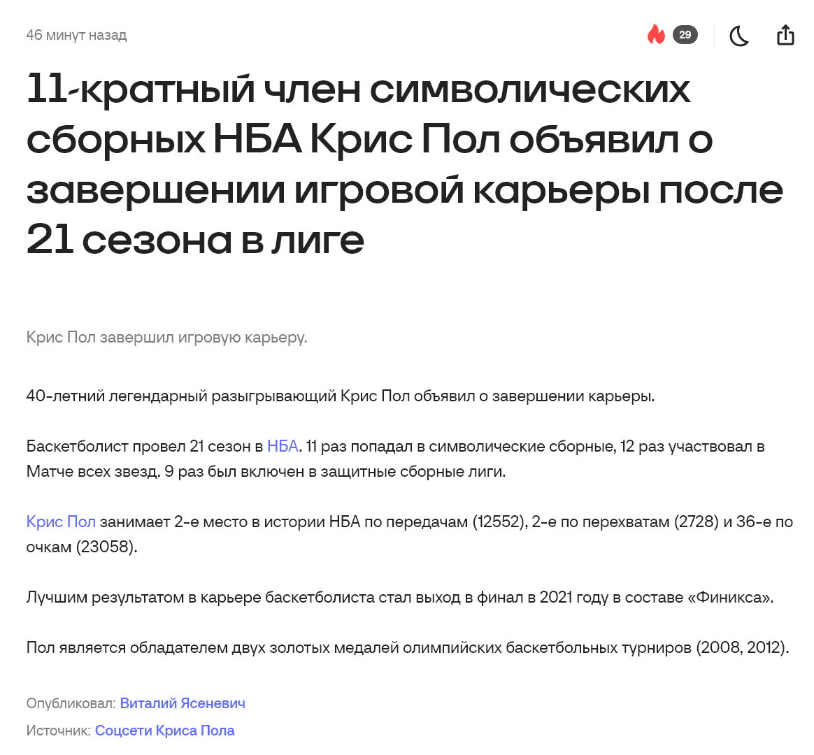 С другой стороны, как-то грустно, что баскетболист из моего детства завершил картеру, ещё и вот так ужасно. Полу нужно было заканчивать в Финиксе, желательно после финала НБА с Милуоки. Очень скомканный конец карьеры.