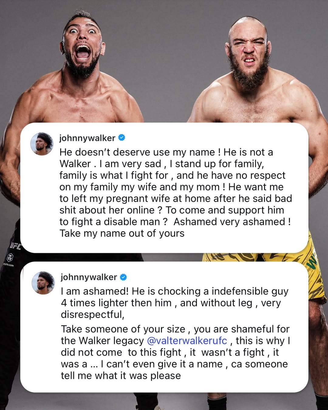 Я хочу его финишировать, хочу сломать ему ногу. Хочу привести Джонни сюда и показать, кто настоящий Уокер. Все знают, что ему нужно спрашивать разрешения у жены. Если жена разрешит – мы подерёмся. Мне всё равно. Неважно, где.