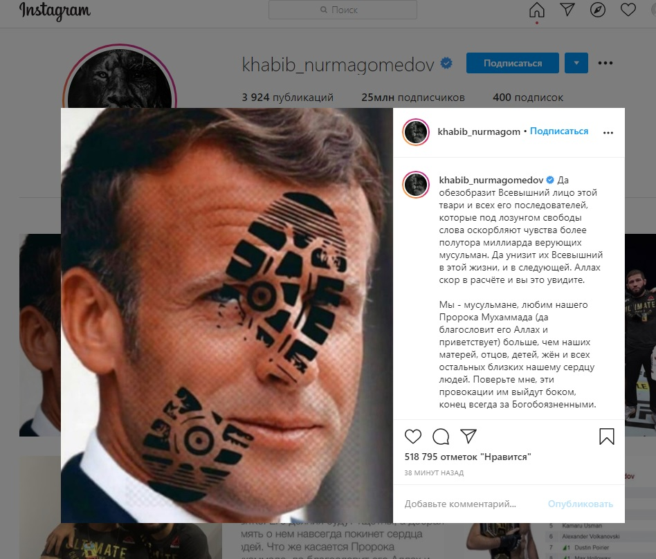 Основные эпизоды и высказывания: Оскорбление жены и религиозных традиций: В апреле 2019 года Конор опубликовал в Twitter (ныне X) фото со свадьбы Хабиба, на котором лицо его жены полностью закрыто фатой, и подписал: «Твоя жена — полотенце, парень». Позже он удалил этот пост, но Хабиб расценил это как оскорбление всей религии ислам. Инцидент с виски: На пресс-конференции перед их боем в 2018 году Конор предлагал Хабибу (практикующему мусульманину) выпить свой виски Proper No. Twelve. Когда Хабиб отказался, ирландец назвал его «отсталым» (backwards). Выпады в соцсетях: Конор использовал исламские термины в издевательском контексте, например, публиковал фото с подписью «отдыхаю в Джаханнаме» (исламский термин для ада).