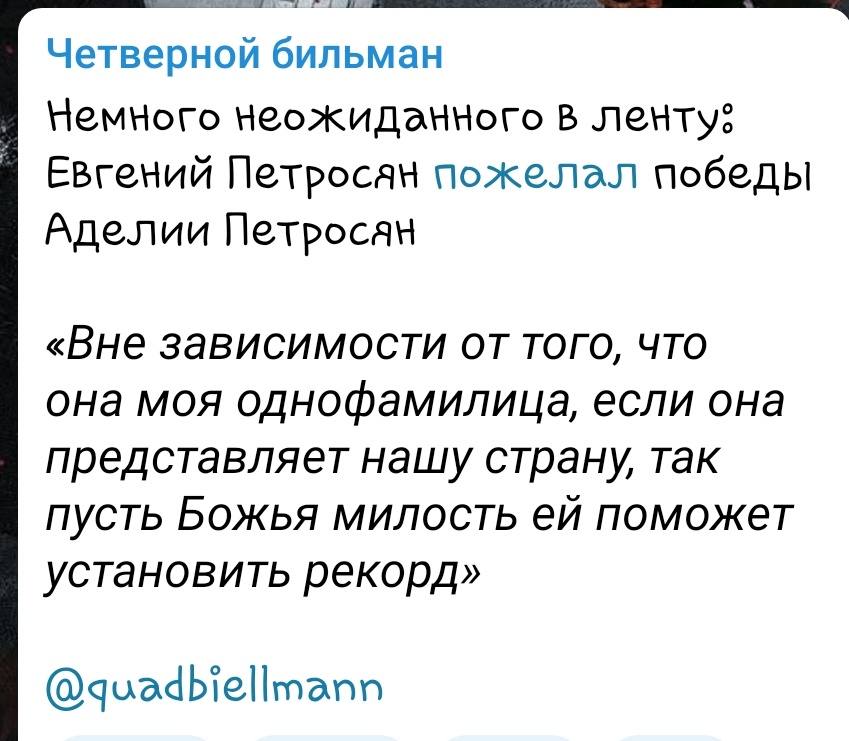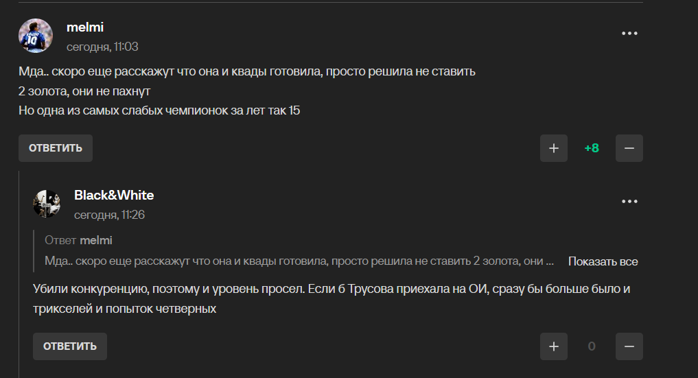 >>3296009 Наоборот там одни комментарии с поддержкой петросяна. Да и всегда так было. Хейтят только Алину, да и то за её деятельность после завершения карьеры