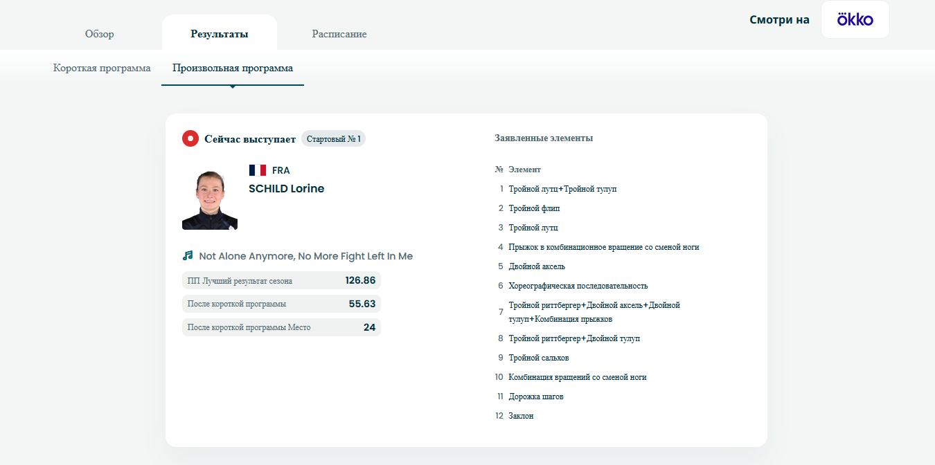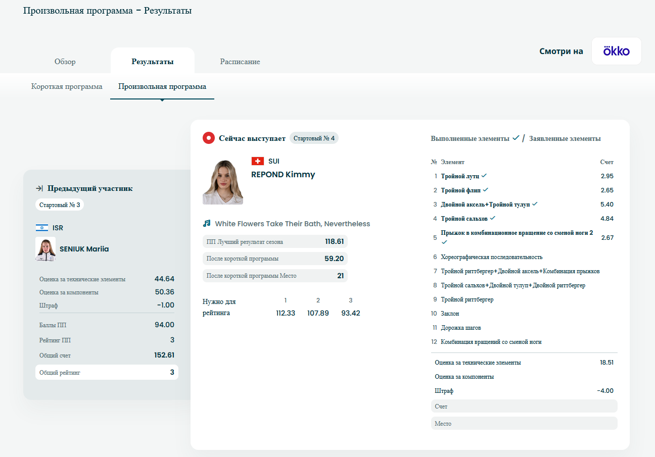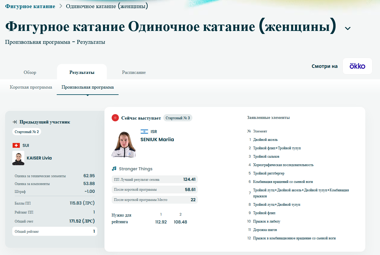 Так на ОИ как раз названий элементов (или их уровни) - и не показывают. Там просто базовая стоимость элемента в баллах и плюс или минус за качество в табличке висит. Проф болельщикам название конечно и не нужно - они и так видят кто что прыгнул - да и стоимость элементов знают наизусть. Но в принципе это не так и важно. Там в оценке больше всего решает рейтинг фигуриста. Той же Сакомото считай баллов 20 просто за выход на лёд дают (например за прыжки она будет получать гигантские надбавки за качество - даже если там обычное качество) - так что она может на расслабончике катать дешёвый лёгкий контент, с которого хрен упадешь - и выигрывать. А другие должны жопу рвать. Вот так этот "спорт" и работает. И поэтому Сакамото такие высокие шансы на победу дают. Т.к. титул 3-х кратной чемпионки мира и т.д.