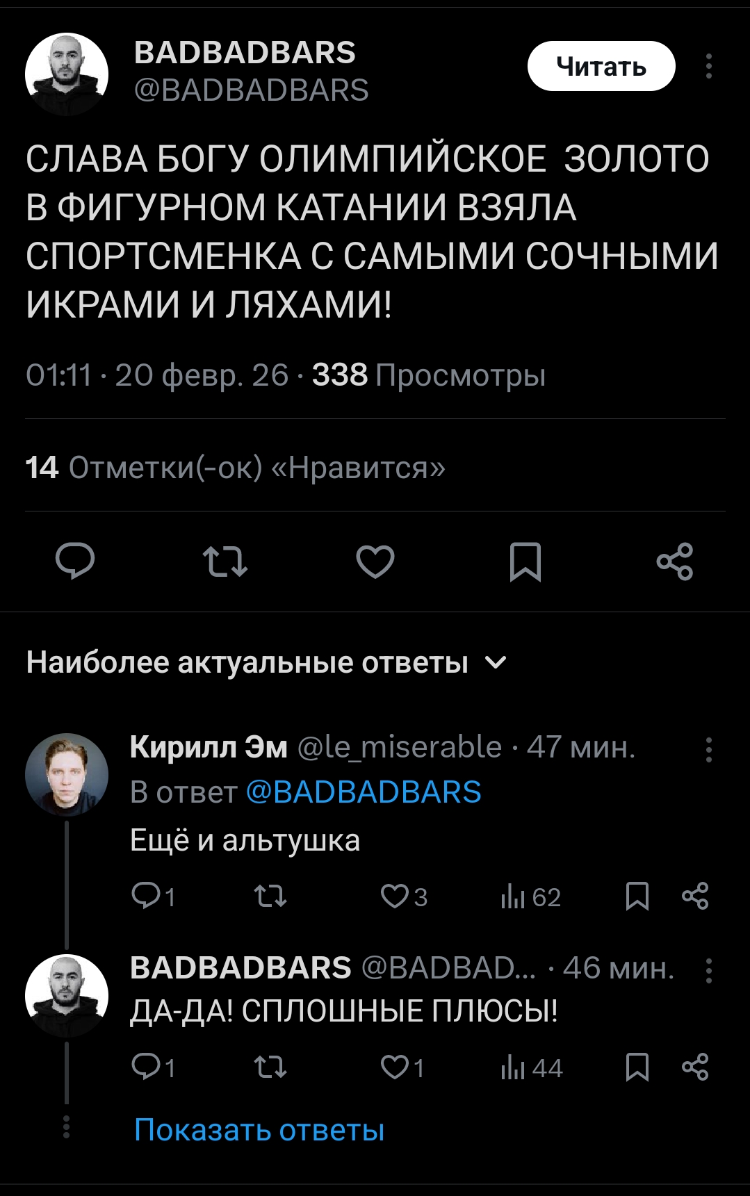 >>3296071 >за Трусика было обиднее Эта вообще самая мразота. Хотя Щербакова тоже сучара, строящая из себя овечку, Валиева в ТГ канале всякие анальные фокусы роскомнадзора оправдывала. Только Петя Гуменник няша короче