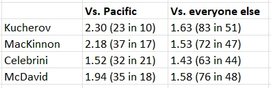 Глянул, что у вас там в пацифике. Лучше всех дела у Анахайма за счет побед в основное время. У ЛА хуже: (допустим) при равенстве очков в будущем у них худший тайбрейк по победам. У Сан Хосе хорошие шансы пока. 3 игры в запасе до Вегаса при -6 очков. К сожалению, проигрывают чаще, чем они.