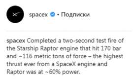 Ну вот так вот:Илон Маск обьявил о новом рекорде среди ракетных двигателей. Полетный вариант нового двигателя Raptor достиг рекорных 268.9 бар давления в камере сгорания, что превышает текущий рекорд среди РД в 267 бар поставленный в далеких 90-х двигателем РД-180.