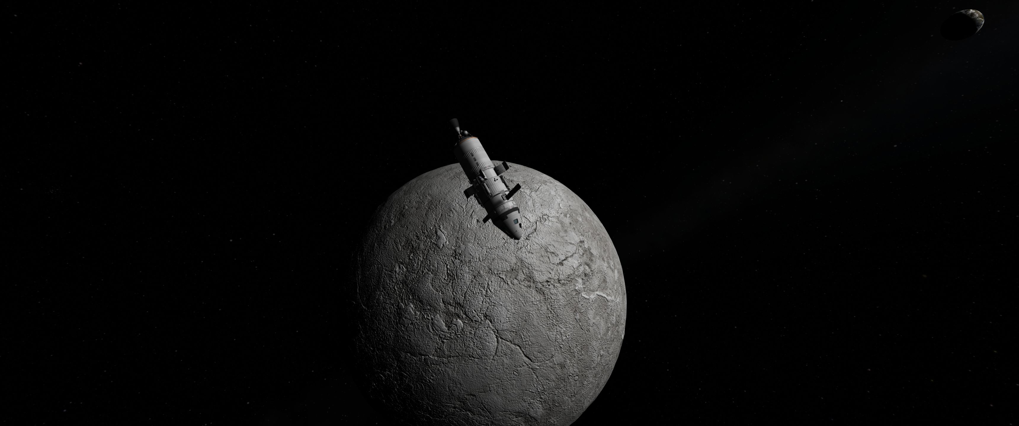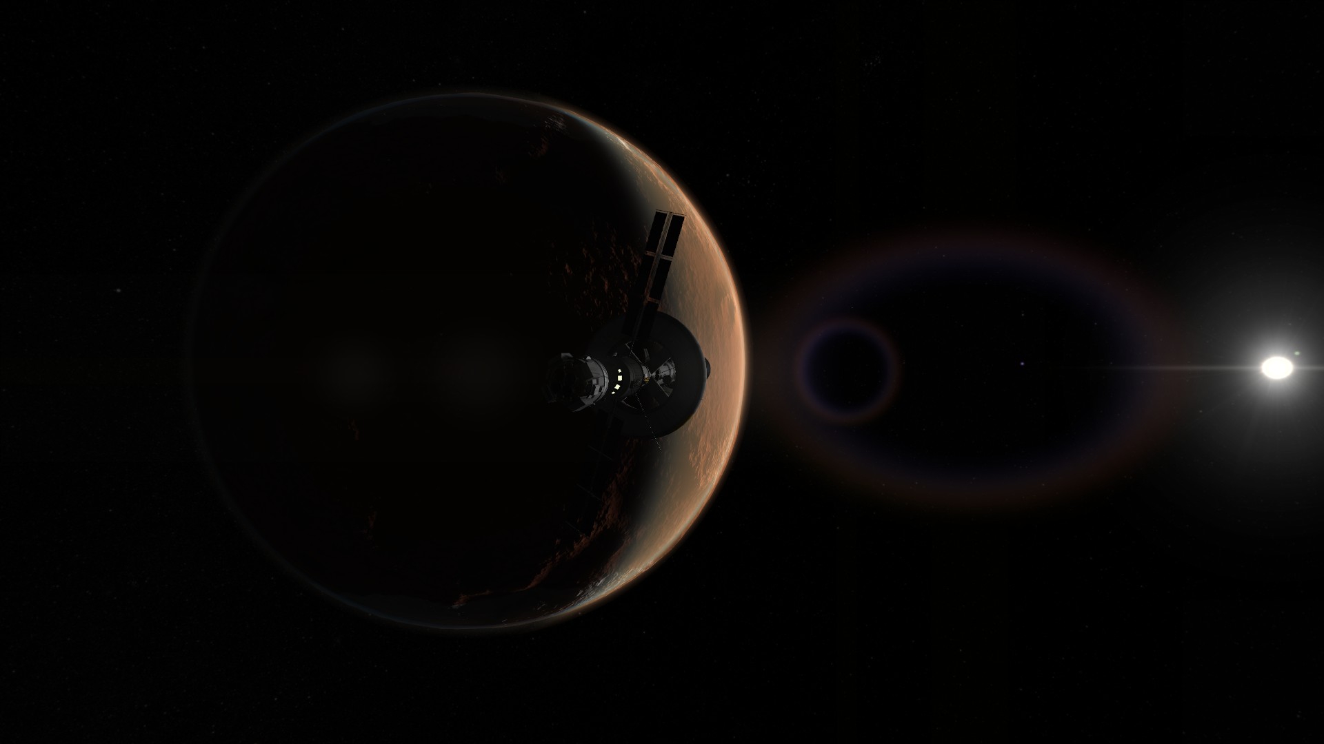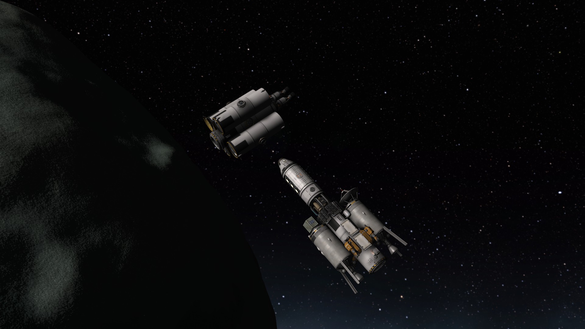 Взлетаем ночью, чтобы попасть в плоскость корабля, поэтому не стал фоткать. Стыкуемся обратно в грузовой отсек, перетаскиваем весь грунт в корабль, отцепляем посадочную лохань и готовимся к разгону обратно.