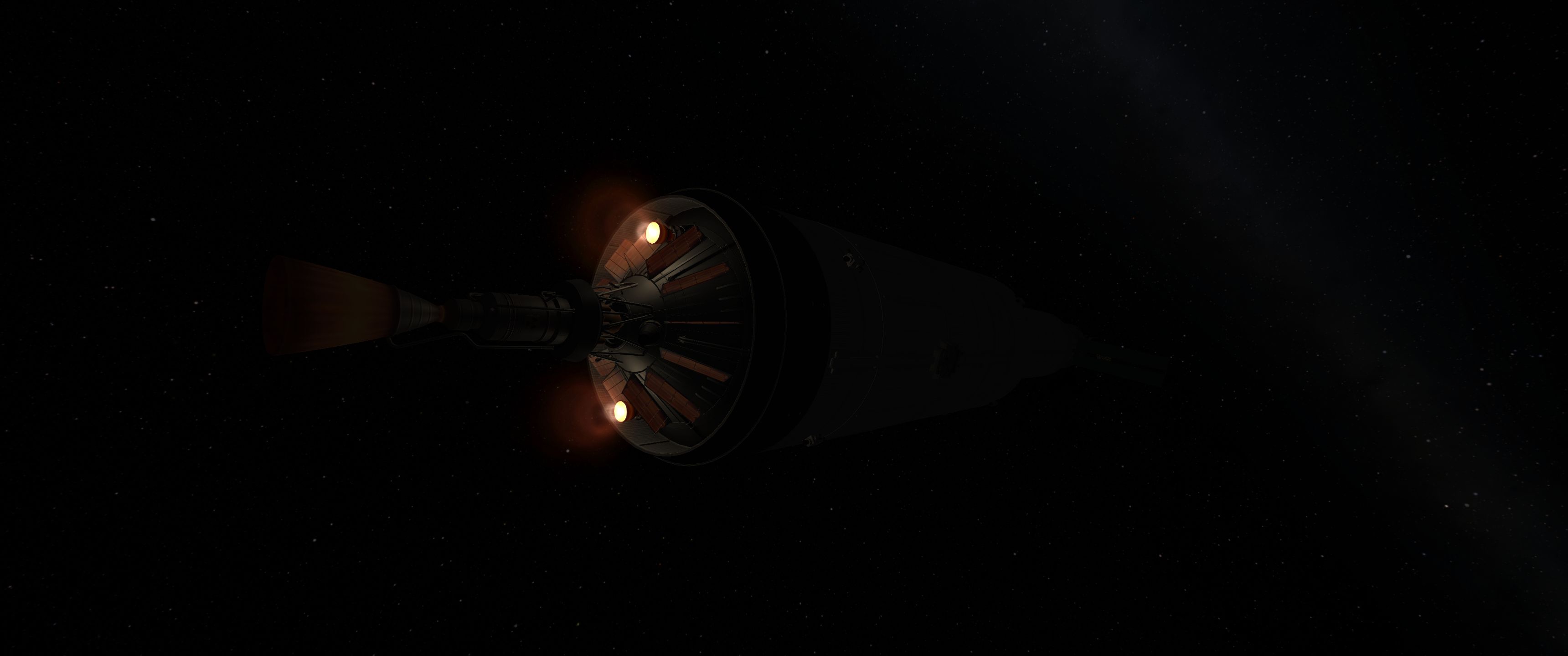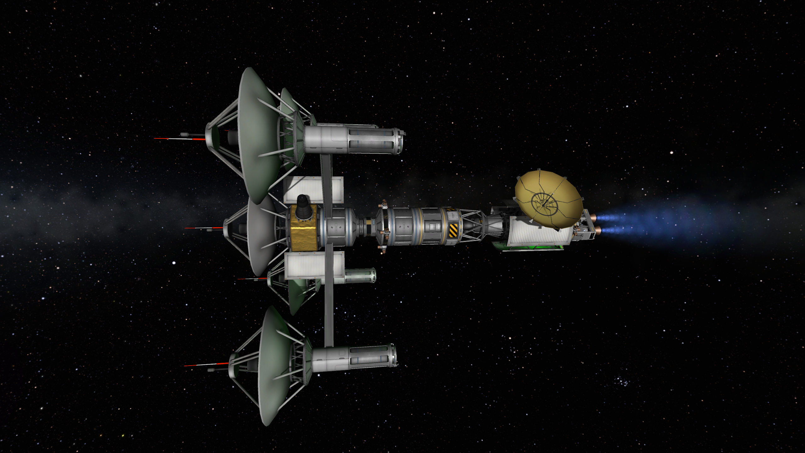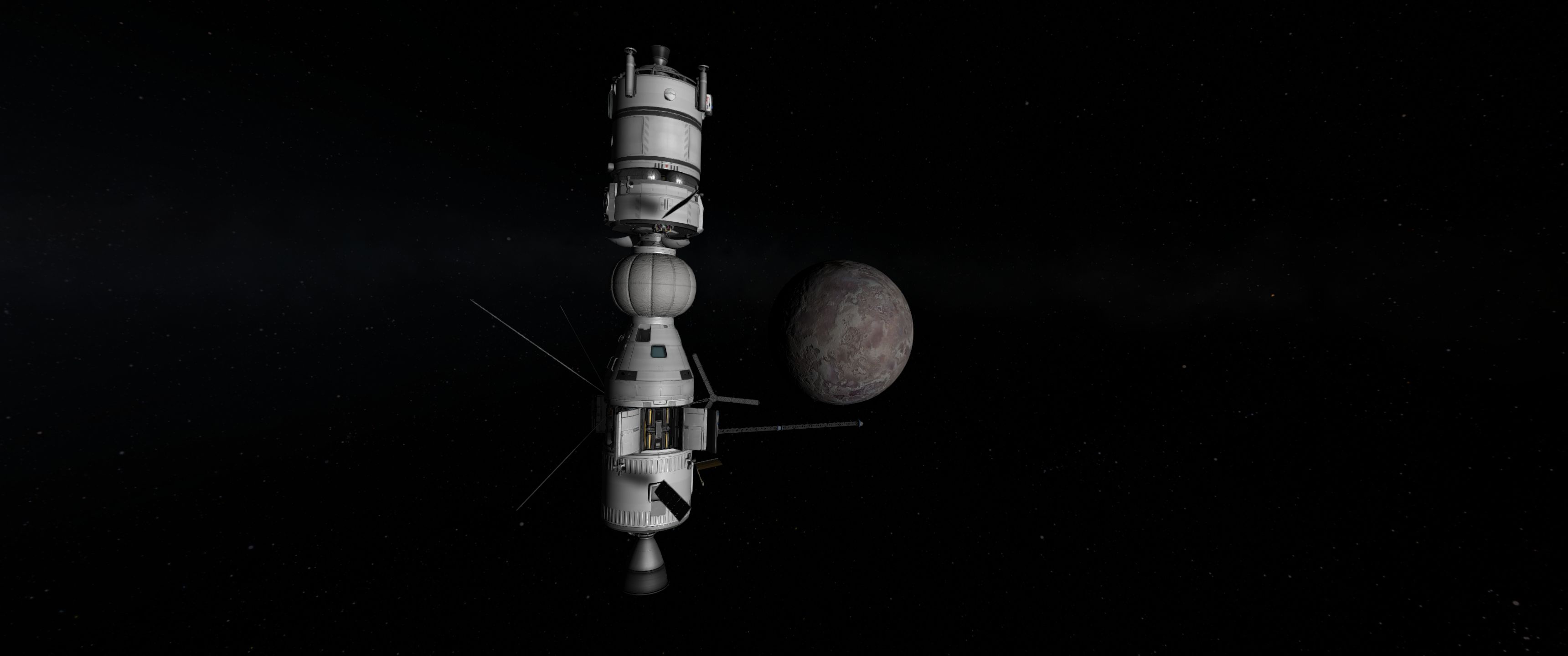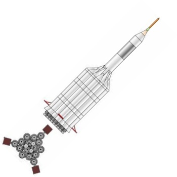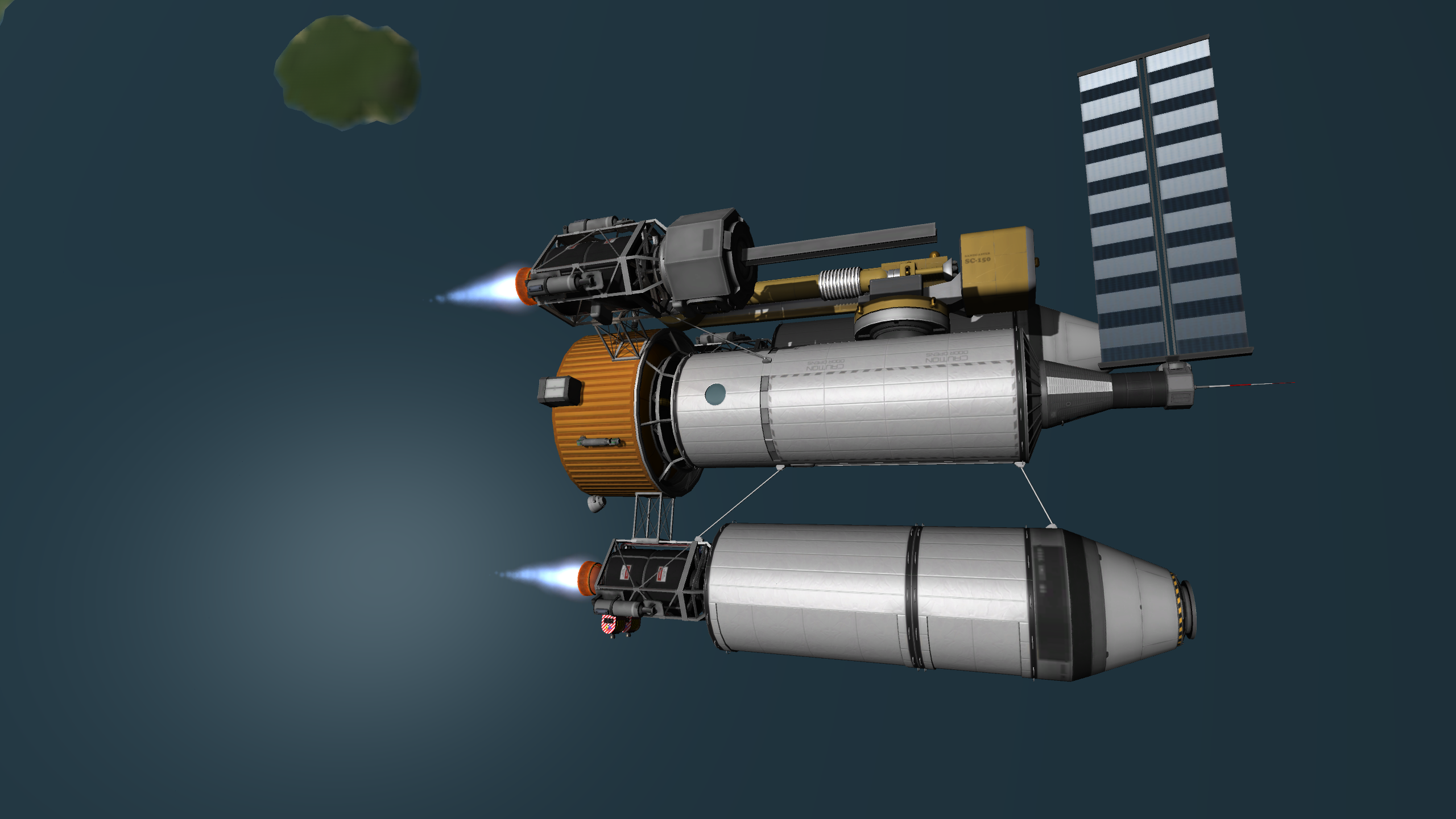 Компонуем межплонетный корабль на 4 рыла. Сверху вниз: служебный отсек возвращаемой капсулы, сама капсула с теплощитом, инструментальный отсек, командный отсек, научно-лабораторный, жилой (с топливными баками коррекционных двигателй в стенках для защиты от солнечных вспышек, см. Storm Cellar). Дальше грузовой отсек с двухместным посадочным кораблём, бак с водородом, ну и силовая установка: маршевый ядерный дрыгатель, два маломощных жидкотопливных для коррекций, два малых реактора и набор радиаторов для охлаждения. Итого получилось 200 тонн. Выводим всё это на орбиту свеженькой 250-тонной ракетой, потом выводим и цепляем боковые баки, две штуки по 120 тонн.