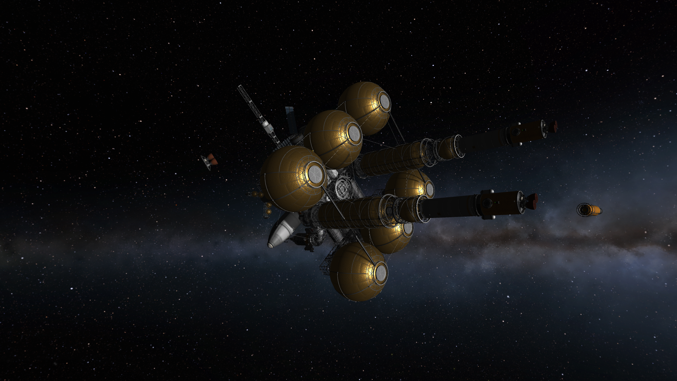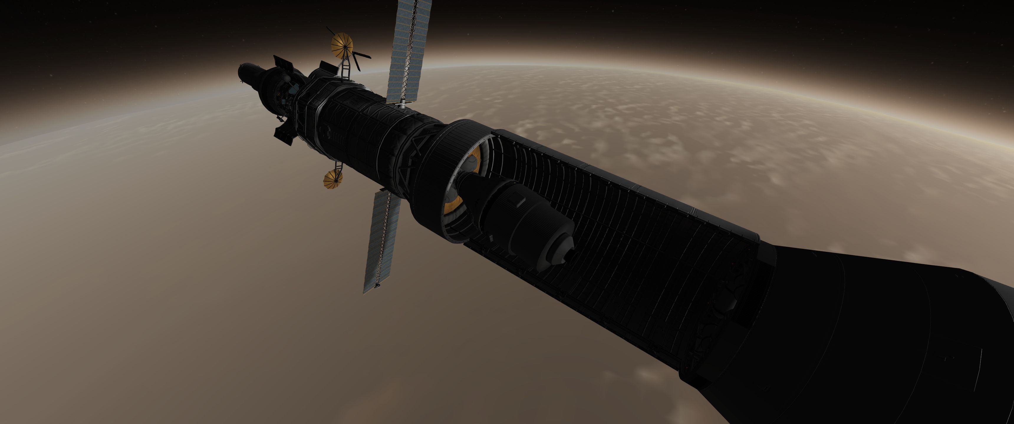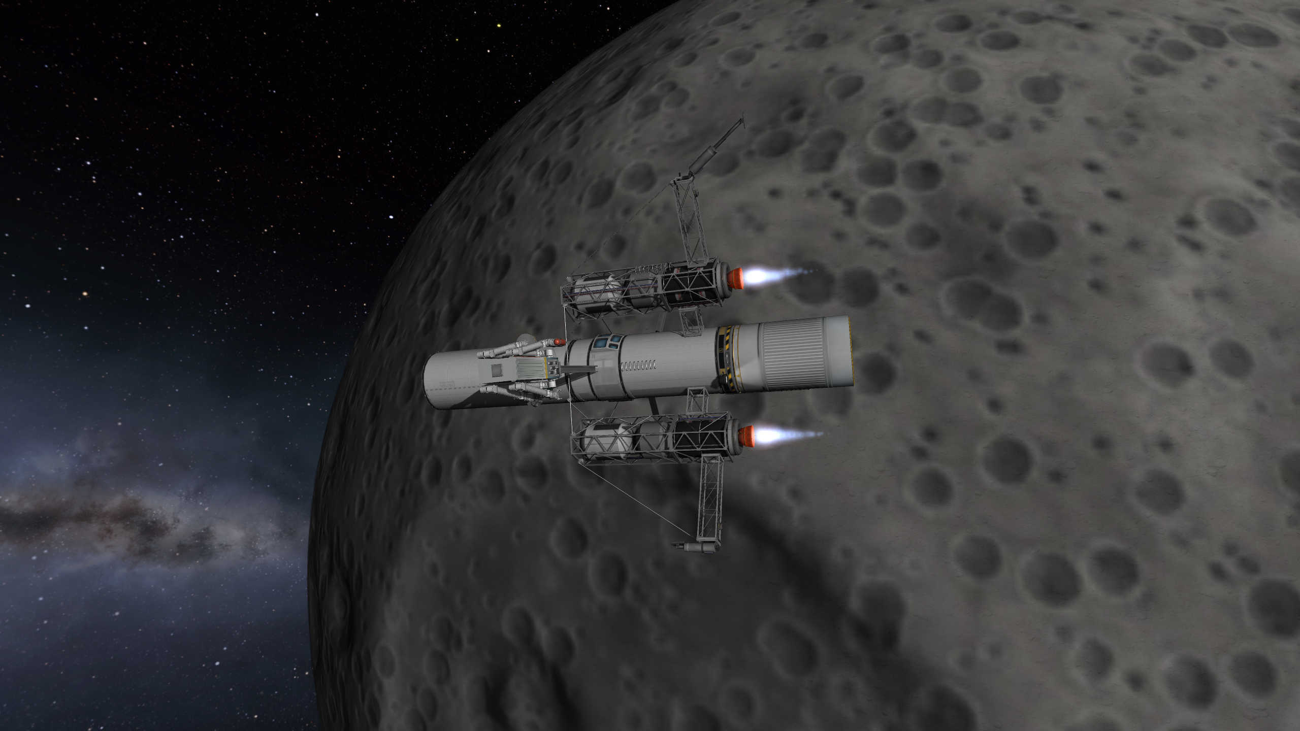 Компонуем межплонетный корабль на 4 рыла. Сверху вниз: служебный отсек возвращаемой капсулы, сама капсула с теплощитом, инструментальный отсек, командный отсек, научно-лабораторный, жилой (с топливными баками коррекционных двигателй в стенках для защиты от солнечных вспышек, см. Storm Cellar). Дальше грузовой отсек с двухместным посадочным кораблём, бак с водородом, ну и силовая установка: маршевый ядерный дрыгатель, два маломощных жидкотопливных для коррекций, два малых реактора и набор радиаторов для охлаждения. Итого получилось 200 тонн. Выводим всё это на орбиту свеженькой 250-тонной ракетой, потом выводим и цепляем боковые баки, две штуки по 120 тонн.