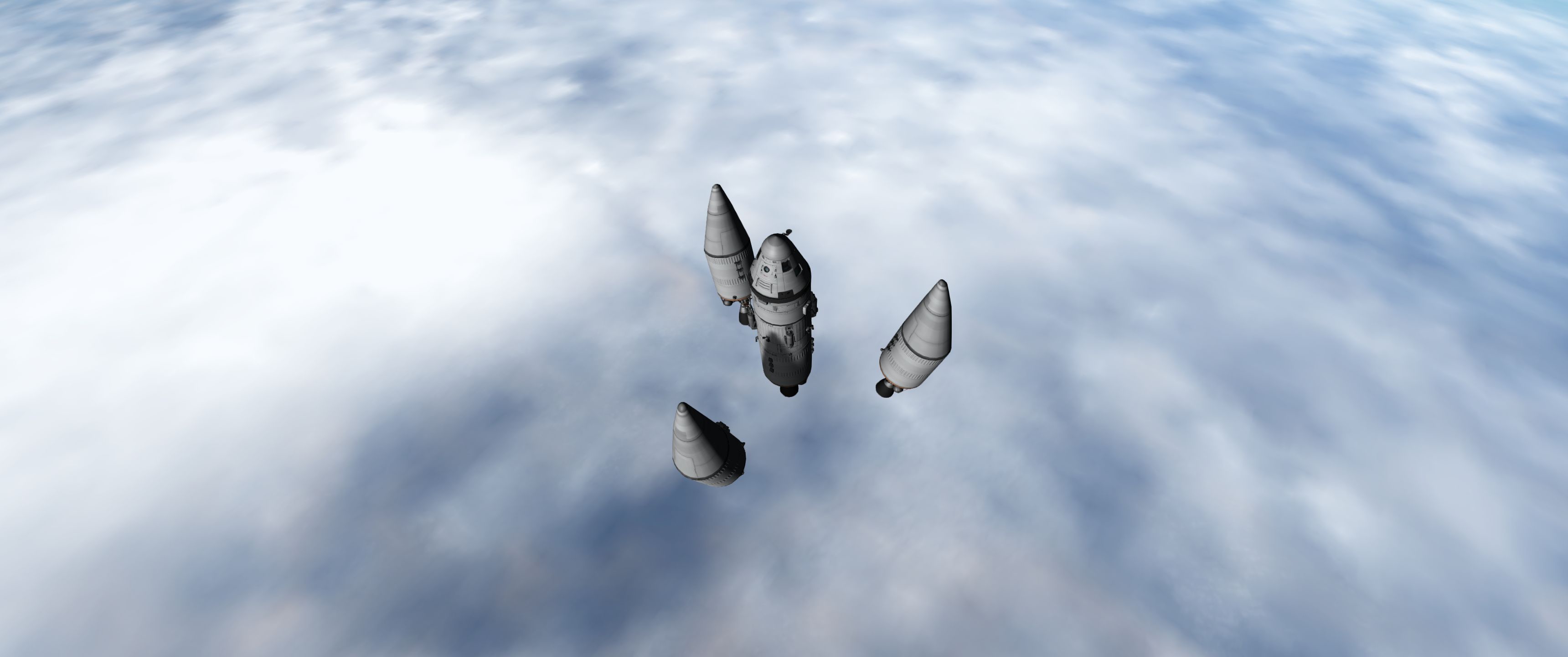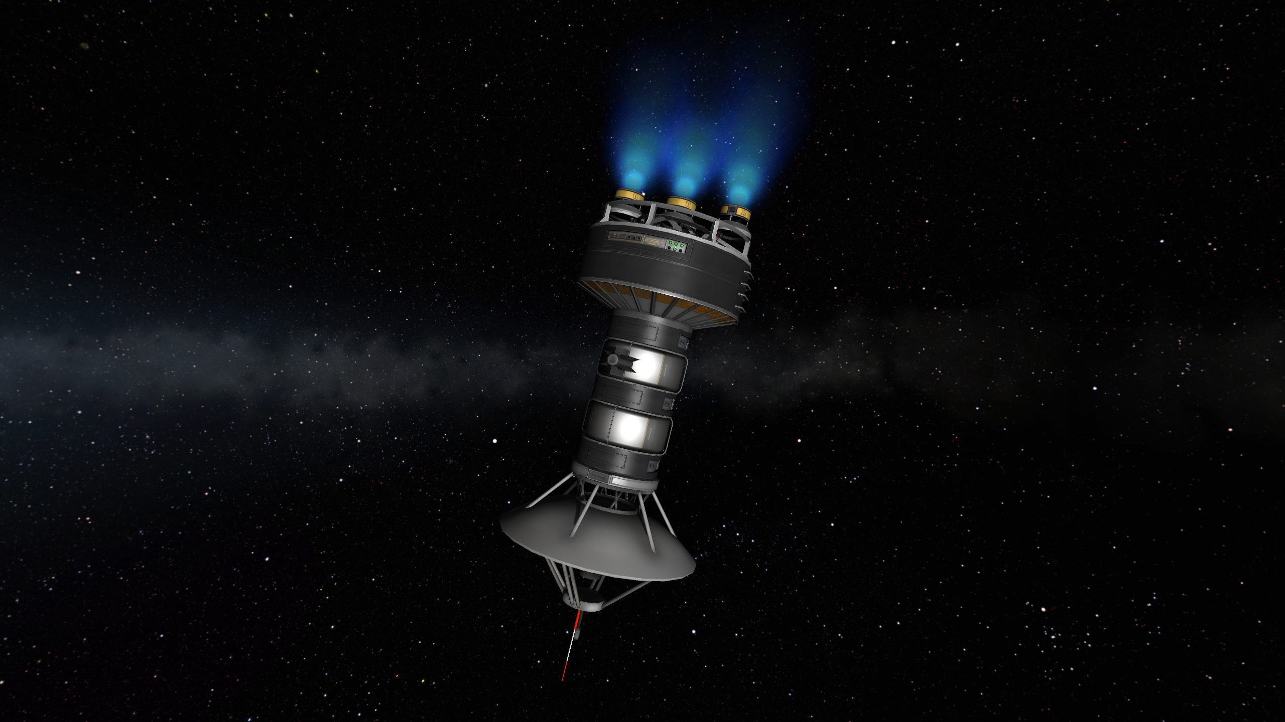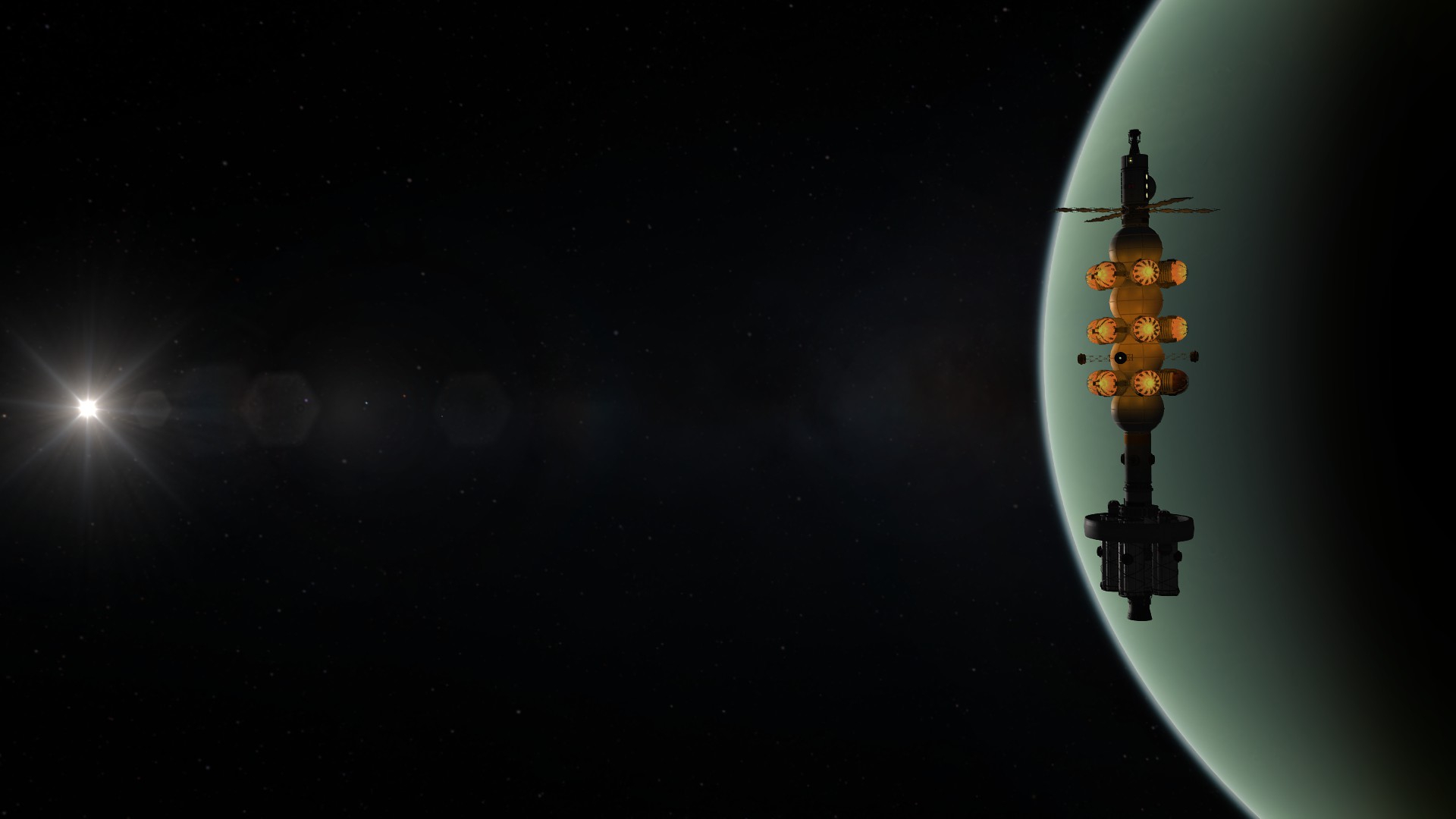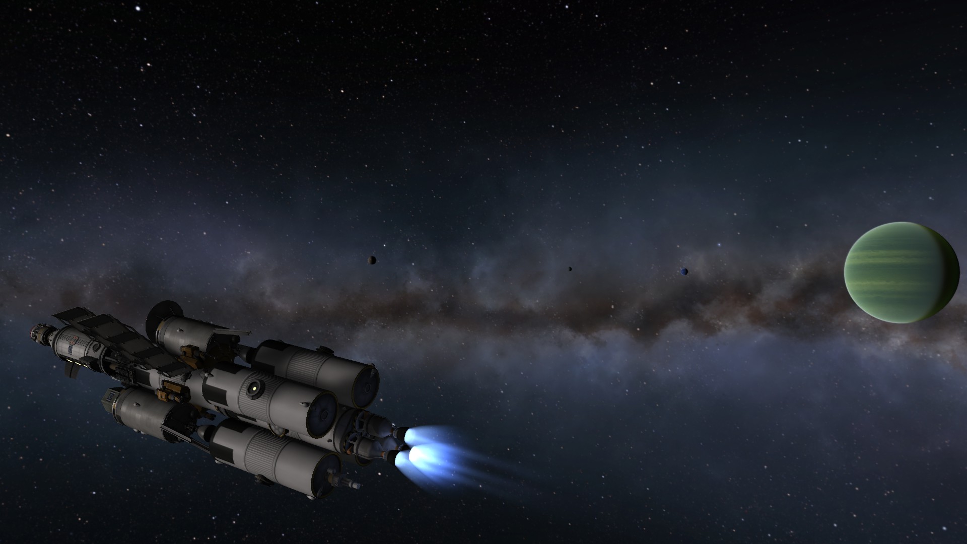 Компонуем межплонетный корабль на 4 рыла. Сверху вниз: служебный отсек возвращаемой капсулы, сама капсула с теплощитом, инструментальный отсек, командный отсек, научно-лабораторный, жилой (с топливными баками коррекционных двигателй в стенках для защиты от солнечных вспышек, см. Storm Cellar). Дальше грузовой отсек с двухместным посадочным кораблём, бак с водородом, ну и силовая установка: маршевый ядерный дрыгатель, два маломощных жидкотопливных для коррекций, два малых реактора и набор радиаторов для охлаждения. Итого получилось 200 тонн. Выводим всё это на орбиту свеженькой 250-тонной ракетой, потом выводим и цепляем боковые баки, две штуки по 120 тонн.