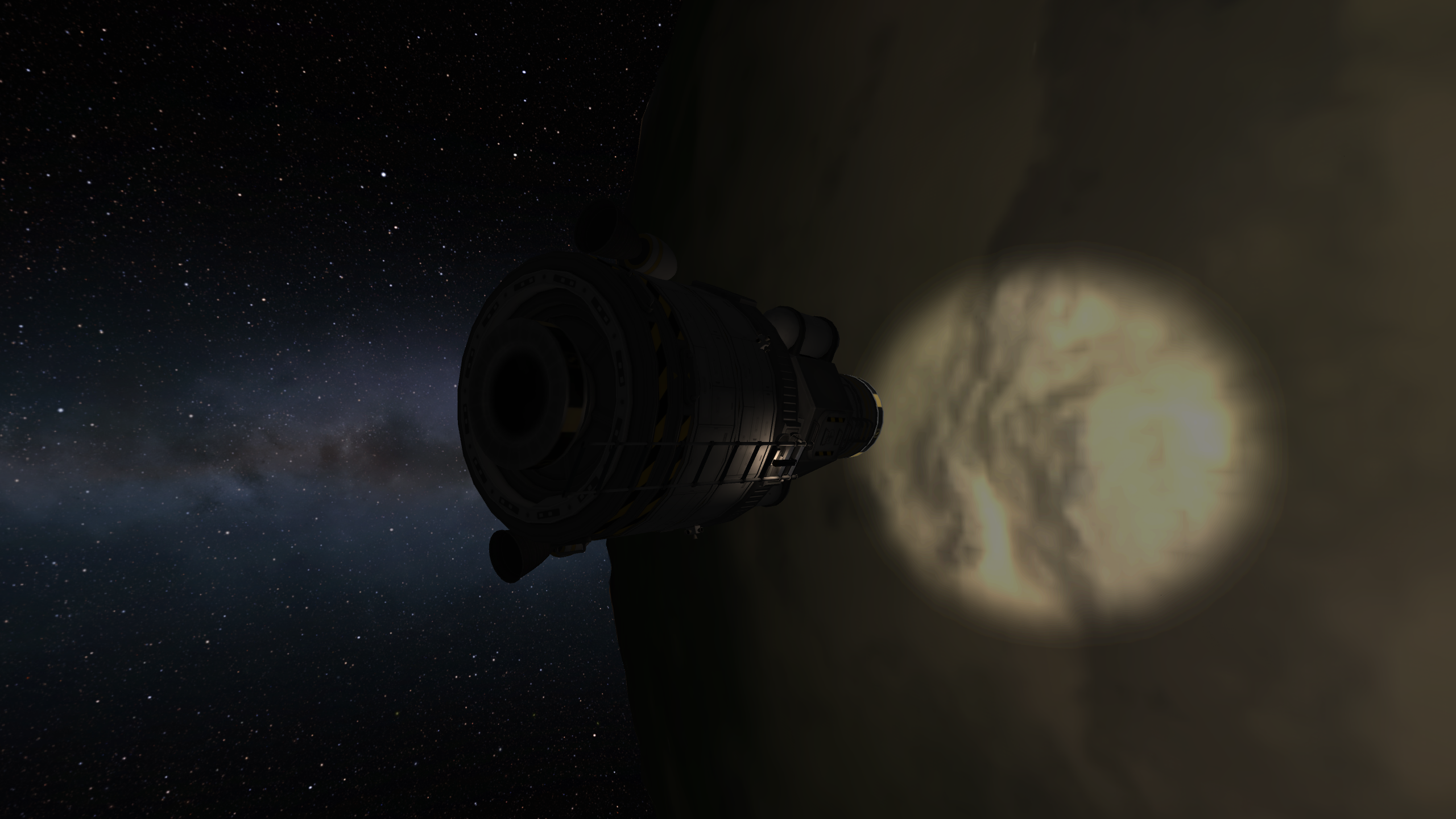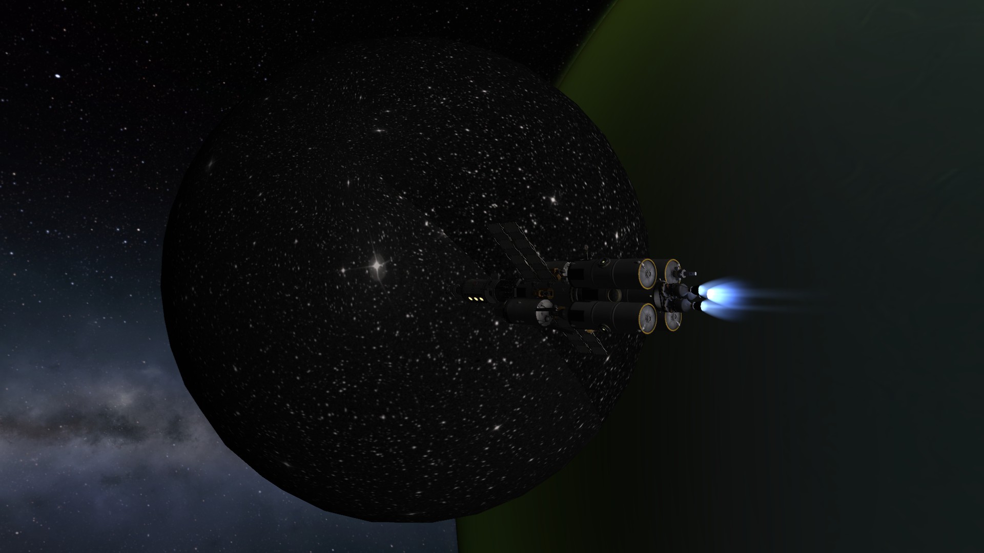 Наконец, прилетаем к Нивену, оттормаживаем тоже в два витка - 1000 и 1500 м/с. Достаём из отсека двухместный посадочный корабль. Полноценный двигатель у него только на взлётной ступени, поэтому свод с орбиты делаем всем большим кораблём. Всё это пришлось делать ночью, поэтому скрин высветлил.