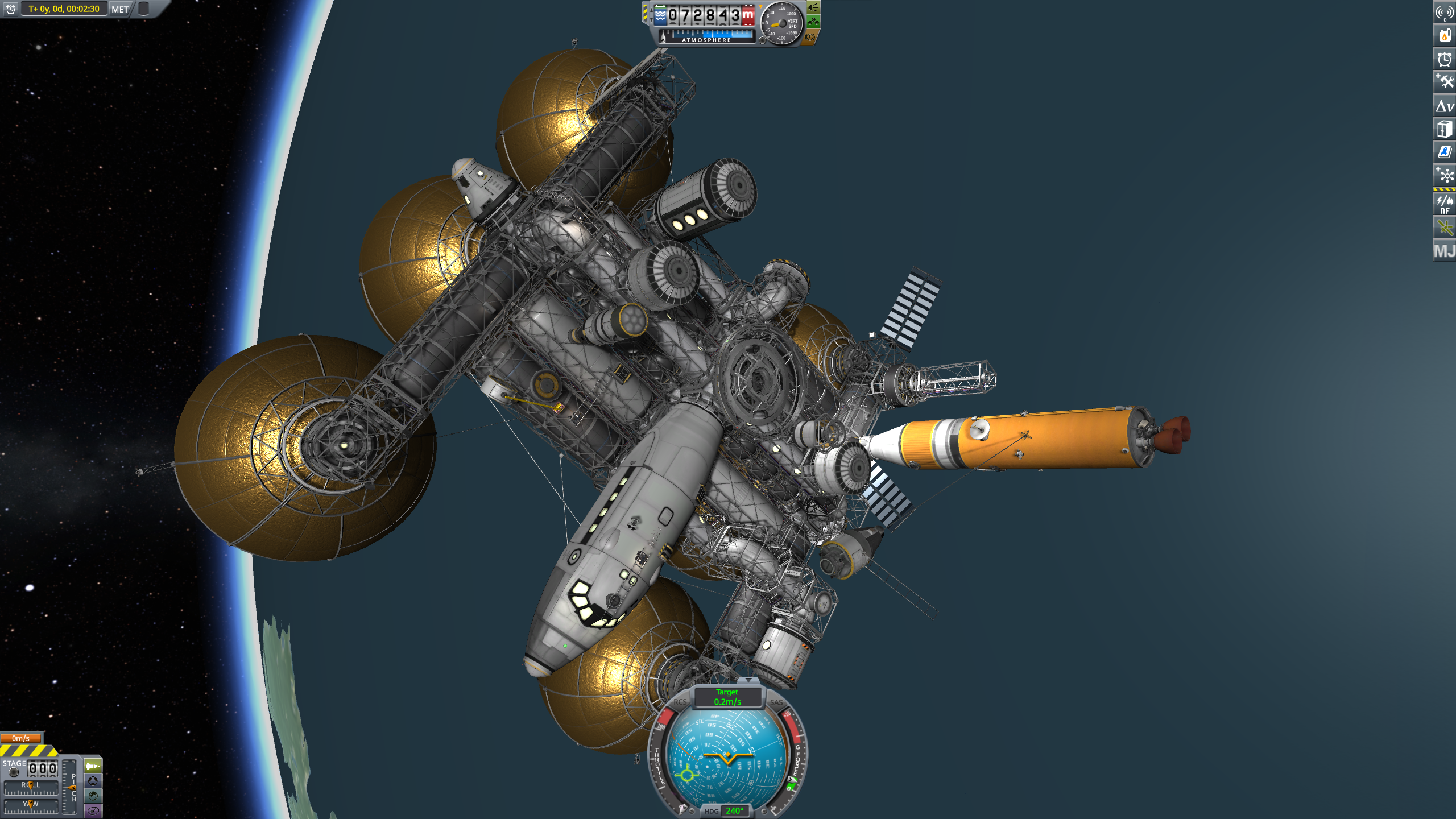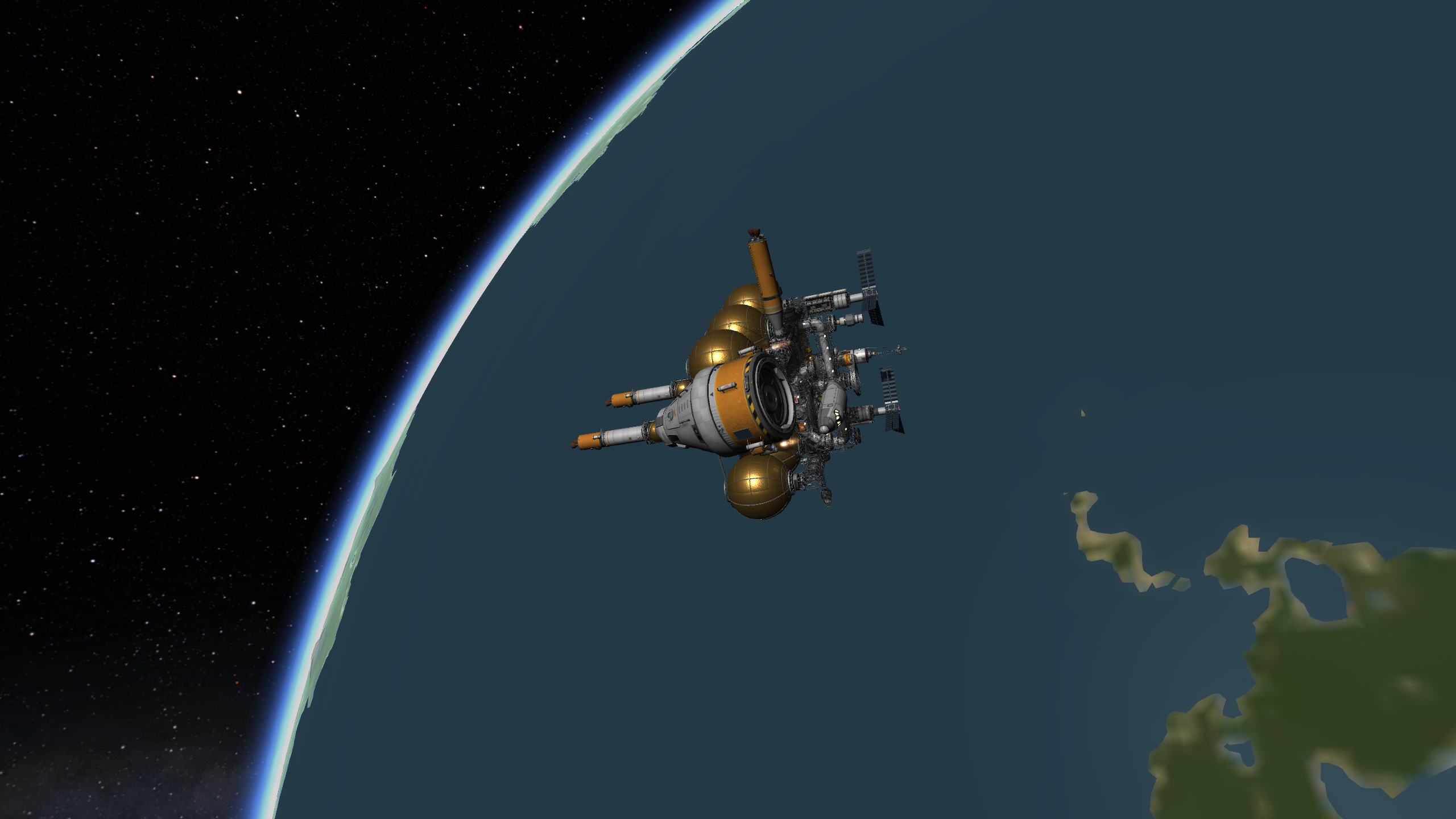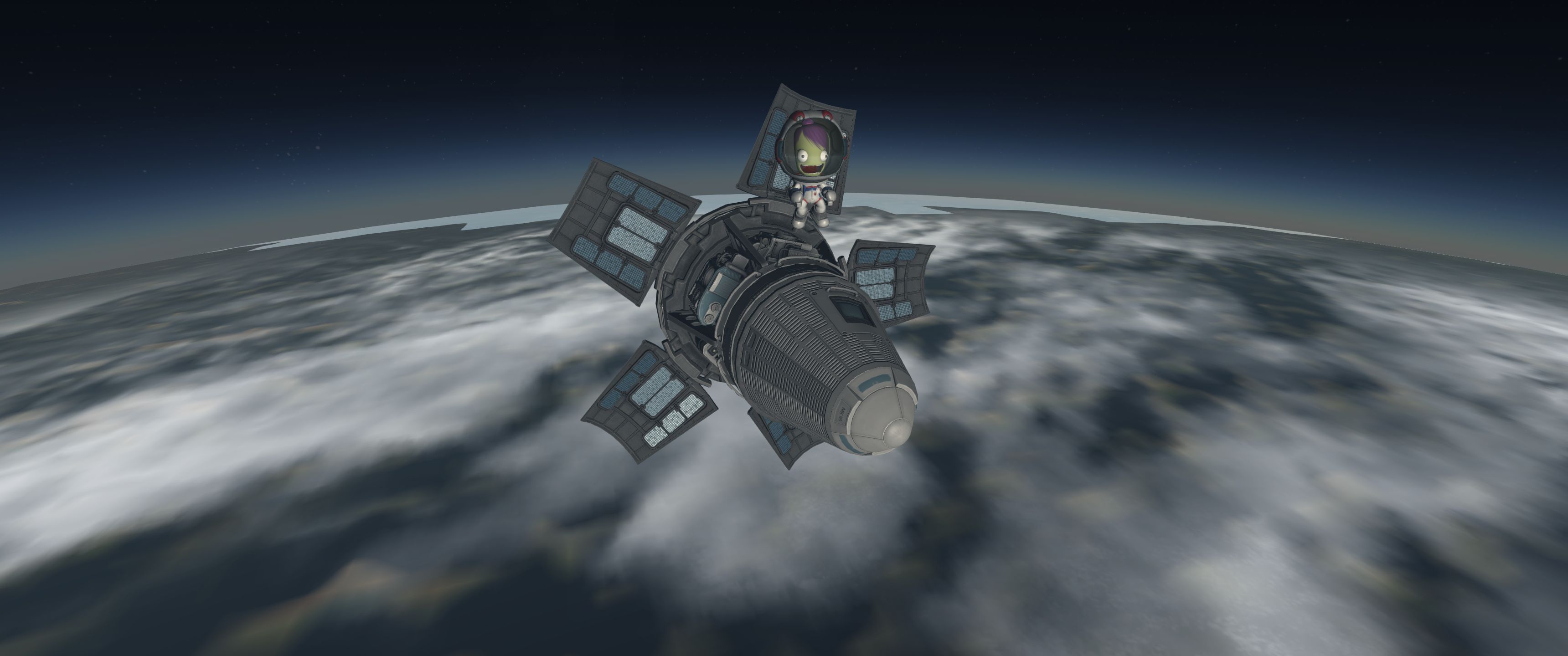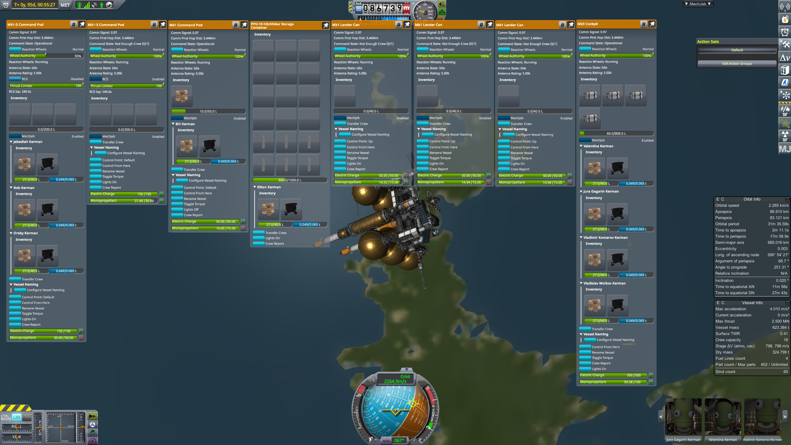 Вторые шаги: лепим четыре УР-200 вместе, добавляем ещё верхнюю одну ступень от неё же и получаем носитель УР-400 на 8 т. В этот бюджет уже можно упихать мини-станцию с кучей научного оборудования и жилым отсеком. Запускаем на полярную орбиту, включаем сканеры, разглядываем родную планету. Когда приходит время возвращаться домой, замечаем, что для полярной орбиты вращение планеты уже не роляет, так что тормозим с честной первой космической. Здеся уже даже САС не хватает, надо дополнять ручным вращением.