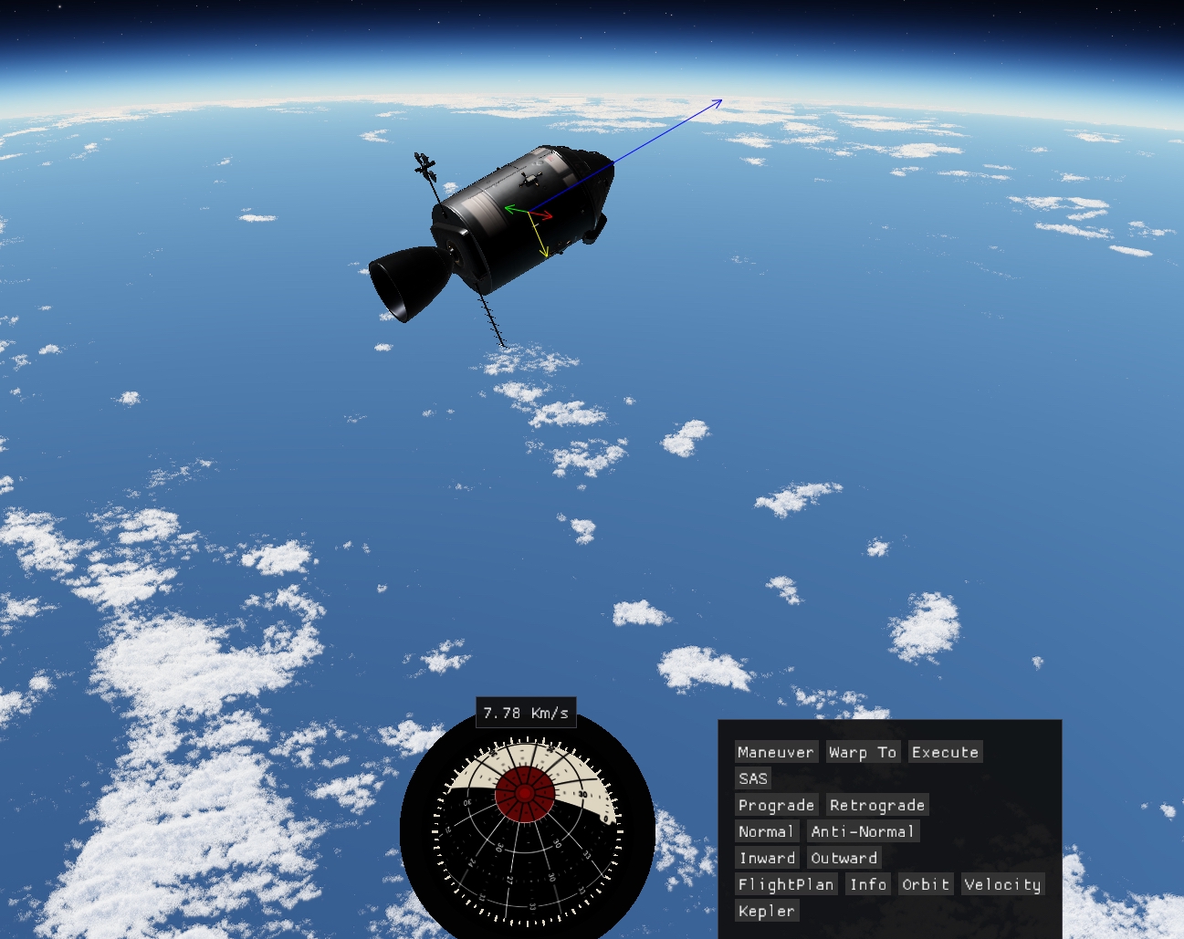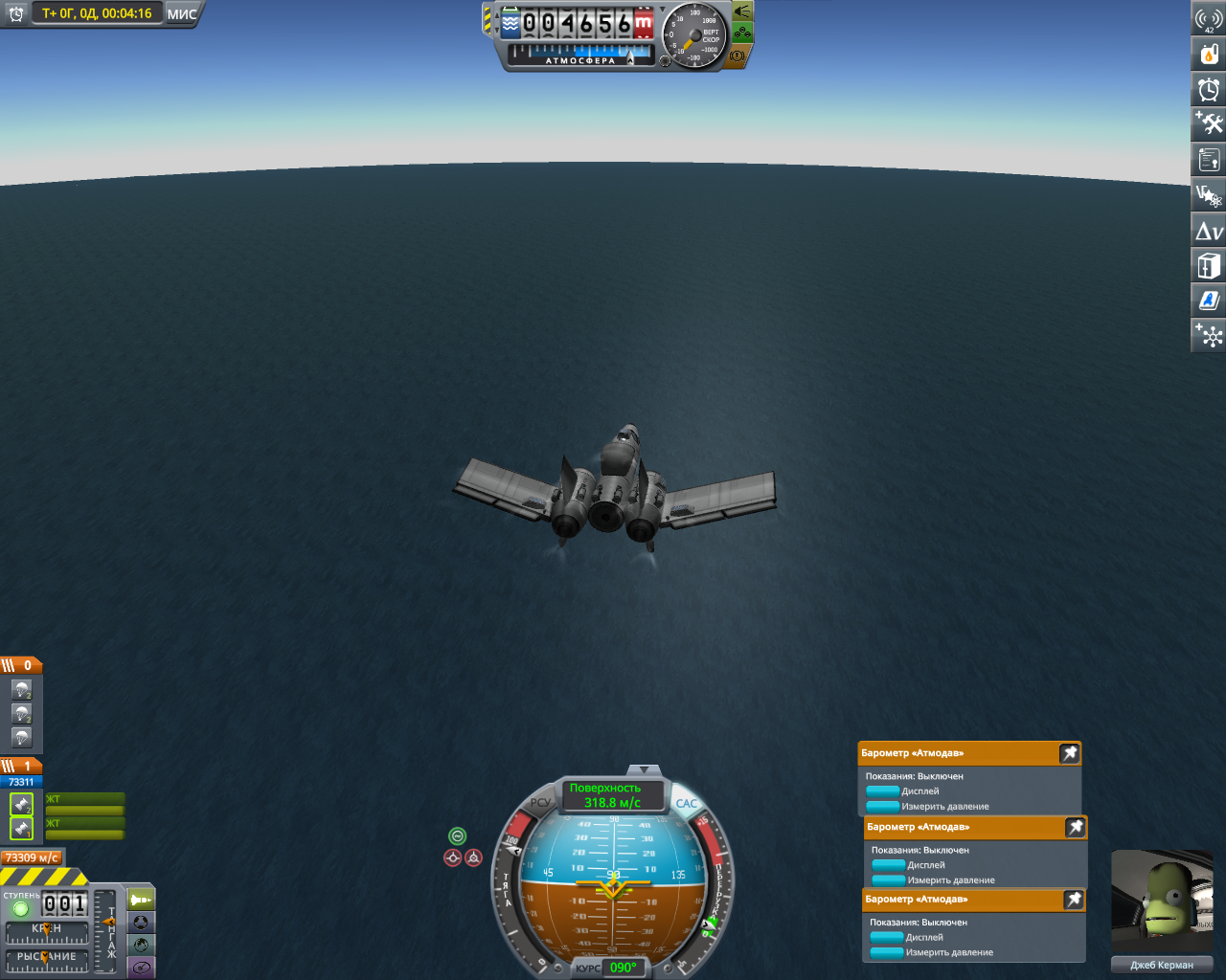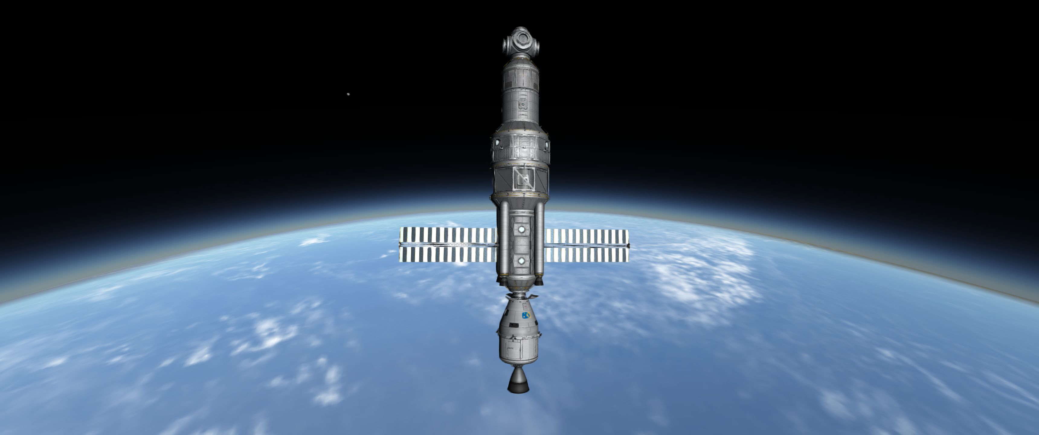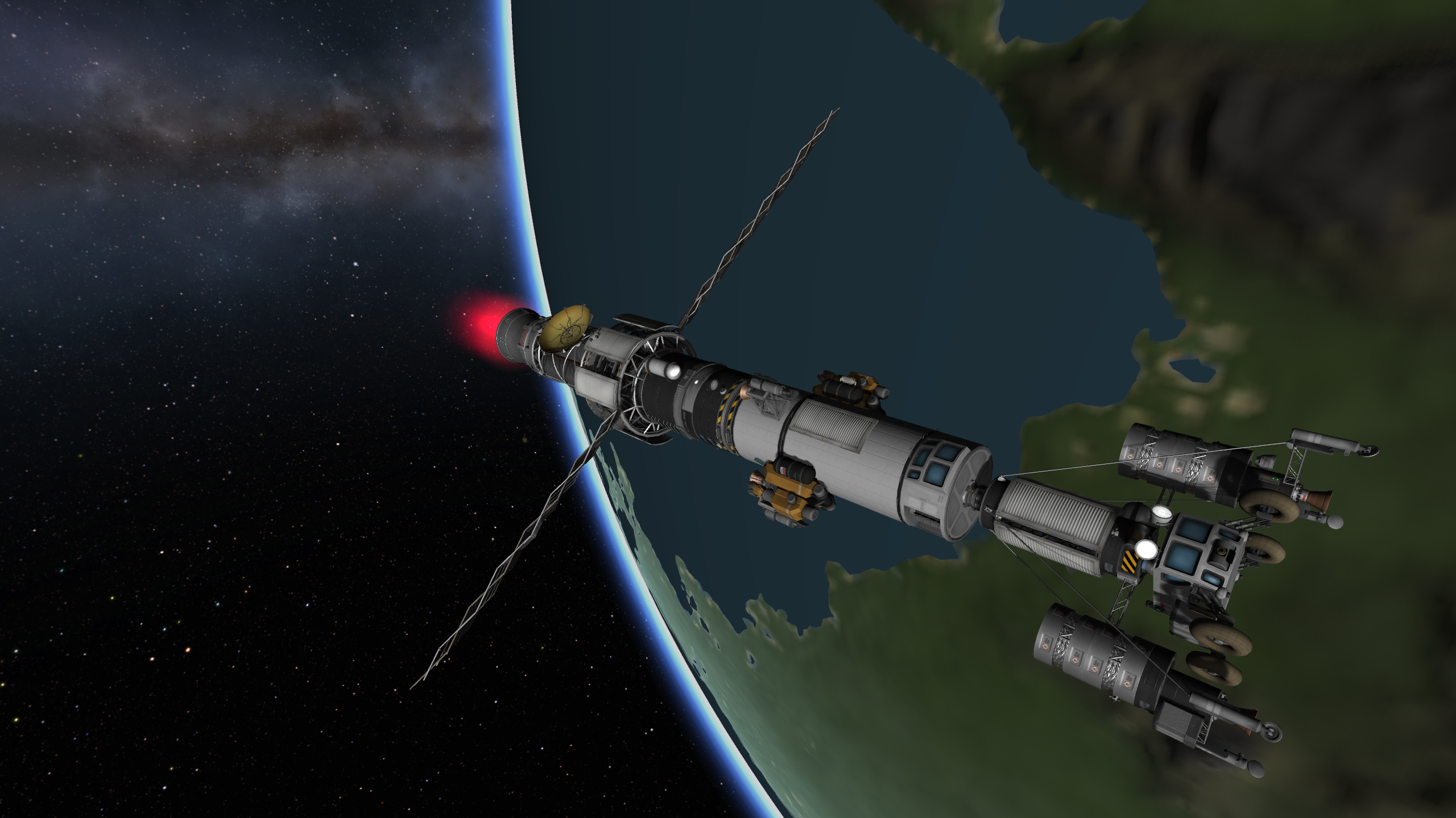 Вторые шаги: лепим четыре УР-200 вместе, добавляем ещё верхнюю одну ступень от неё же и получаем носитель УР-400 на 8 т. В этот бюджет уже можно упихать мини-станцию с кучей научного оборудования и жилым отсеком. Запускаем на полярную орбиту, включаем сканеры, разглядываем родную планету. Когда приходит время возвращаться домой, замечаем, что для полярной орбиты вращение планеты уже не роляет, так что тормозим с честной первой космической. Здеся уже даже САС не хватает, надо дополнять ручным вращением.