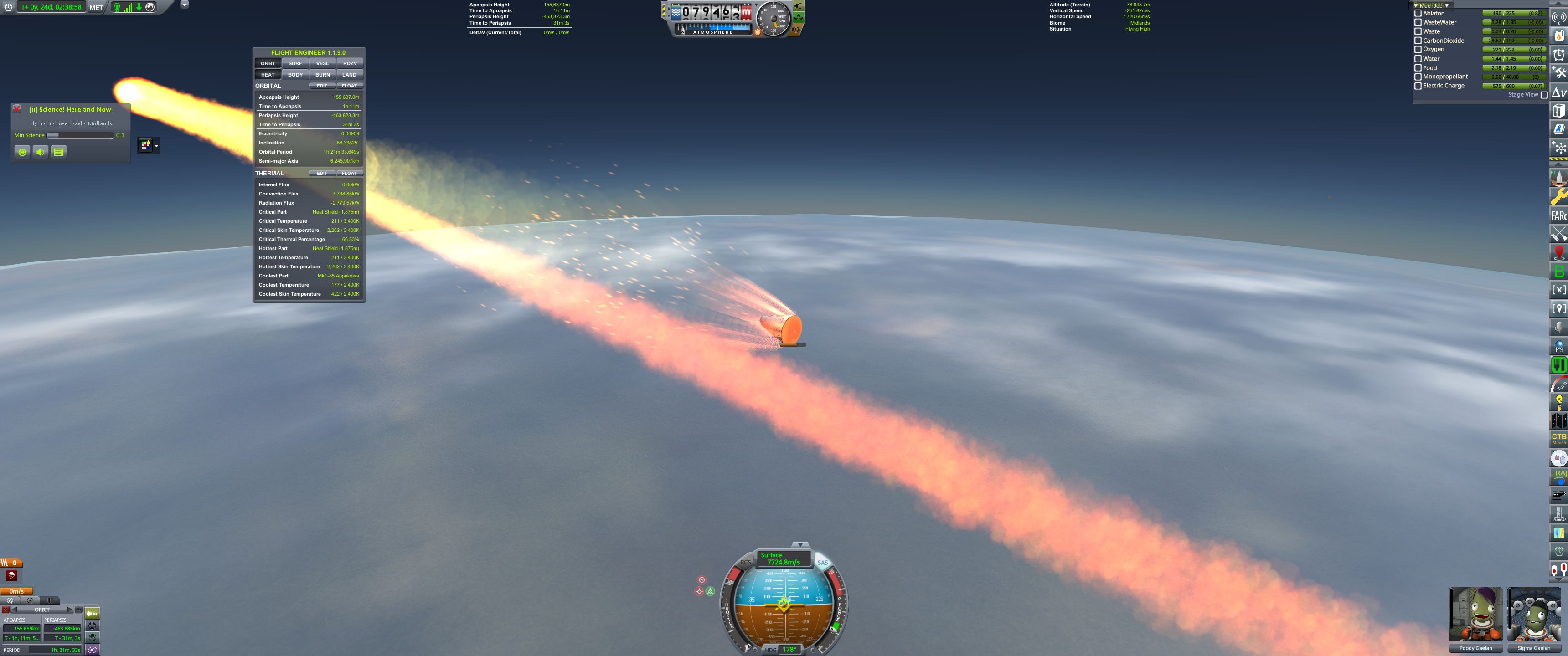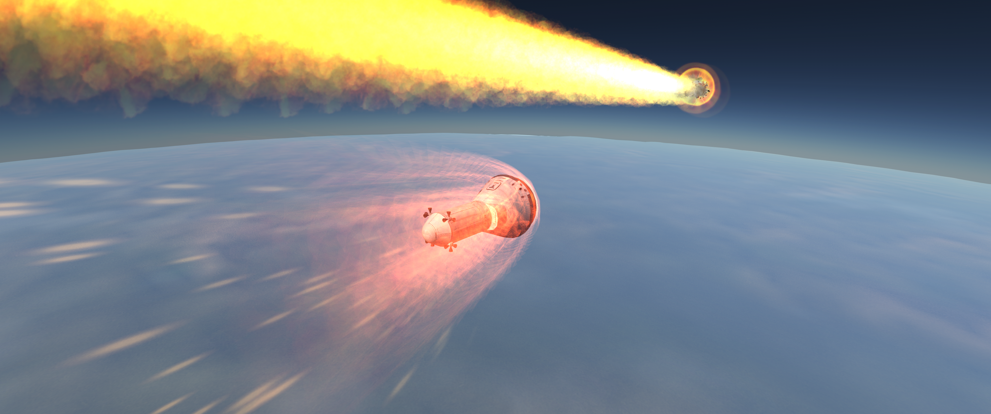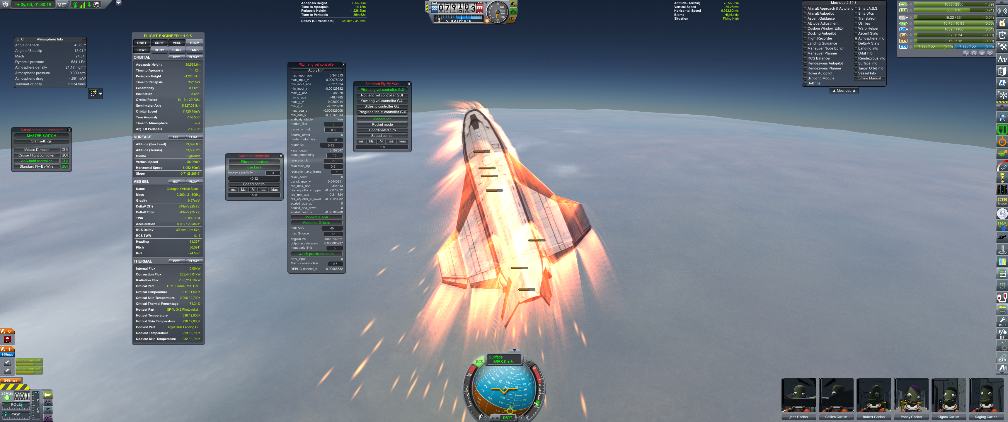 >>788331 На подлёте к Теллумо вытаскиваем огурцов из корабля для фоточек. К сожалению, перицентр полёта был на ночной стороне, так что самого красивого не засняли. Дальше уныло ждём в таймворпе возвращения домой. На подходе к родному Гейлу выкидываем остатки научно-жилого модуля и начинаем suicide burn перед входом в атмосферу. Кое-как сбрасываем скорость с 17 с лихуем до 13.7 км/с.