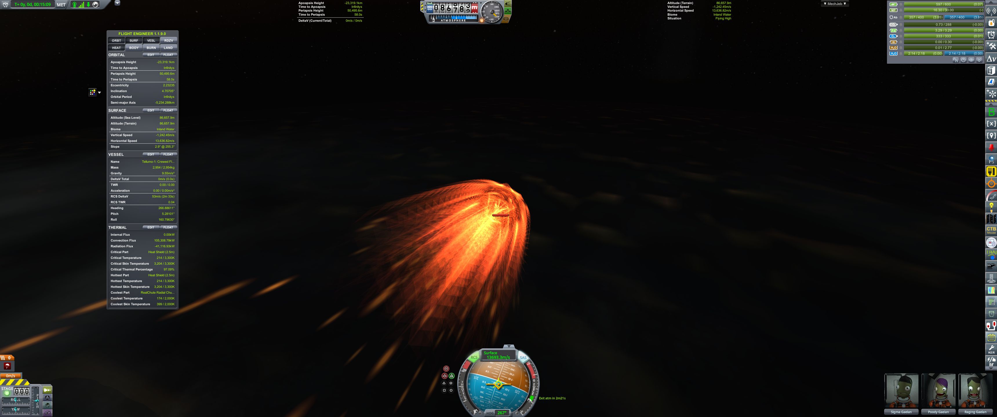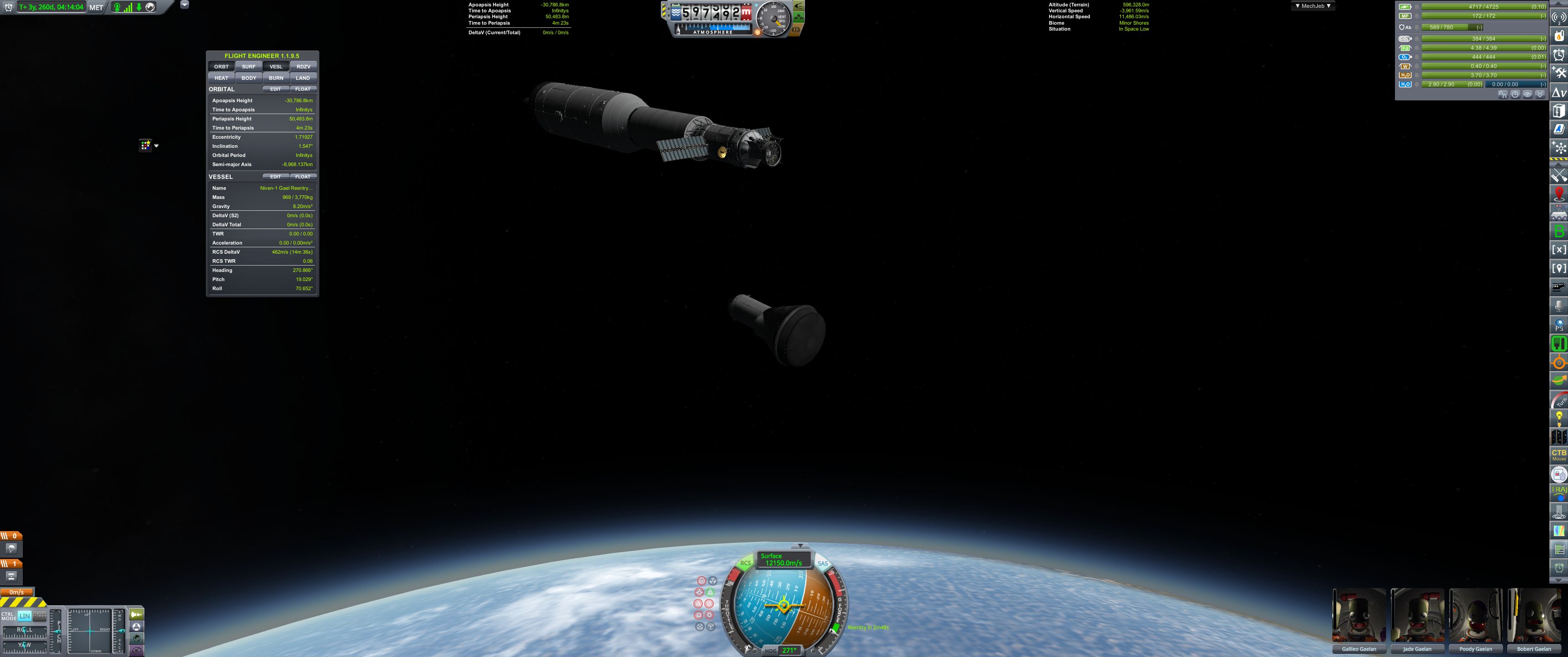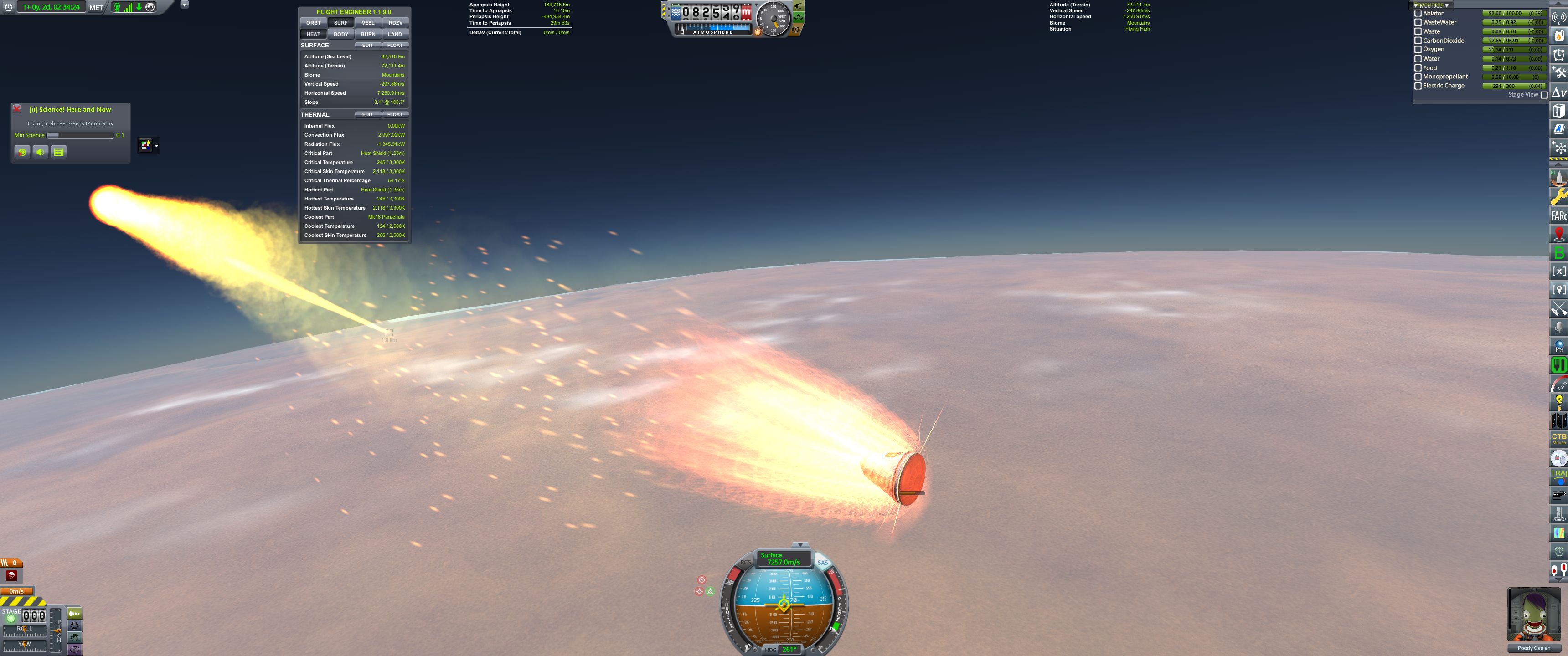 >>788331 На подлёте к Теллумо вытаскиваем огурцов из корабля для фоточек. К сожалению, перицентр полёта был на ночной стороне, так что самого красивого не засняли. Дальше уныло ждём в таймворпе возвращения домой. На подходе к родному Гейлу выкидываем остатки научно-жилого модуля и начинаем suicide burn перед входом в атмосферу. Кое-как сбрасываем скорость с 17 с лихуем до 13.7 км/с.