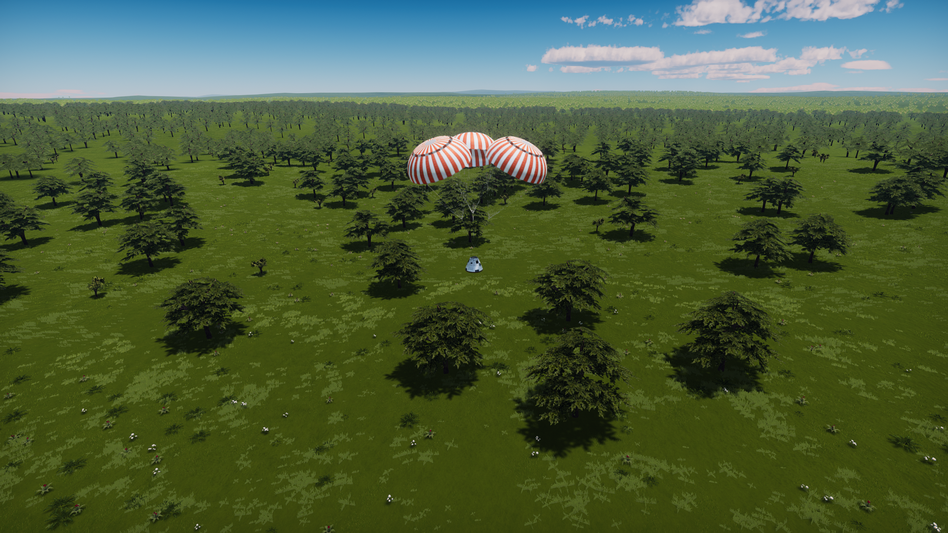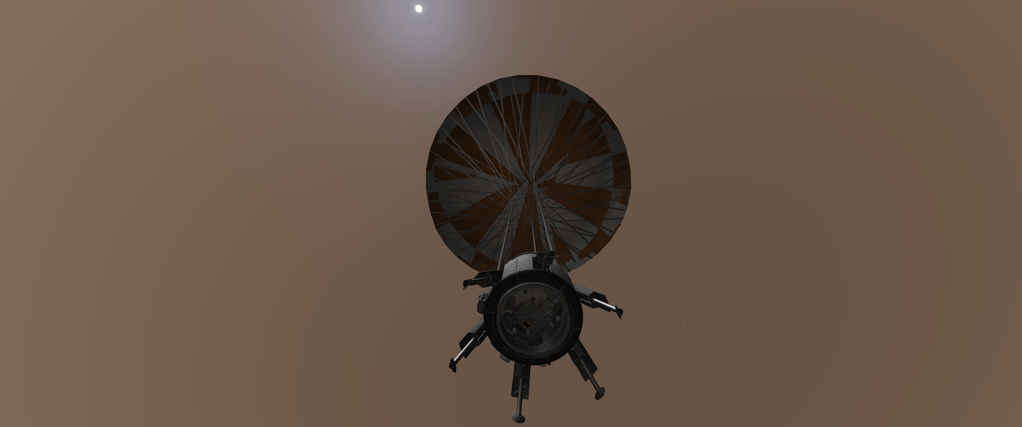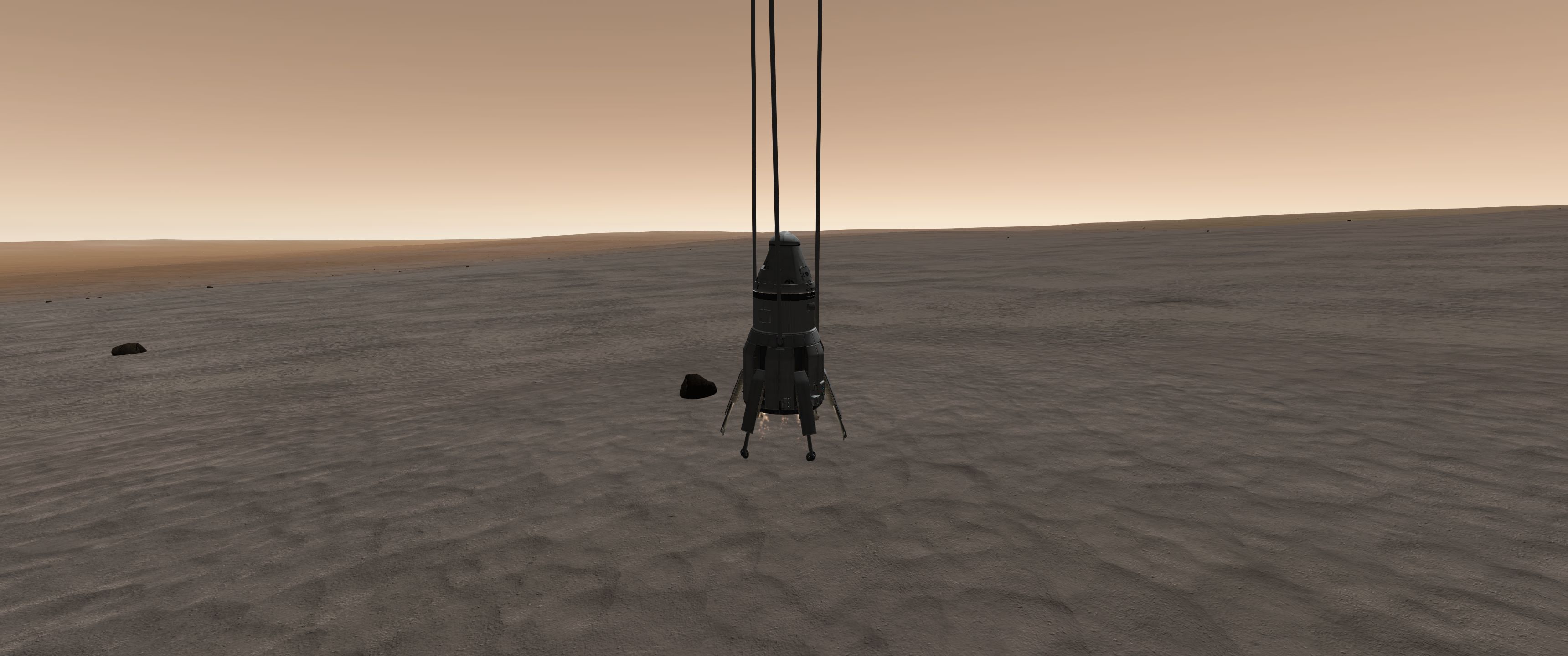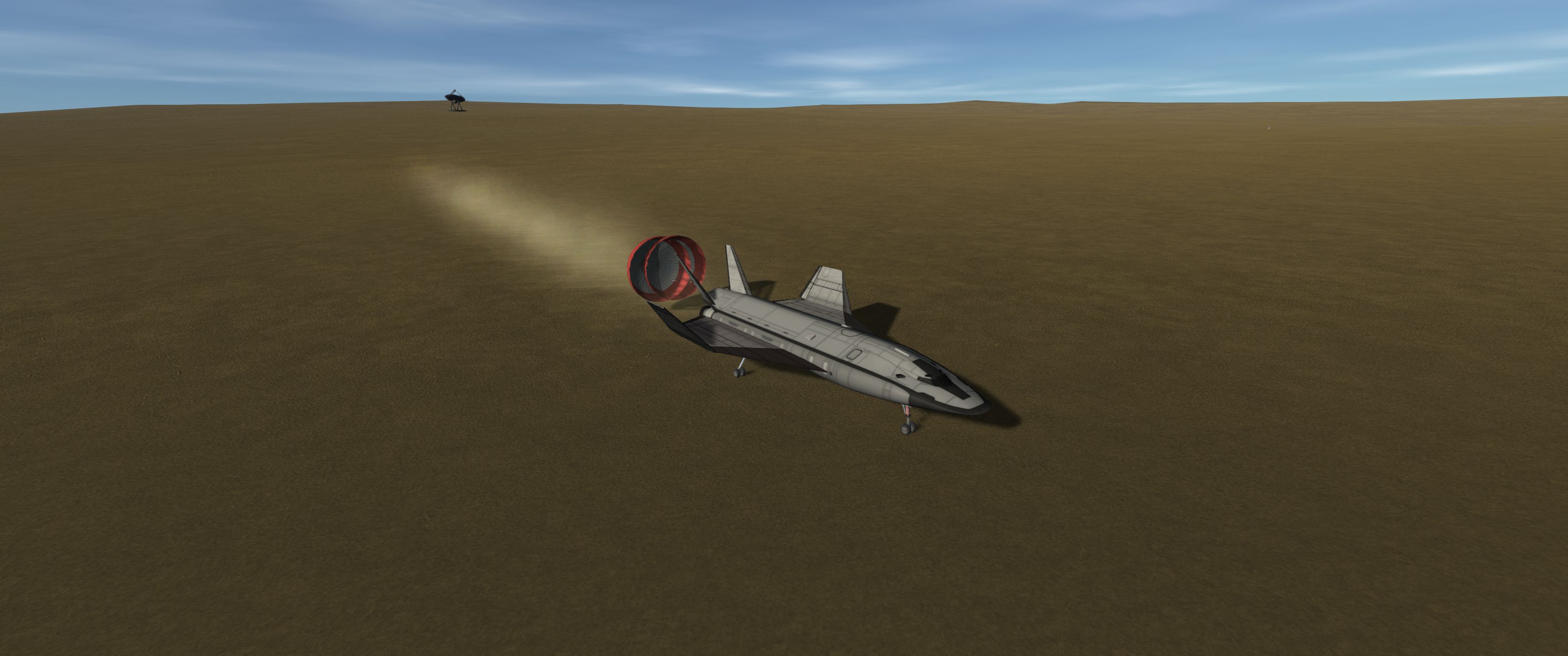 >>789037 Входим в атмосферу. Она высоченная, 160 км, но достаточно разреженная, 0.1 атмосфер у поверхности. Тормозимся надувным щитом, выпускаем парашюты (в RealChute всё ещё не решена проблема пересечения разных парашютов одного крафта, хотя вроде сделать это не так сложно), откидываем щит, показываем раскладную коляску, висящую внутри. Вблизи поверхности скорость спуска около 15 м/с, что всё ещё многовато. За 80 метров до земли запускаем посадочные твердотопливные петарды, которые замедляют скорость до комфортных 5 м/с. Ура, мягкая посадка.