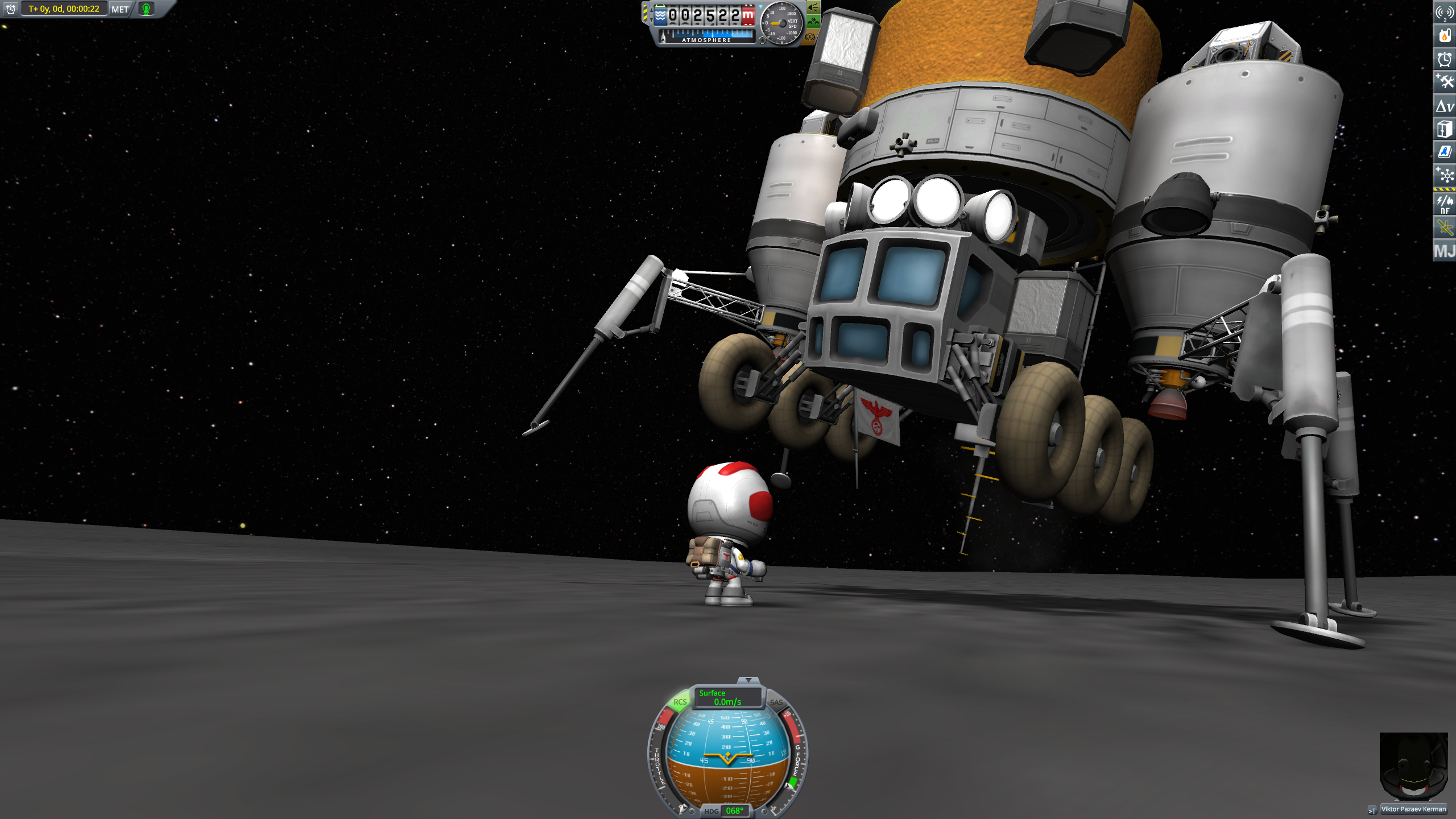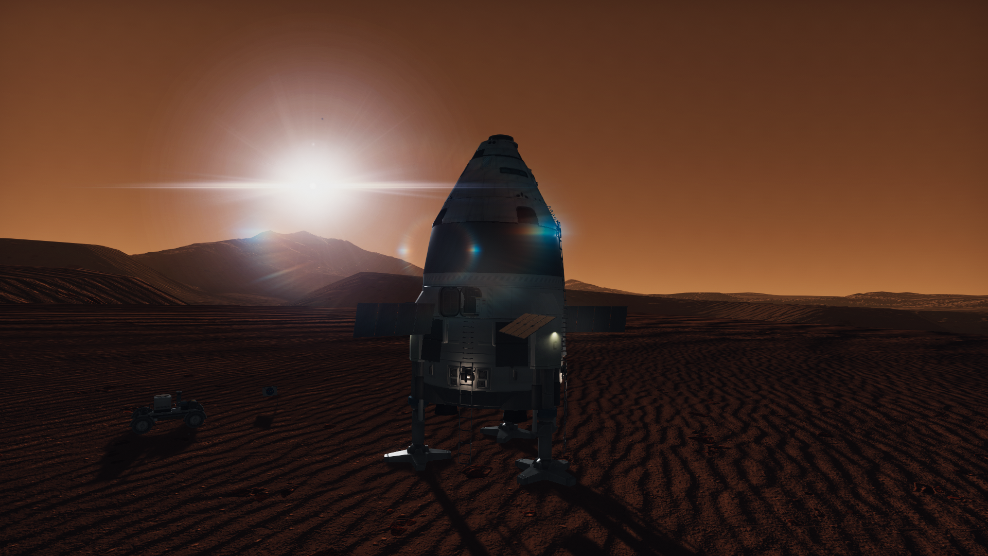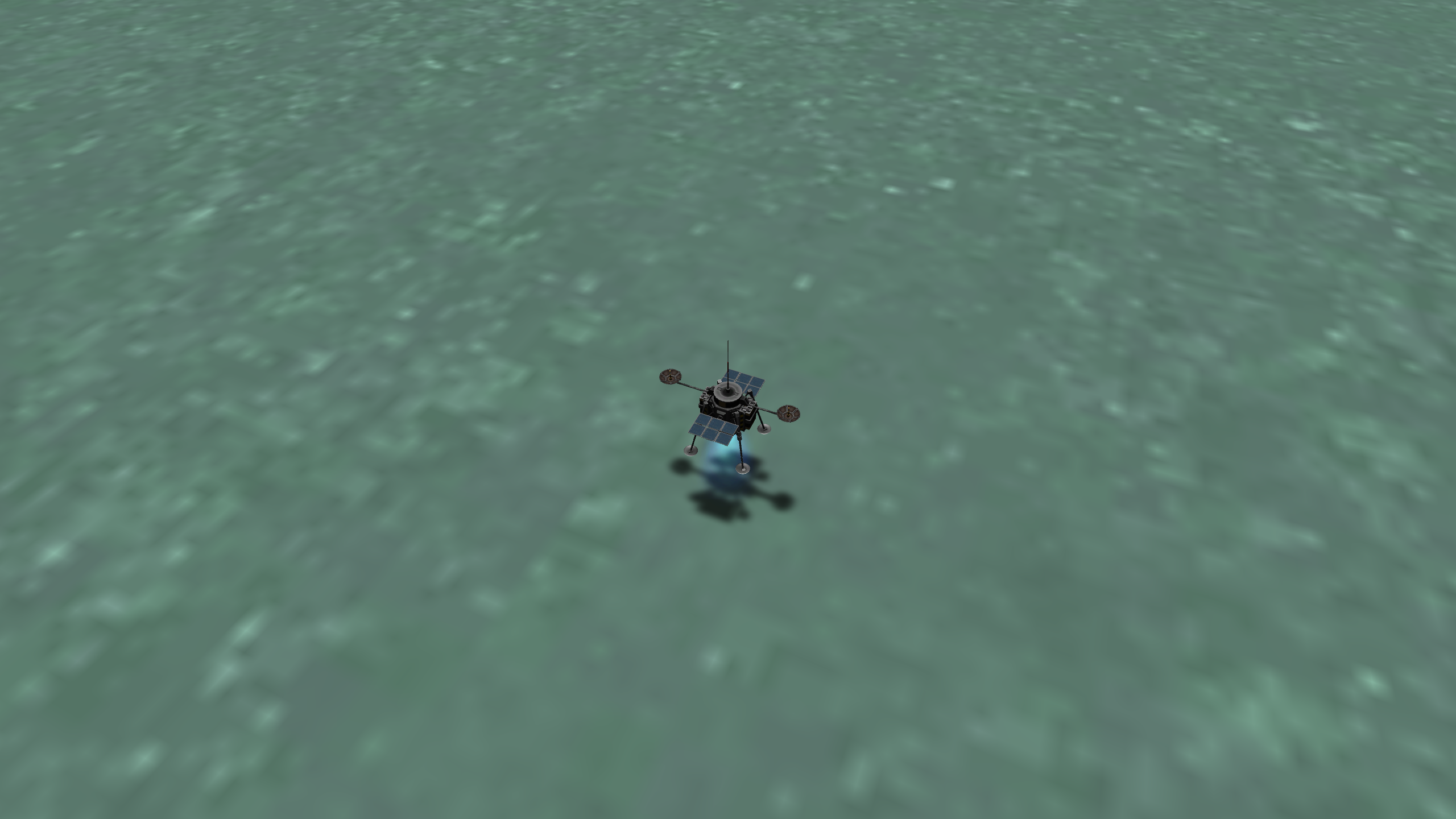 >>789037 Входим в атмосферу. Она высоченная, 160 км, но достаточно разреженная, 0.1 атмосфер у поверхности. Тормозимся надувным щитом, выпускаем парашюты (в RealChute всё ещё не решена проблема пересечения разных парашютов одного крафта, хотя вроде сделать это не так сложно), откидываем щит, показываем раскладную коляску, висящую внутри. Вблизи поверхности скорость спуска около 15 м/с, что всё ещё многовато. За 80 метров до земли запускаем посадочные твердотопливные петарды, которые замедляют скорость до комфортных 5 м/с. Ура, мягкая посадка.