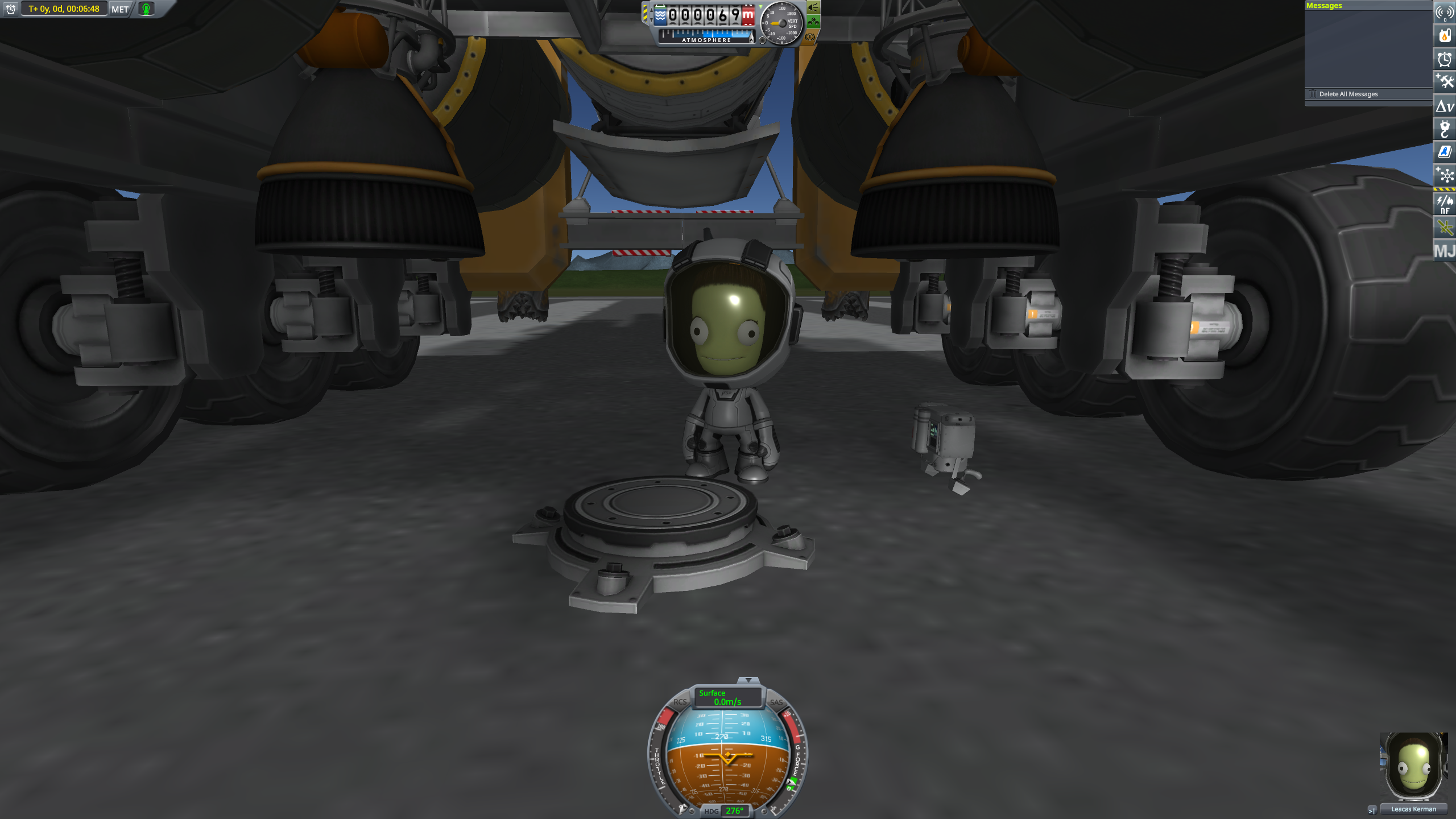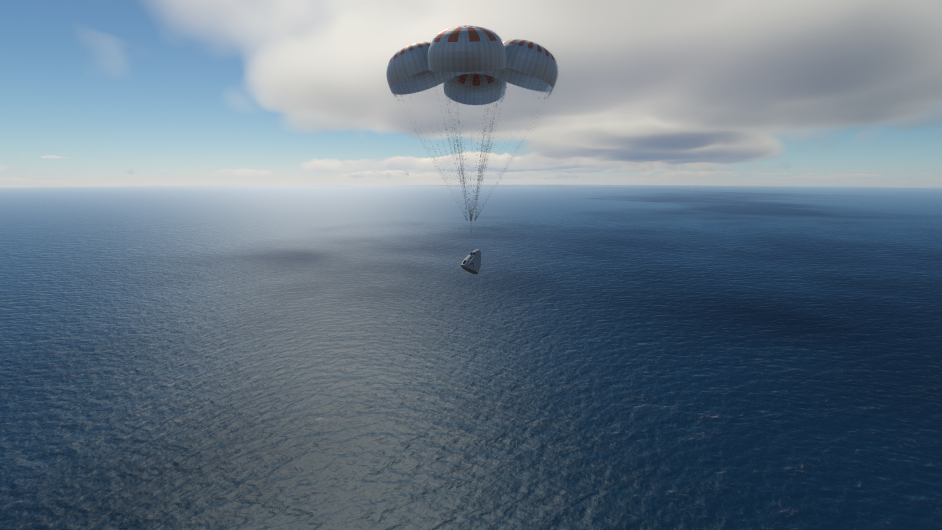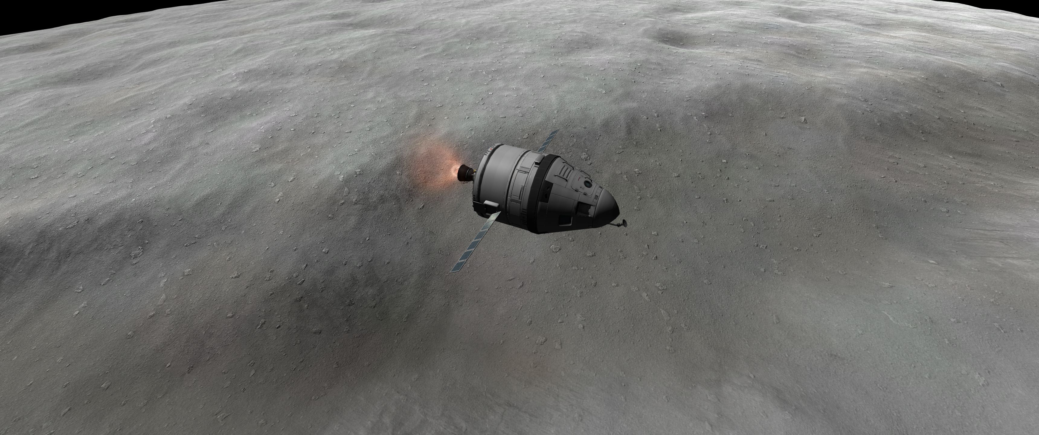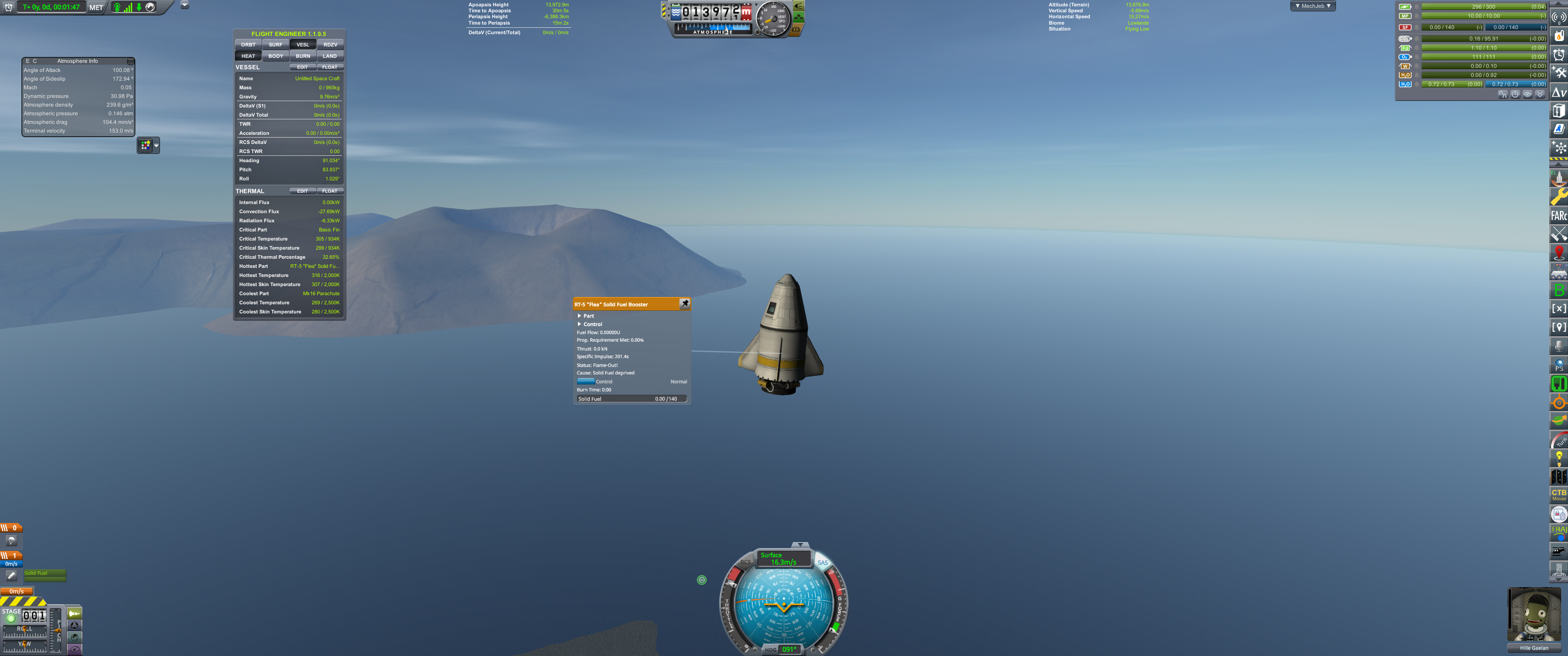 >>789037 Входим в атмосферу. Она высоченная, 160 км, но достаточно разреженная, 0.1 атмосфер у поверхности. Тормозимся надувным щитом, выпускаем парашюты (в RealChute всё ещё не решена проблема пересечения разных парашютов одного крафта, хотя вроде сделать это не так сложно), откидываем щит, показываем раскладную коляску, висящую внутри. Вблизи поверхности скорость спуска около 15 м/с, что всё ещё многовато. За 80 метров до земли запускаем посадочные твердотопливные петарды, которые замедляют скорость до комфортных 5 м/с. Ура, мягкая посадка.