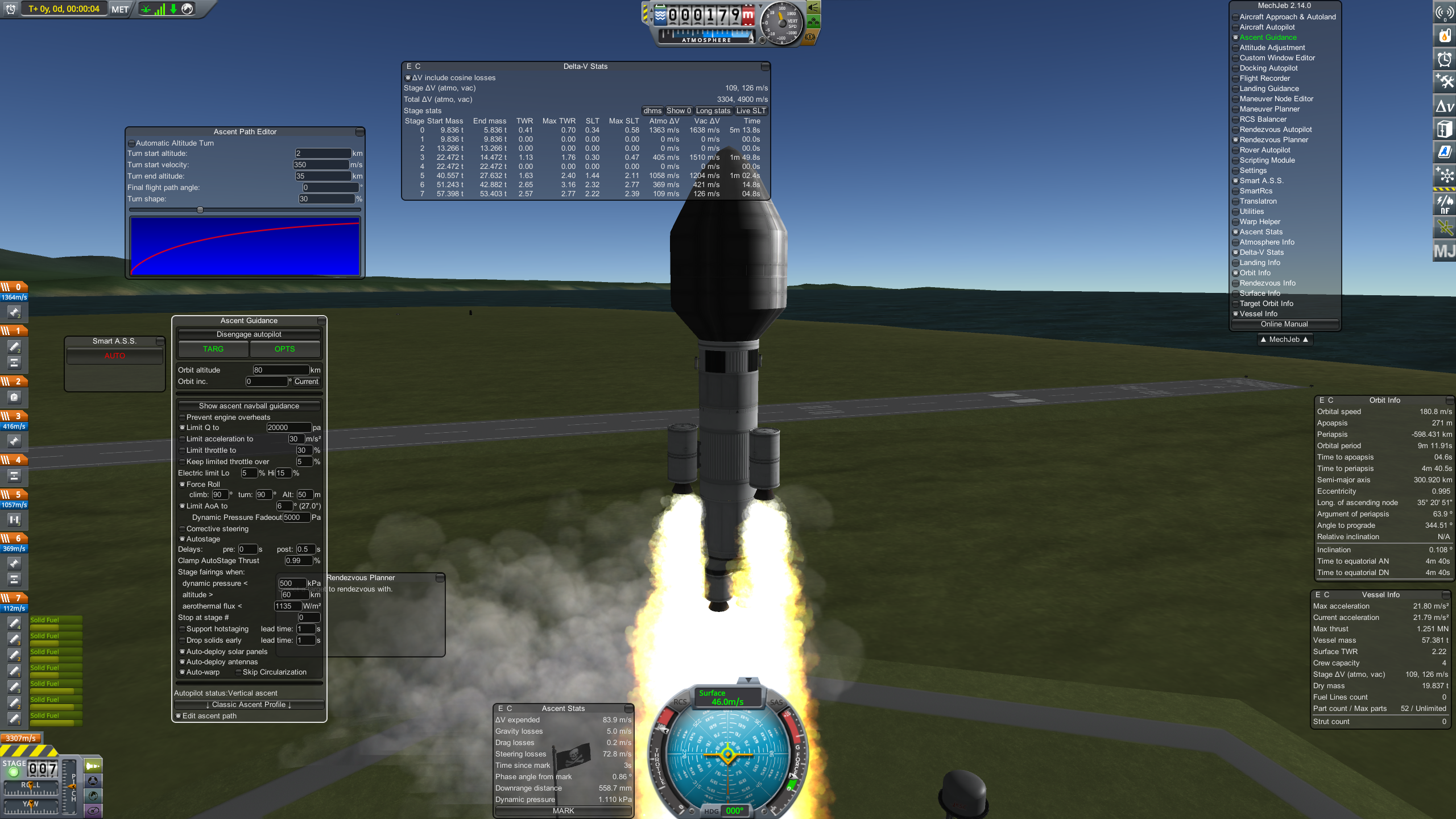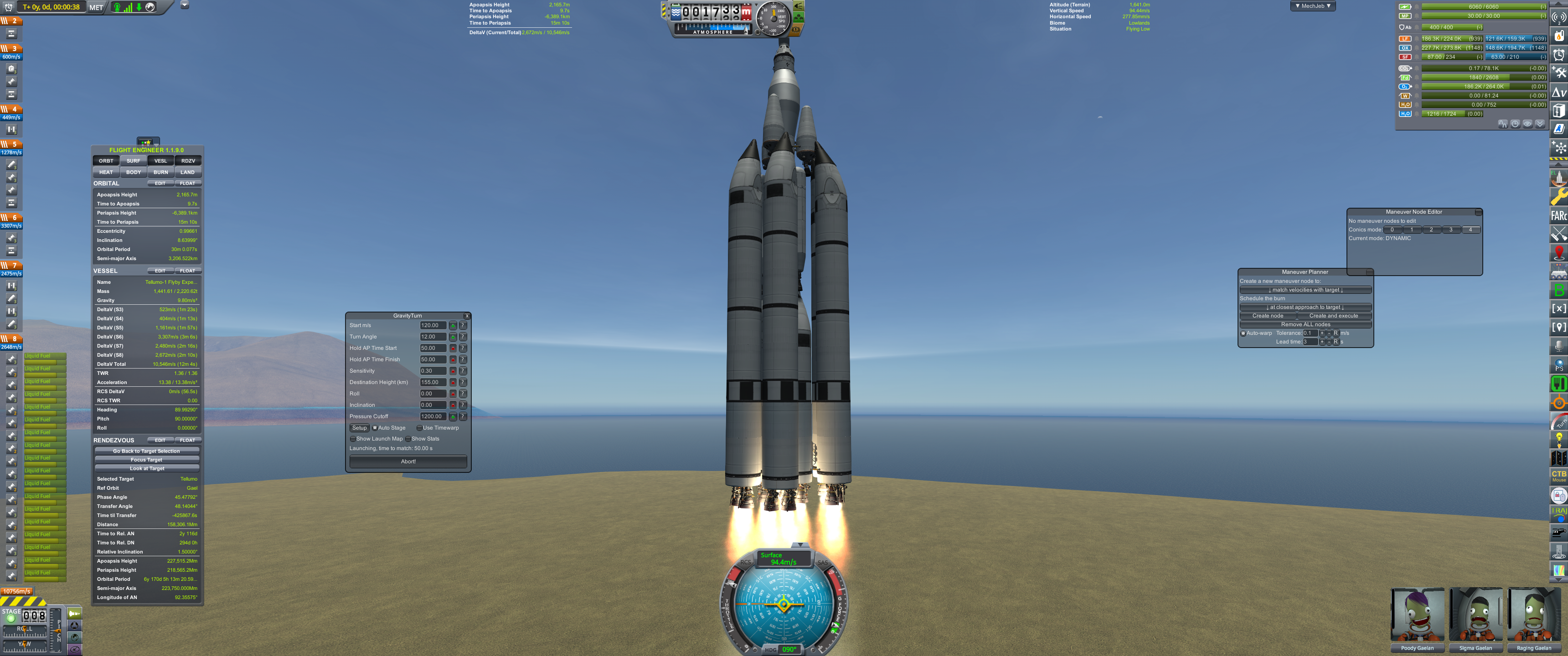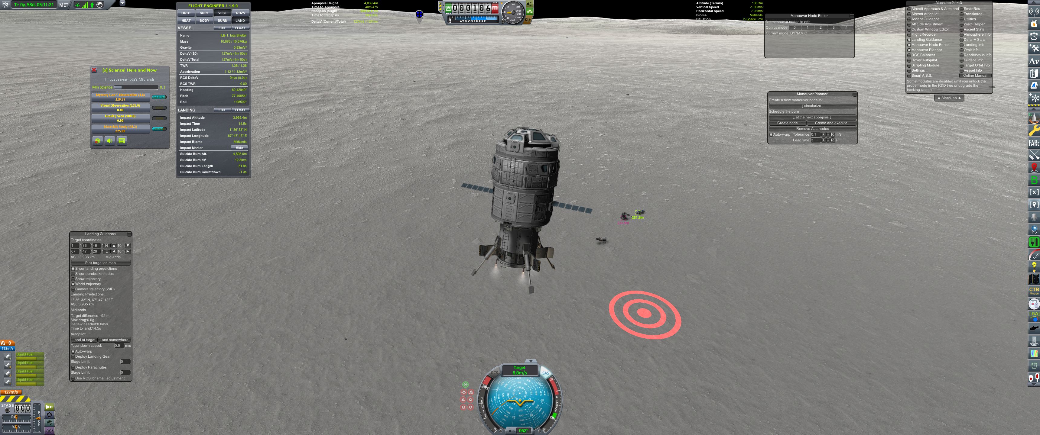 Накопили науки, пришло время побывать на спутниках. Ближний спутник - Йота(Iota). Выход на траекторию полёта - 3100 м/с с экваториальной орбиты или примерно 4400 м/с с наших 8.6 градусов в самом неудачном случае. Разница большая. Применяем немножко математики: фазовый угол для разгонного манёвра - 114 градусов (показывает инженер), выход с космодрома на опорную орбиту - 90 градусов взлетаю Gravity Turn, рассчитываю и исполняю крупные маневры Мехджебом, фу лах не тру. Значит, если стартовать, когда фазовый угол между космодромом и Йотой 204 градуса, то мы попадём примерно в нужную плоскость.