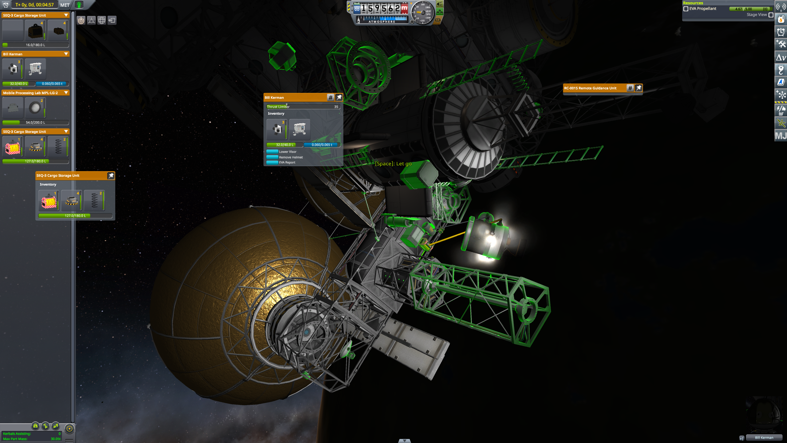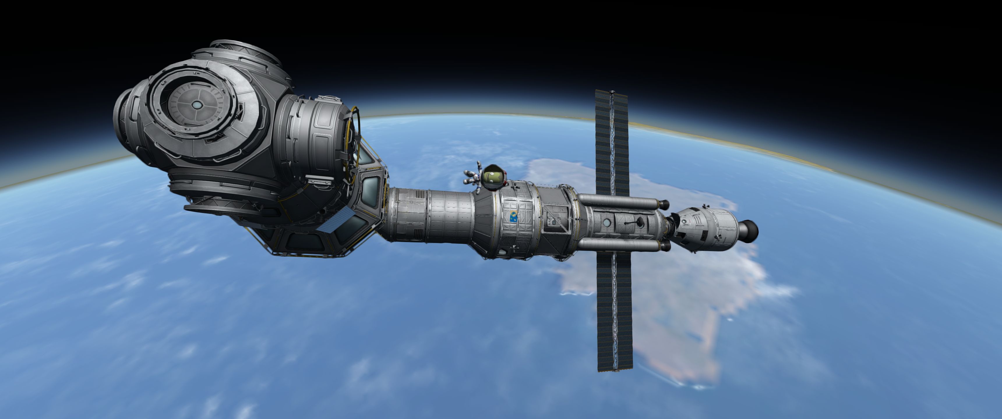 Тем временем, разворачиваем строительство орбитальной станции. Подымаем базовый модуль: двигательная установка, командный отсек, базовый жилой отсек, небольшой склад припасов, разветвитель. Всё вместе 17 тонн. Подымаем на орбиту 350км. Засылаем туда первых огурцов на простеньком кораблике. Подымаем и стыкуем второй модуль, причал для кораблей. Красивая панорамная кабина, многосторонний узел стыковки, шлюз для выхода в открытый космос. Третий модуль будет жилой-складской, но под него пока большие обитаемые кабины не открыты. Четвертый модуль - научный, уже спроектирован в редакторе, но хотелось бы тоже открыть в ветке исследований ещё пару экспериментальных девайсов.