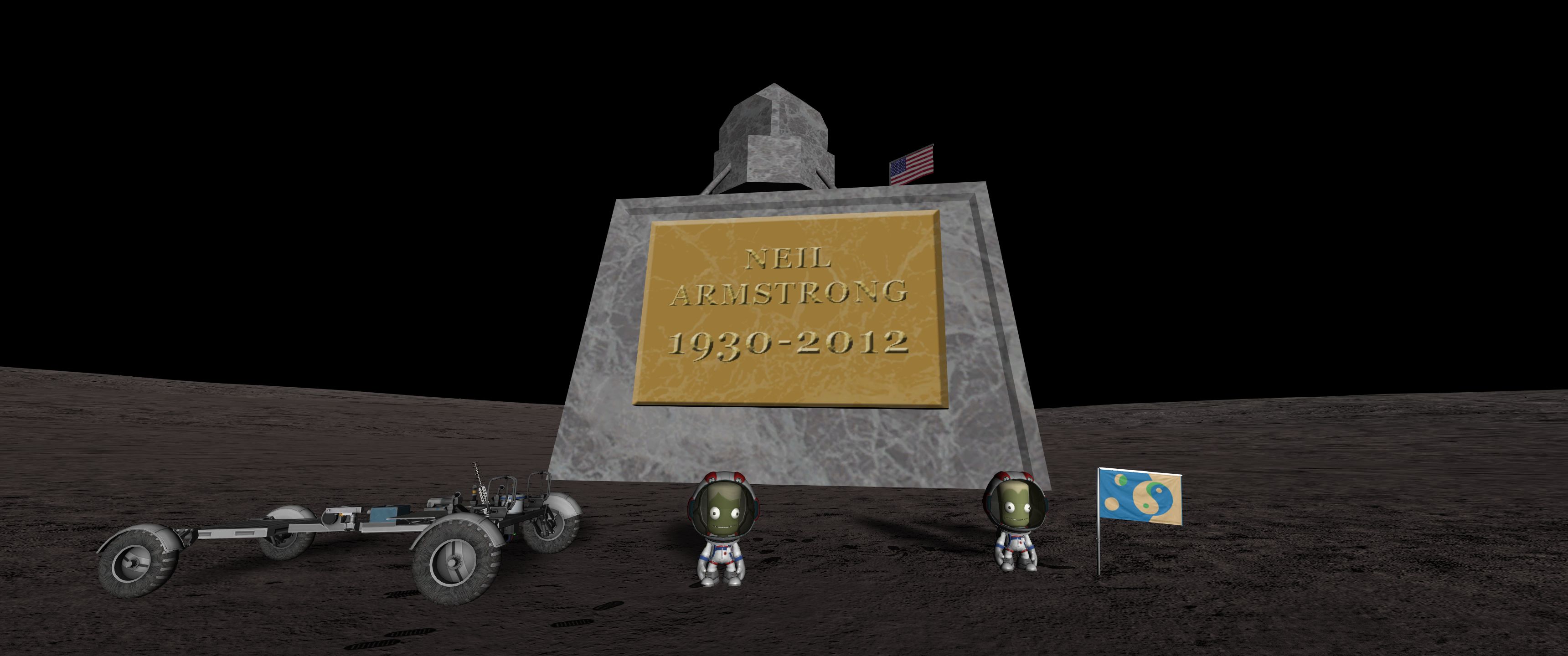 Отцепляем и раскладываем коляску, вылезаем из корабля, втыкаем флаг и фоткаемся. Потом пытаемся залезть обратно в корабль и матюгаемся на нестыкующиеся лестницы. Сука, опять забыл проверить перед полётом. Ну ладно, кое-как допрыгать можно. Возвращаемся на поверхность.
