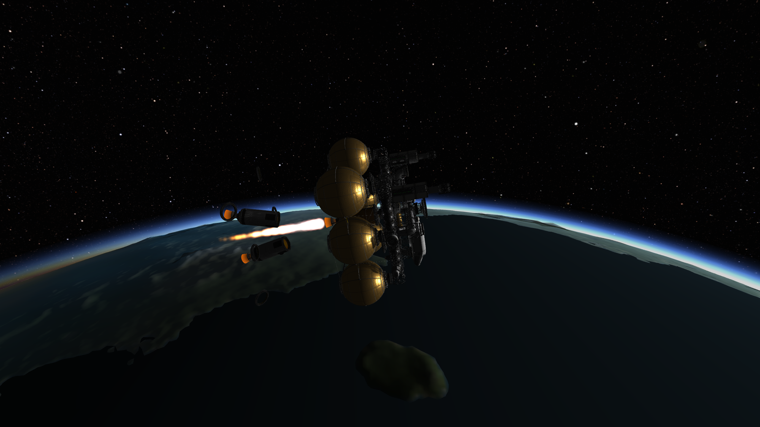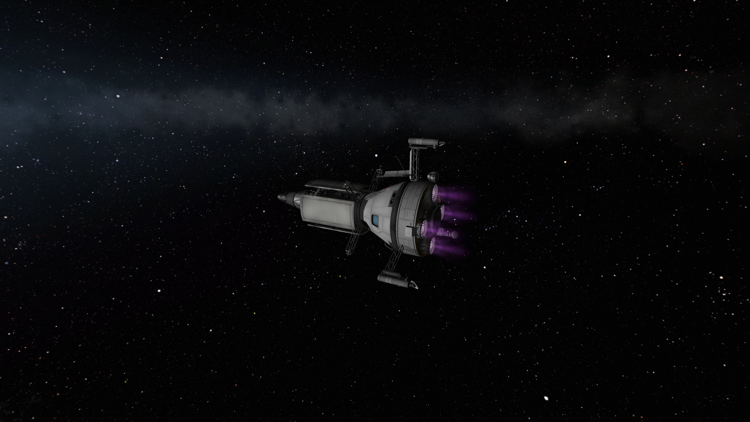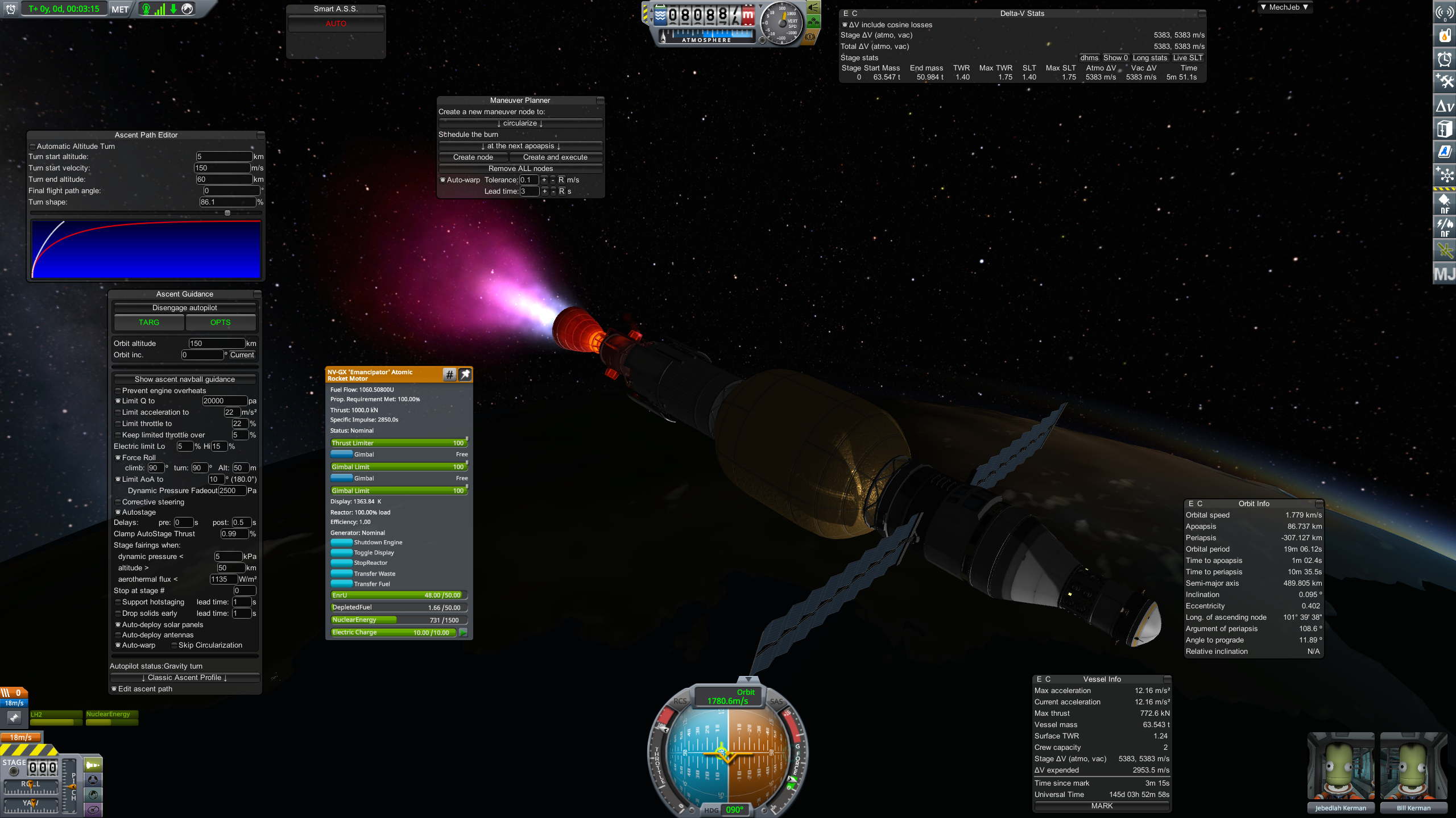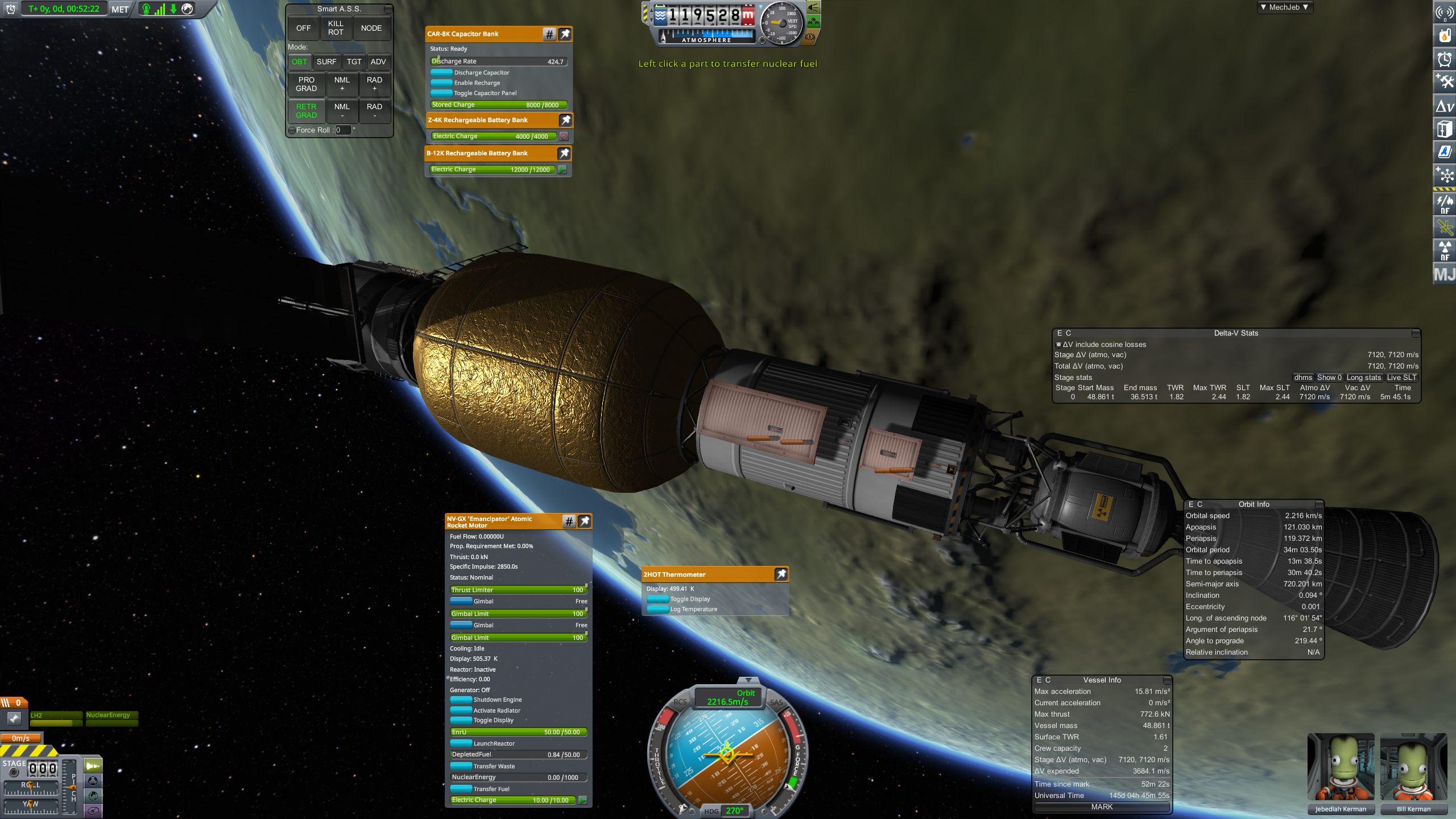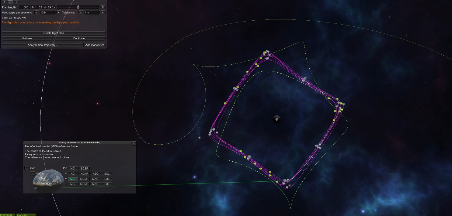 Дальше готовим разгонный маневр и постигаем искусство летать с удельной тягой 0.07. Маневр на 3500 м/с требует 70 минут прожига, что сравнимо с орбитальным периодом в 100 минут. Что же делать? Выход известен - разгоняемся за несколько витков. Можно это делать руками, а можно взять мод Node Splitter, который автоматически распилит маневр на витки с разбивкой либо по дельте в, либо по времени прожига, либо по высоте апоцентра или ещё как-то. Разбиваем на 5 прожигов по 10 минут и остаток. Между прожигами корректируем точку очередного маневра через Мехджеб -> Snap node to periapsis. Успешно разогнались, выкидываем пустые боковые баки. Интересная деталь - маленькие сопла для прогона рабочего тела тоже пукают.