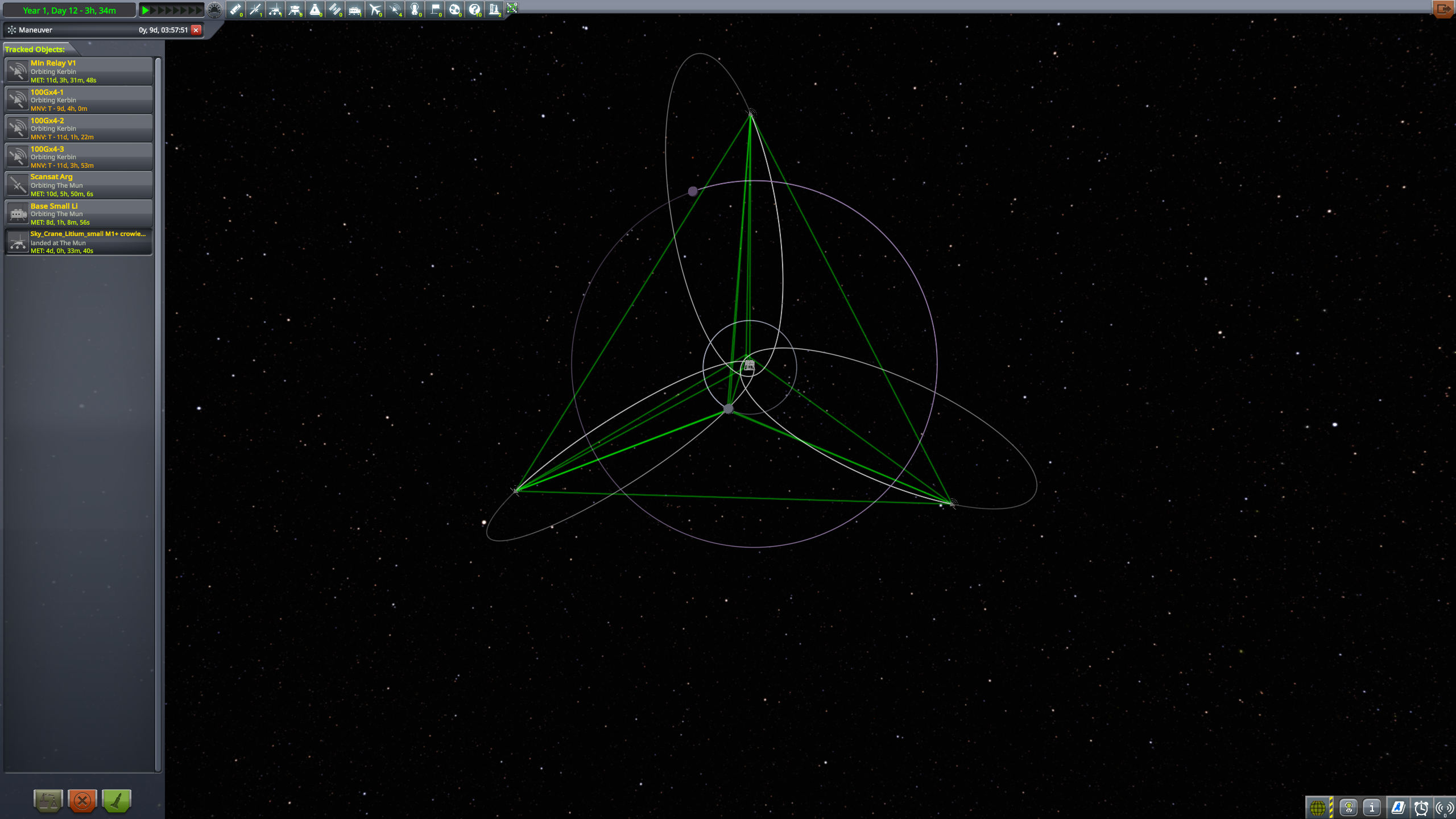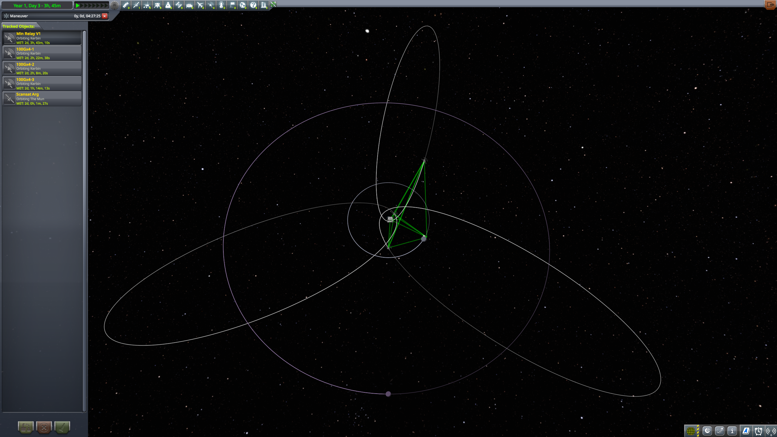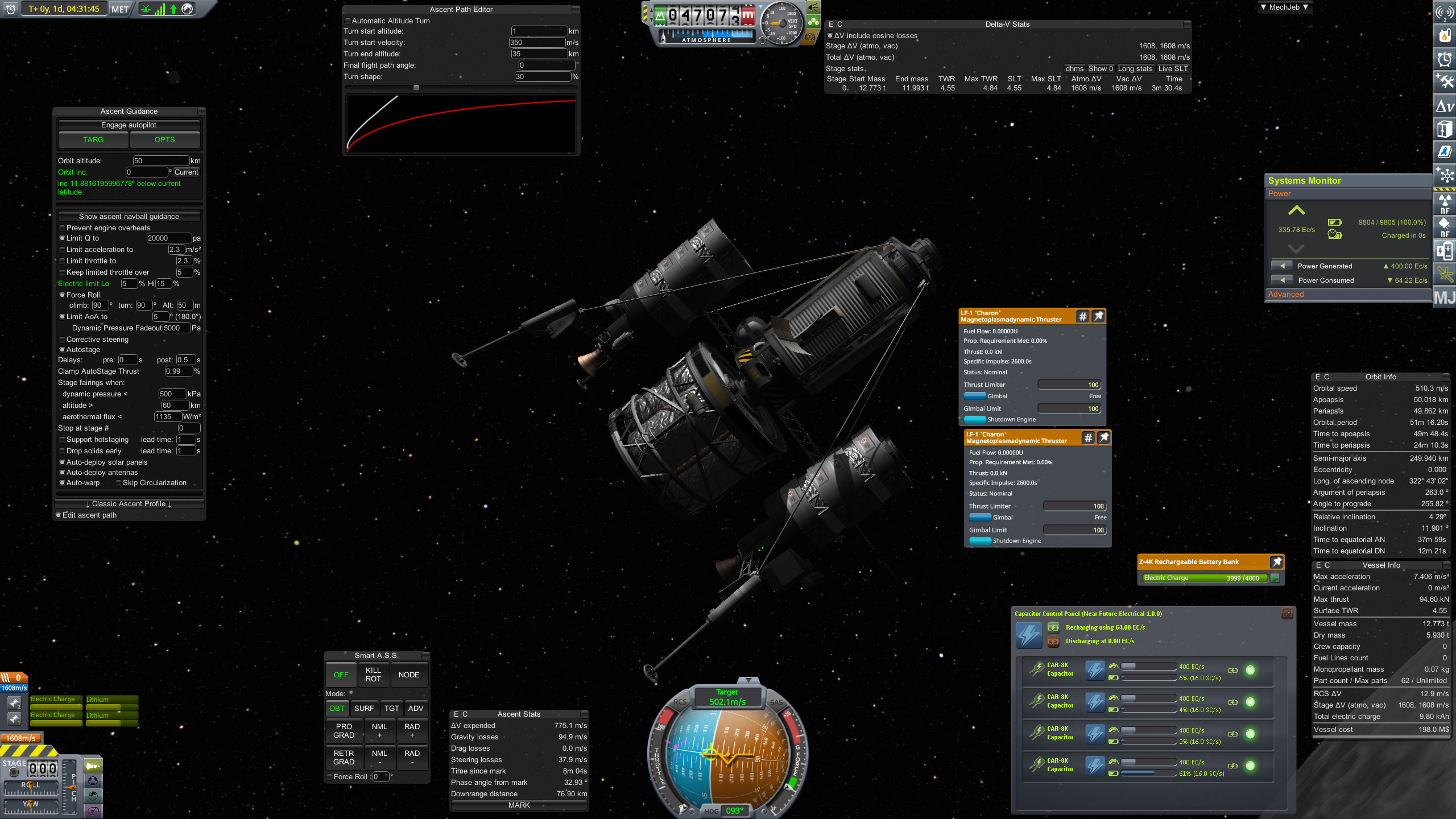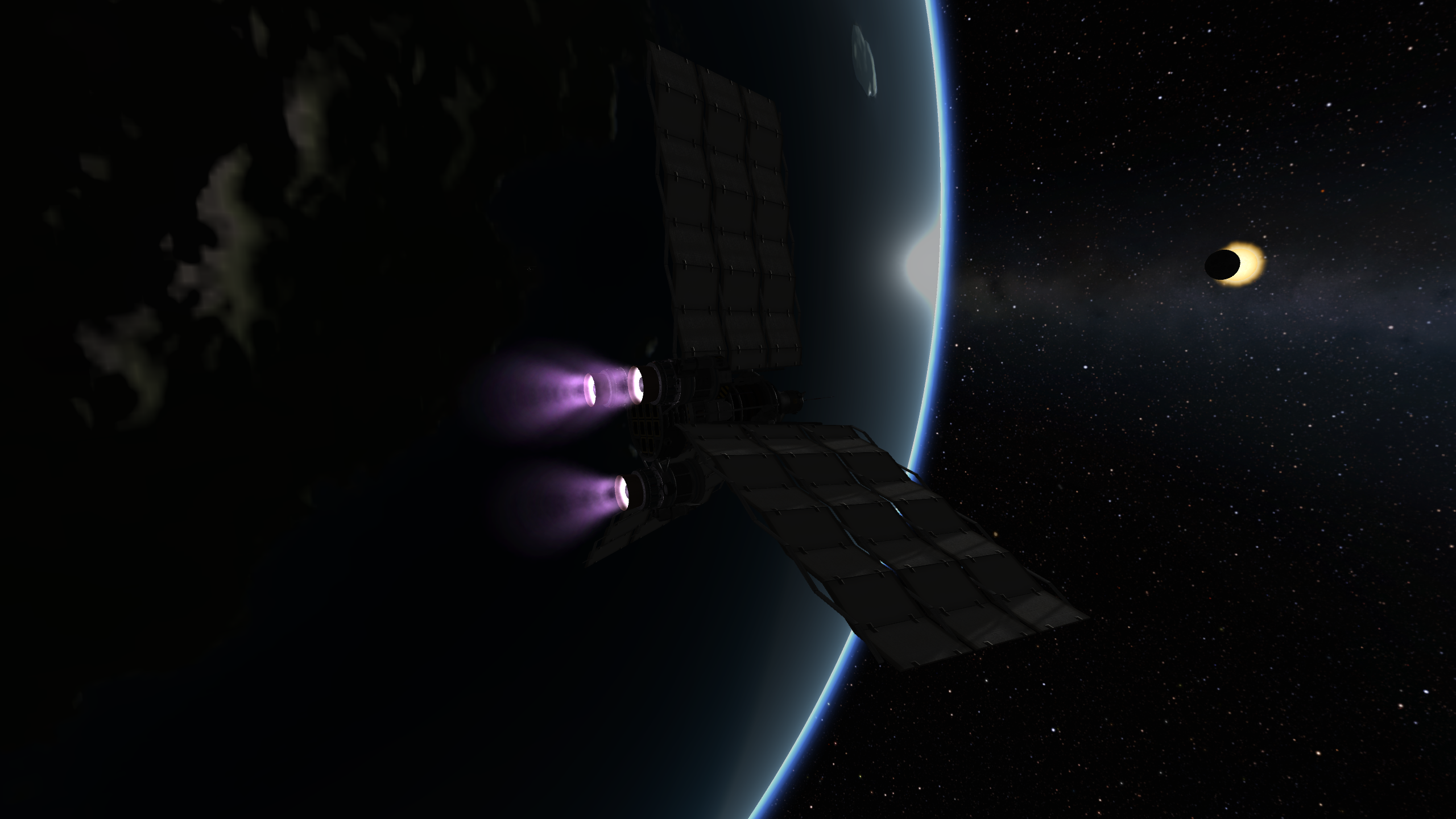 Дальше готовим разгонный маневр и постигаем искусство летать с удельной тягой 0.07. Маневр на 3500 м/с требует 70 минут прожига, что сравнимо с орбитальным периодом в 100 минут. Что же делать? Выход известен - разгоняемся за несколько витков. Можно это делать руками, а можно взять мод Node Splitter, который автоматически распилит маневр на витки с разбивкой либо по дельте в, либо по времени прожига, либо по высоте апоцентра или ещё как-то. Разбиваем на 5 прожигов по 10 минут и остаток. Между прожигами корректируем точку очередного маневра через Мехджеб -> Snap node to periapsis. Успешно разогнались, выкидываем пустые боковые баки. Интересная деталь - маленькие сопла для прогона рабочего тела тоже пукают.